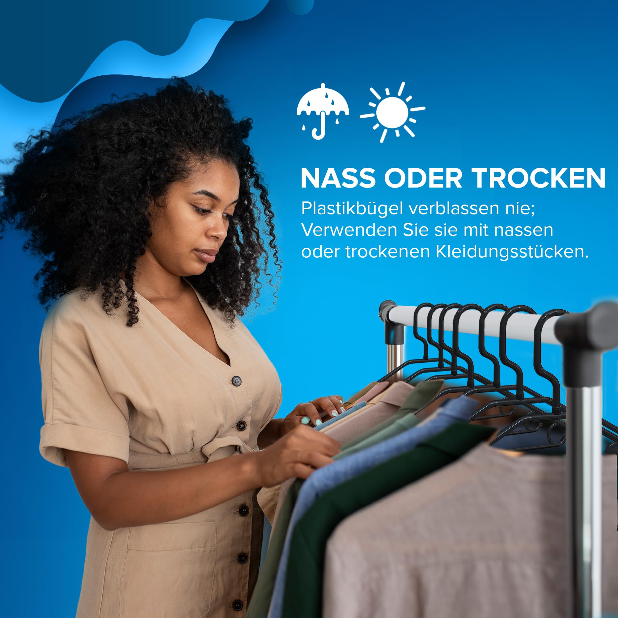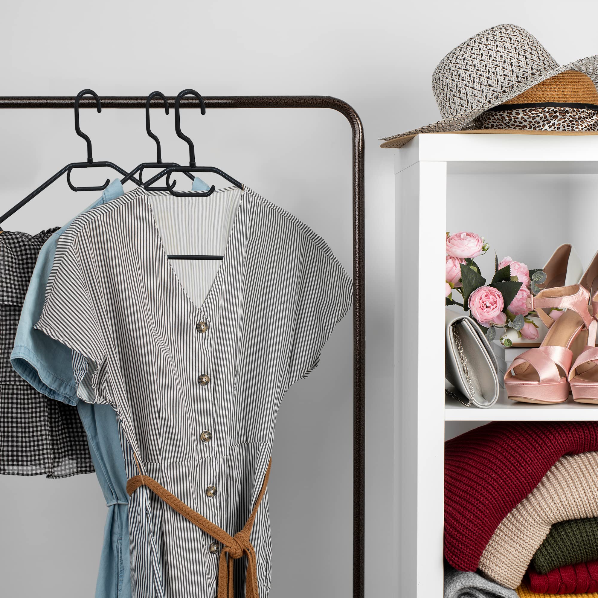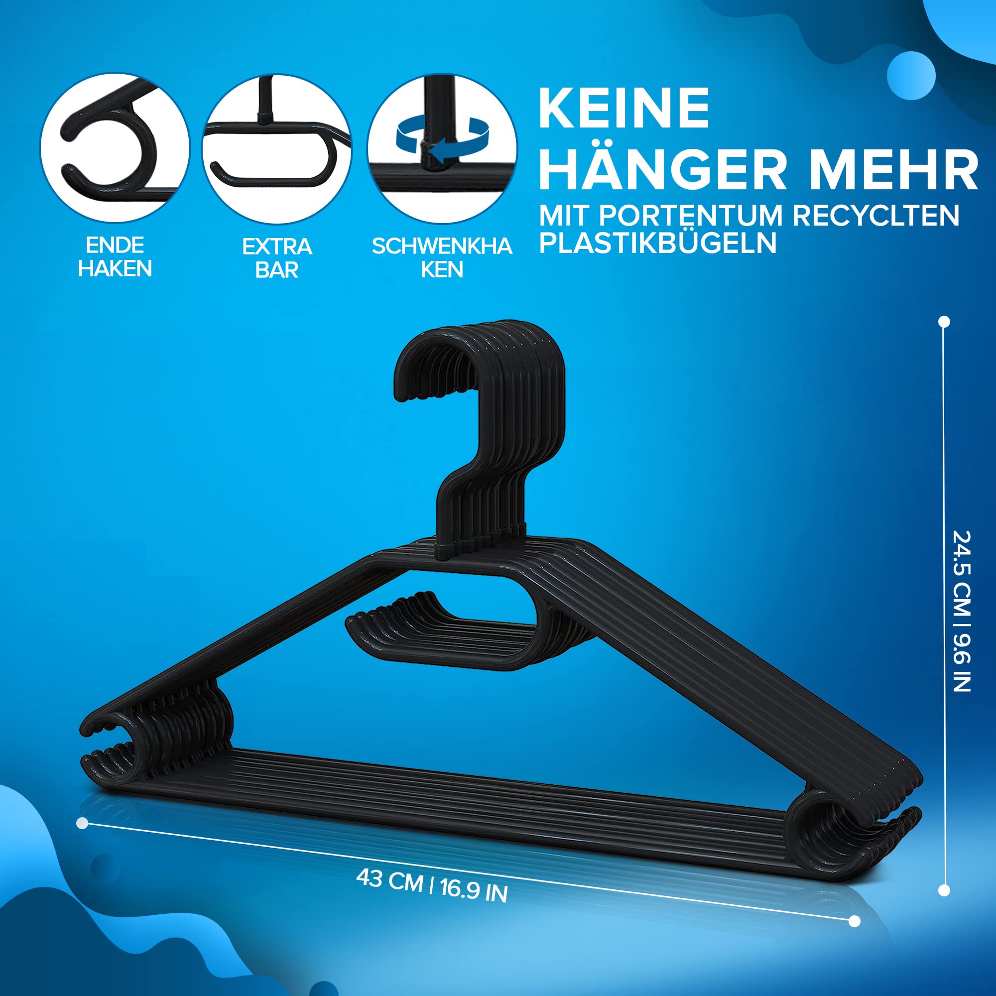 Suchen Sie eine praktische und ökologische Lösung, um Ihren Kleiderschrank zu organisieren? Entdecken Sie unsere Kleiderbügel aus 100 % recyceltem Kunststoff, die perfekt sind, um den Platz zu maximieren und Ihre Kleidung in perfektem Zustand zu halten. Dieses Set aus 50 schwarzen Kleiderbügeln verfügt über einen um 360 Grad drehbaren Haken, eine Hosenstange, einen Zubehörhalter und Endhaken zum Aufhängen von Kleidern, Röcken und Blusen. Jeder Kleiderbügel ist mit einem 360-Grad-Drehhaken ausgestattet, der den Zugriff auf Ihre Kleidung erleichtert und für mehr Ordnung in Ihrem Kleiderschrank sorgt. Die platzsparenden Kleiderbügel sind ideal, um Ordnung und Funktionalität in Ihrem Kleiderschrank zu gewährleisten. Der Hosenbügel ist perfekt, um Ihre Kleidung faltenfrei zu ordnen, während der Halter für Schals, Krawatten und andere Accessoires dafür sorgt, dass Sie alles griffbereit und an seinem Platz haben. Aus recyceltem Kunststoff hergestellt und recycelbar, sind diese Hosenbügel eine nachhaltige und umweltfreundliche Option - optimieren Sie Ihren Platz und schonen Sie den Planeten mit unseren Kleiderbügeln!