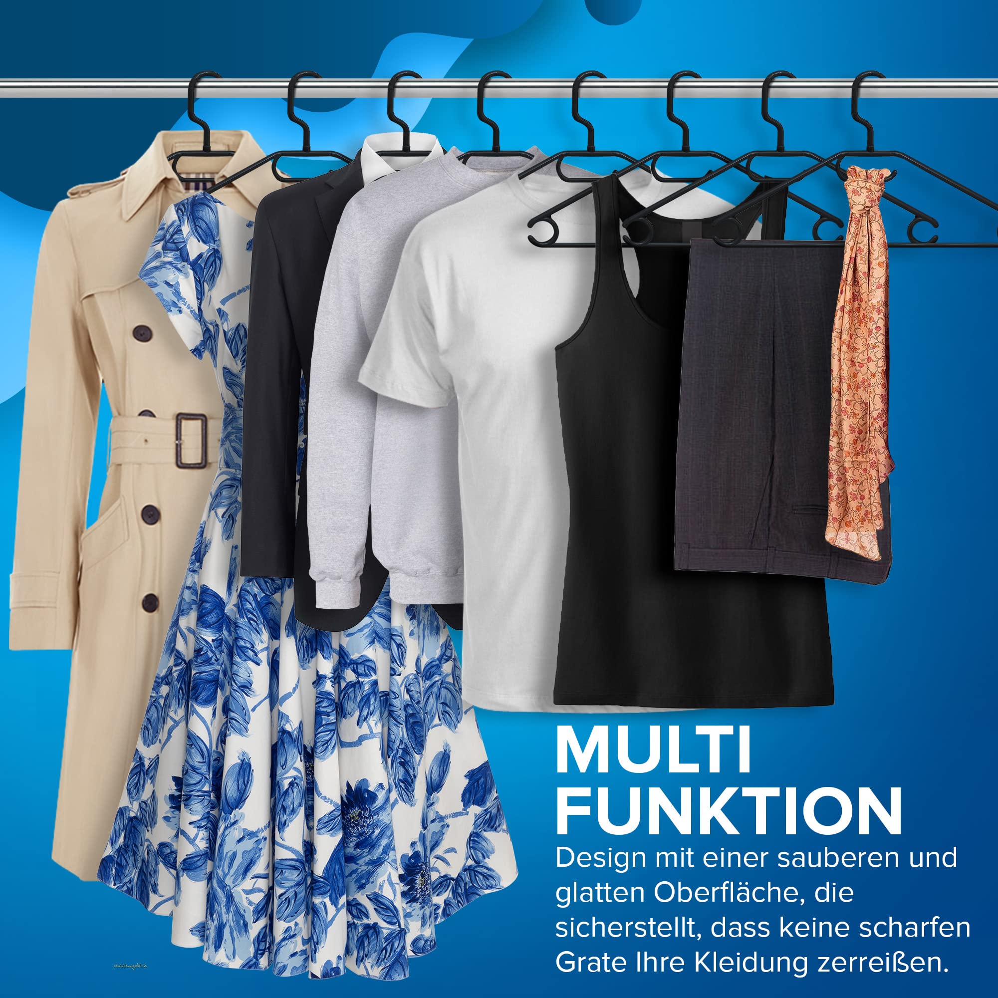 Den Kleiderschrank organisiert zu halten, ist einfach mit diesem Set aus 30 multifunktionalen schwarzen Kunststoff-Kleiderbügeln. Ihr platzsparendes Profil hilft, die Kapazität des Schranks zu maximieren und hält die Kleidungsstücke in perfektem Zustand, indem es Falten verhindert.Jeder Kleiderbügel ist aus 100% recyceltem Kunststoff gefertigt und bietet eine langlebige sowie funktionale Lösung. Das intelligente Design umfasst einen um 360 Grad drehbaren Haken, der einen bequemen Zugriff auf die Kleidung aus jedem Winkel ermöglicht. Die integrierte zentrale Stange ist robust, ideal zum Aufhängen von Hosen oder Jeans.Zusätzlich verfügen sie über einen zentralen Halter, um Zubehör wie Krawatten, Gürtel oder Schals zu organisieren und sie sichtbar und zugänglich zu halten. Die Einkerbungen an den Enden des Bügels sind speziell dafür konzipiert, Kleidungsstücke mit Trägern wie Kleider, Tops oder Röcke zu halten und sicherzustellen, dass sie an ihrem Platz bleiben.