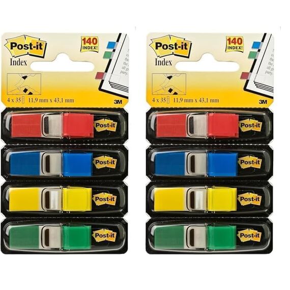 Post-it Index Flags schmal, Packung mit 4 Spendern, 35 Blatt pro Spender, 11, 9 mm x 43, 2 mm, Gelb, Rot, Grün, Blau - Zum Markieren, Hervorheben oder Farbcodieren wichtiger Informationen