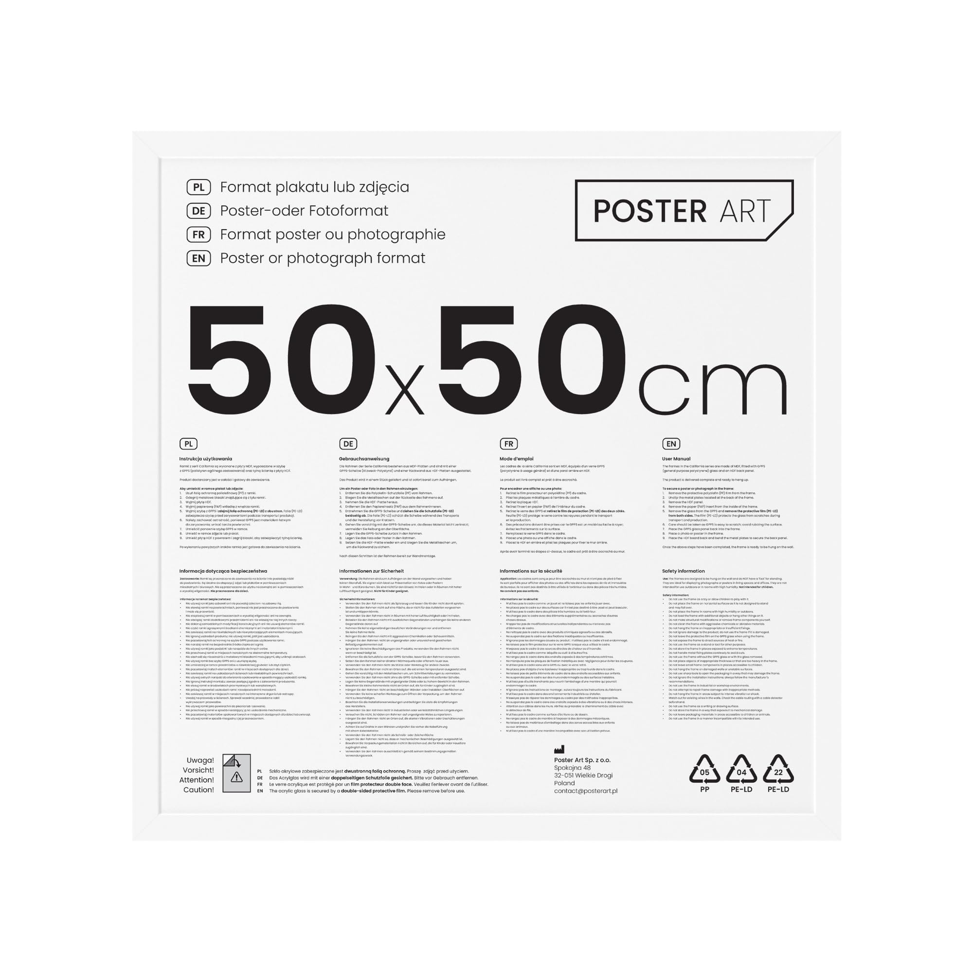 POSTER ART Bilderrahmen 50x50 cm Weiss - Bilderrahmen Quadratisch zum Aufhängen aus MDF und Acrylglas - California Wand Rahmen Moderner Fotorahmen