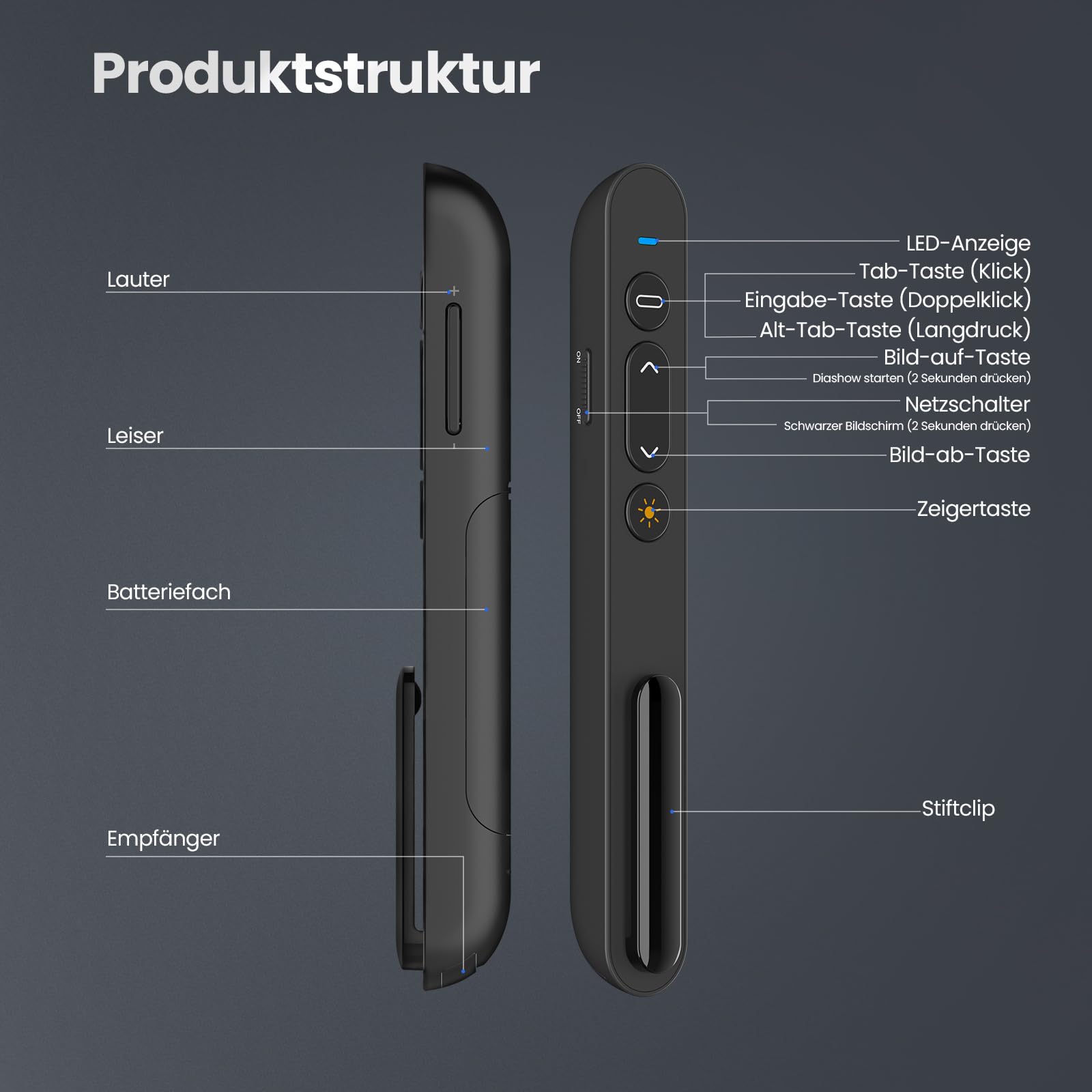 • 【Was Sie erhalten & Zuverlässige Unterstützung】 Im Paket enthalten: 1×Präsenter mit integriertem USB-C-Empfänger; 1× Bedienungsanleitung. Wenn Sie Fragen haben, steht Ihnen unser professionelles Kundenserviceteam innerhalb von 24 Stunden zur Verfügung – vor, während und nach Ihrer Präsentation.