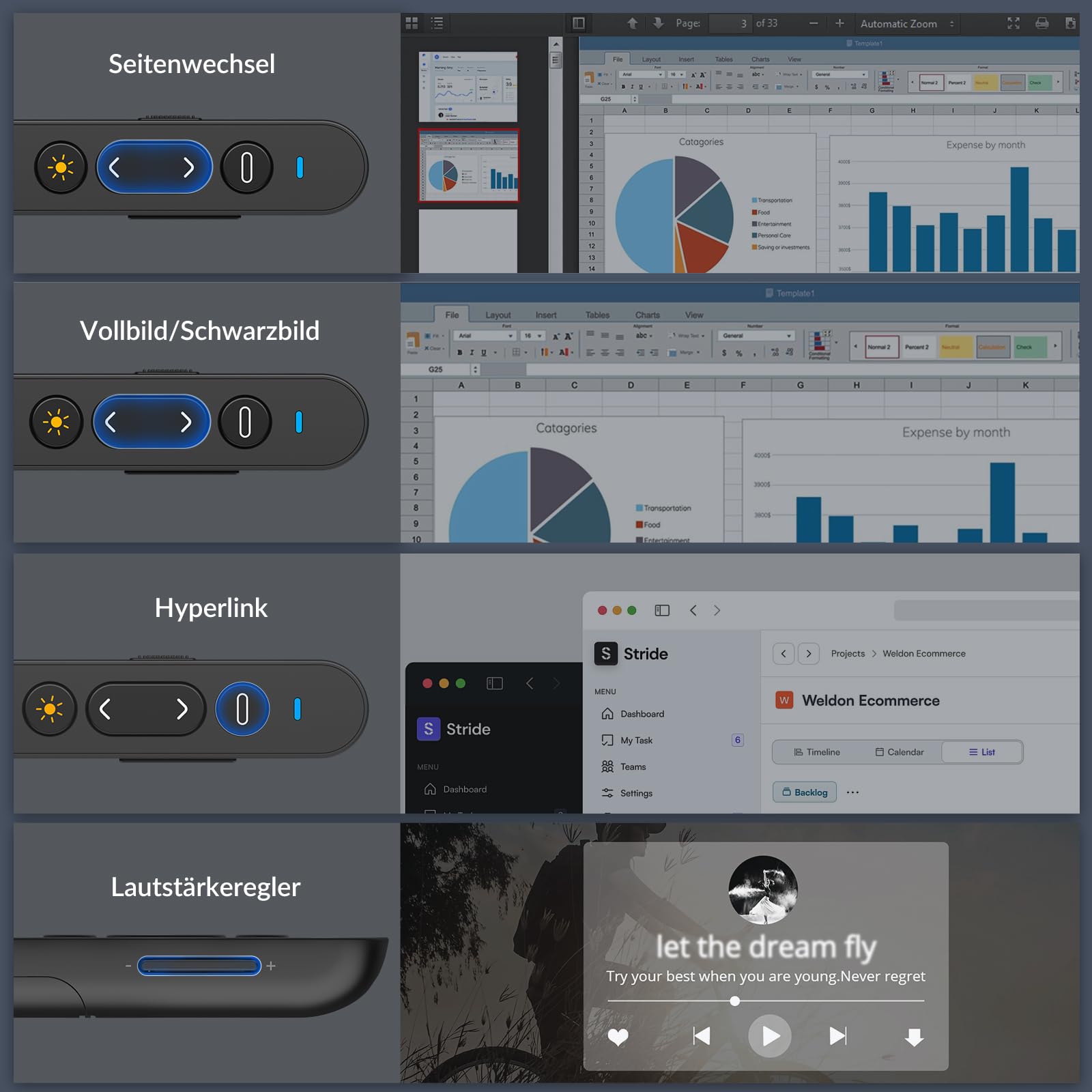 • 【Multifunktionaler Presenter】 Präsentationsfernbedienung mit integrierten mehreren Präsentationsfunktionen: Seitenwechsel, Diashow, Vollbild/Schwarzbild, Hyperlink und Lautstärkesteuerung. Sie behalten die volle Kontrolle über Ihre Präsentation und können sich ganz auf Ihre Rede konzentrieren. (Hinweis: Diese Powerpoint-Fernbedienung ist nicht für die Verwendung mit TV/LED/LCD-Bildschirmen geeignet.)