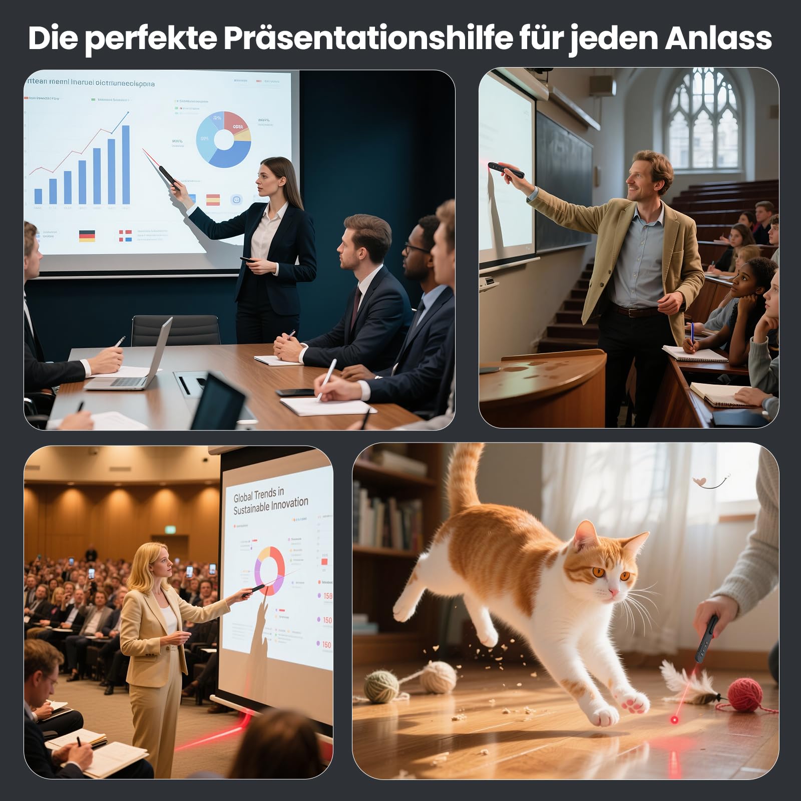 Der Pointer für Präsentationen verabschiedet sich von langweiligen Präsentationen! Plug-and-Play-Design: Stecken Sie den USB-C-Empfänger einfach in den USB-C-Anschluss Ihres Geräts und Sie sind bereit, die Show zu starten. So einfach zu bedienen. Es ist einfach, Ihre Präsentation in einen Publikums-Showstopper zu verwandeln. Merkmale: 1. Leuchtender roter drahtloser pointer 2. Bis zu 100 Meter Wireless Range 3. Ein-Touch-Diashow-Steuerelemente 4. Plug-and-Play-Wireless 5. Hohe Kompatibilität 6. Stylishes Aussehen 7. Kompakte und tragbare Bauweise USB-C-Empfänger kompatibel mit: Windows 2003, XP, Vista, Windows 7/8/10/11, Mac OS, Linux, Android Sicherheitswarnung: Seien Sie gewarnt, dass 2,4-GHz-Powerpoint Presenter kein Spielzeug sind; Sie sollten niemals unter keinen Umständen in die Augen von Menschen oder in ein Flugzeug geleitet werden. Der Präsentation Fernbedienung ist kein Spielzeug und sollte nicht von Personen unter 21 Jahren verwendet werden. Es ist illegal, den Strahl auf Flugobjekte, bewegliche Fahrzeuge sowie öffentliche oder private Strukturen zu richten. Unsachgemässe Benutzung kann gefährlich sein.
