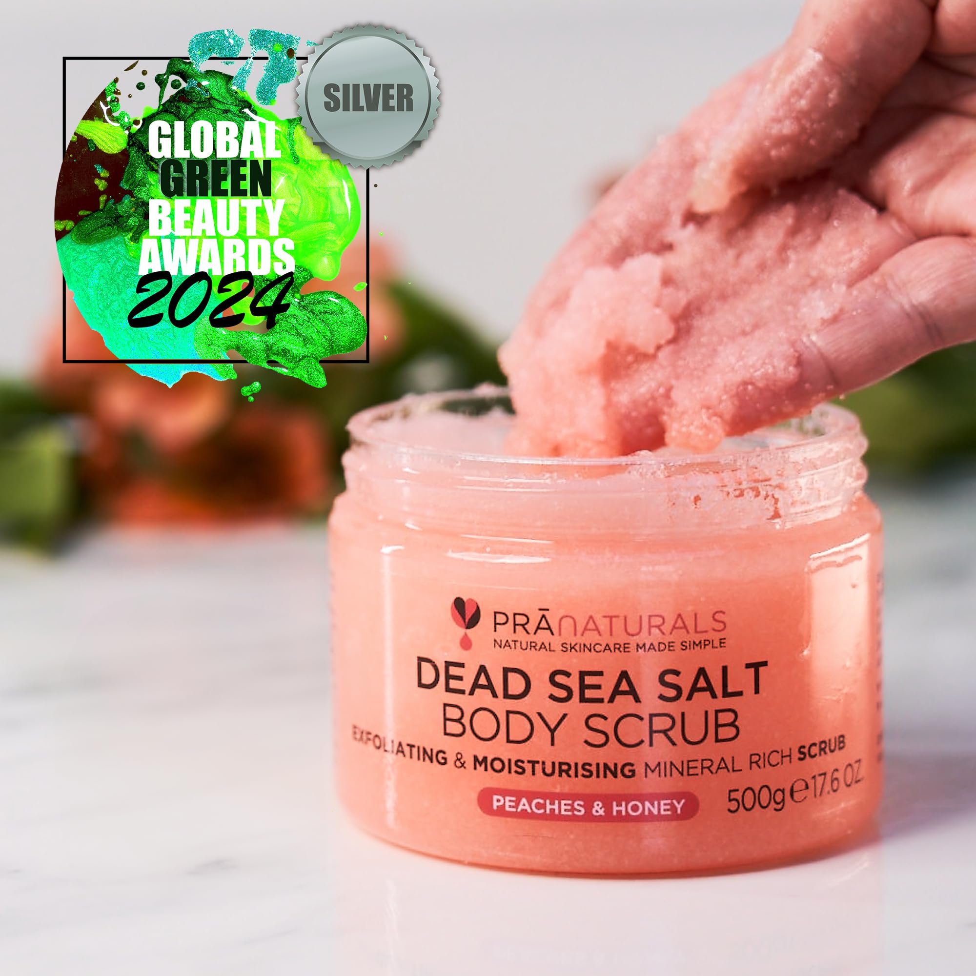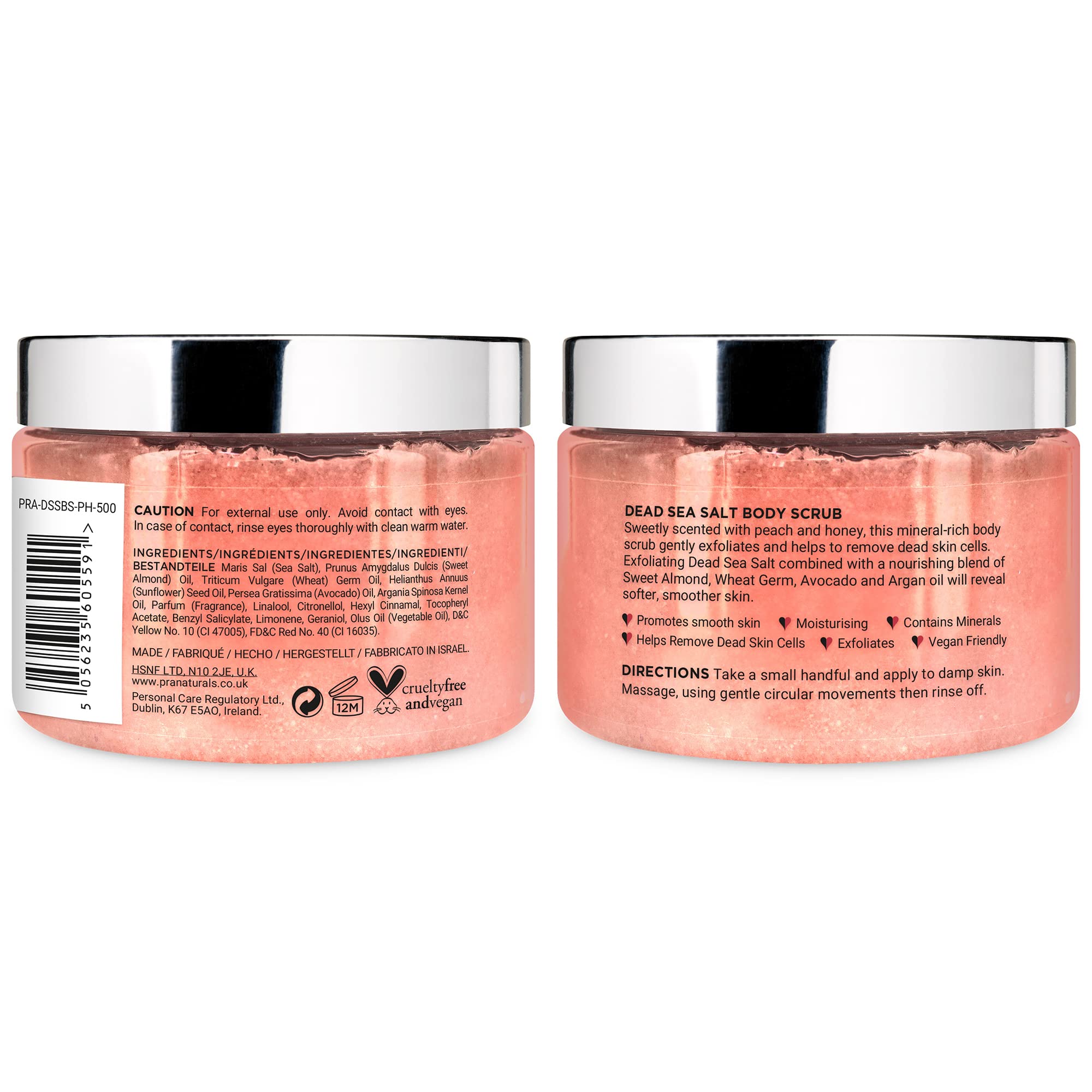 PraNaturals Körperpeeling mit Salz aus dem Toten Meer 500g – Feuchtigkeitsspendend & Pflegend, Natürliche Öle & Mineralstoffe, Vegan, Frei von Parabenen (Pfirsich und Honig)