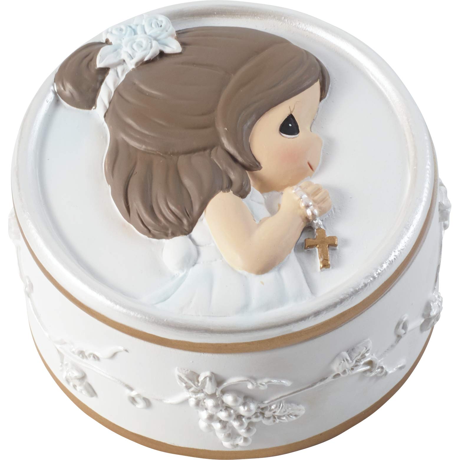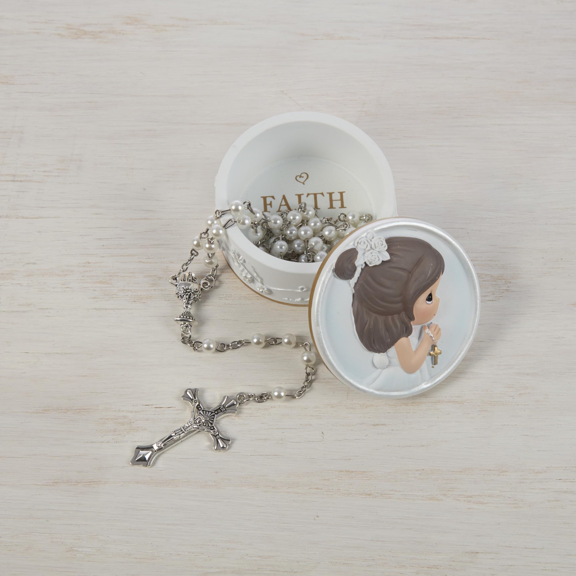 Die Eucharist zum ersten Mal zu nehmen, ist ein heiliger, fröhlicher Anlass, für den ein junger Kommunikant viel Zeit mit der Vorbereitung verbracht hat. Feiern Sie den Meilenstein mit einem durchdachten und nützlichen Geschenk, einer kunstvoll gestalteten Rosenkranz-Box mit einem traditionellen, weissen, perlmuttfarbenen Rosenkranz im Inneren. Mit einer jungen Dame, die auf dem Deckel betet, und einer erhebenden Botschaft im Inneren, wird es zu einer bleibenden Erinnerung an ihre erste heilige Kommunion. Diese Rosenkranz-Box hat eine süsse Grösse, um auf einem Nachttisch oder einem anderen leicht zugänglichen Ort zu sitzen, so dass sie sich immer wieder im Gebet oder wenn sie sich nur näher an Gott fühlen möchte. Das perfekte Geschenk für die Erstkommunion. Diese Rosenkranz-Box mit Rosenkranz ist ein Geschenk, das für ihr Leben geschätzt und verwendet wird. Verschenken Sie es an einen Erstkommunikanten, den Sie als Feier dieses Meilensteins kennen, oder für jeden religiösen Anlass. Durchmesser: ca. 5,7 cm. x 3,2 cm H. Diese Rosenkranz-Box ist aus kaltgegossenem Harz gefertigt und sorgfältig von Hand bemalt. Der Rosenkranz ist aus Metall und Kunststoff. Seit mehr als 40 Jahren widmet sich Precious Moments der Herstellung der Welt zu einem freundlichen Ort, indem Menschen helfen, Liebe zu teilen. Eine zeitlose Marke, Precious Moments hilft Ihnen, alltägliche Momente zu feiern und besondere Anlässe mit handbemalten Porzellan-Figuren und Ornamenten sowie zeitgenössischem Küchengeschirr, Wohnkultur, Baby-Geschenken und vielem mehr zu feiern. Eine einzigartige inspirierende Botschaft liegt im Mittelpunkt jedes Precious Moments Produkts, durchdacht entworfen, damit Sie Ihre besonderen Momente in Erinnerungen verwandeln können, die ein Leben lang halten.