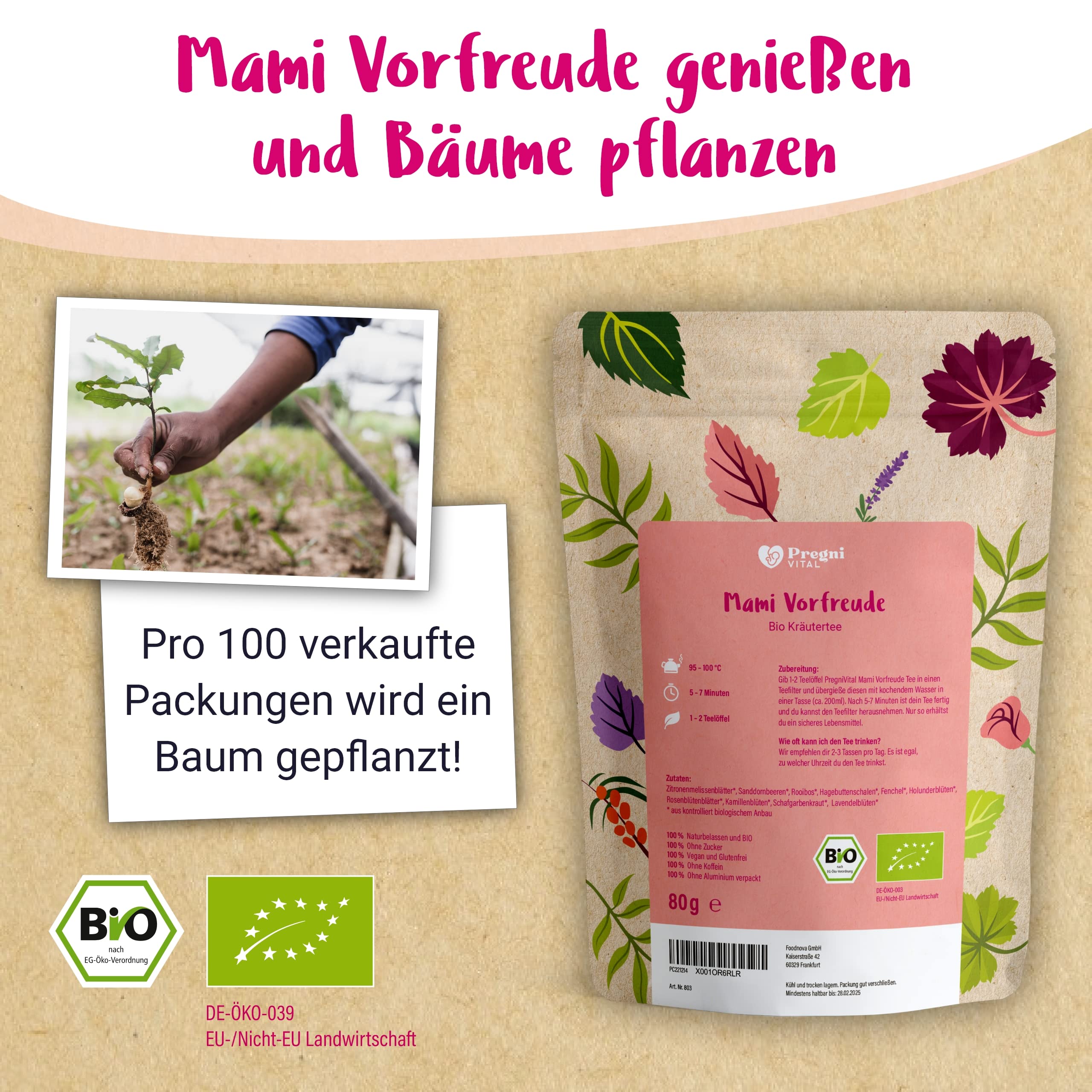 PregniVital® - Mami Vorfreude - BIO Schwangerschaftstee 1. 2. 3. Trimester - Beliebte Hebammen-Kräuter für die gesamte Schwangerschaft - auch perfekt als-Geschenk - 80g