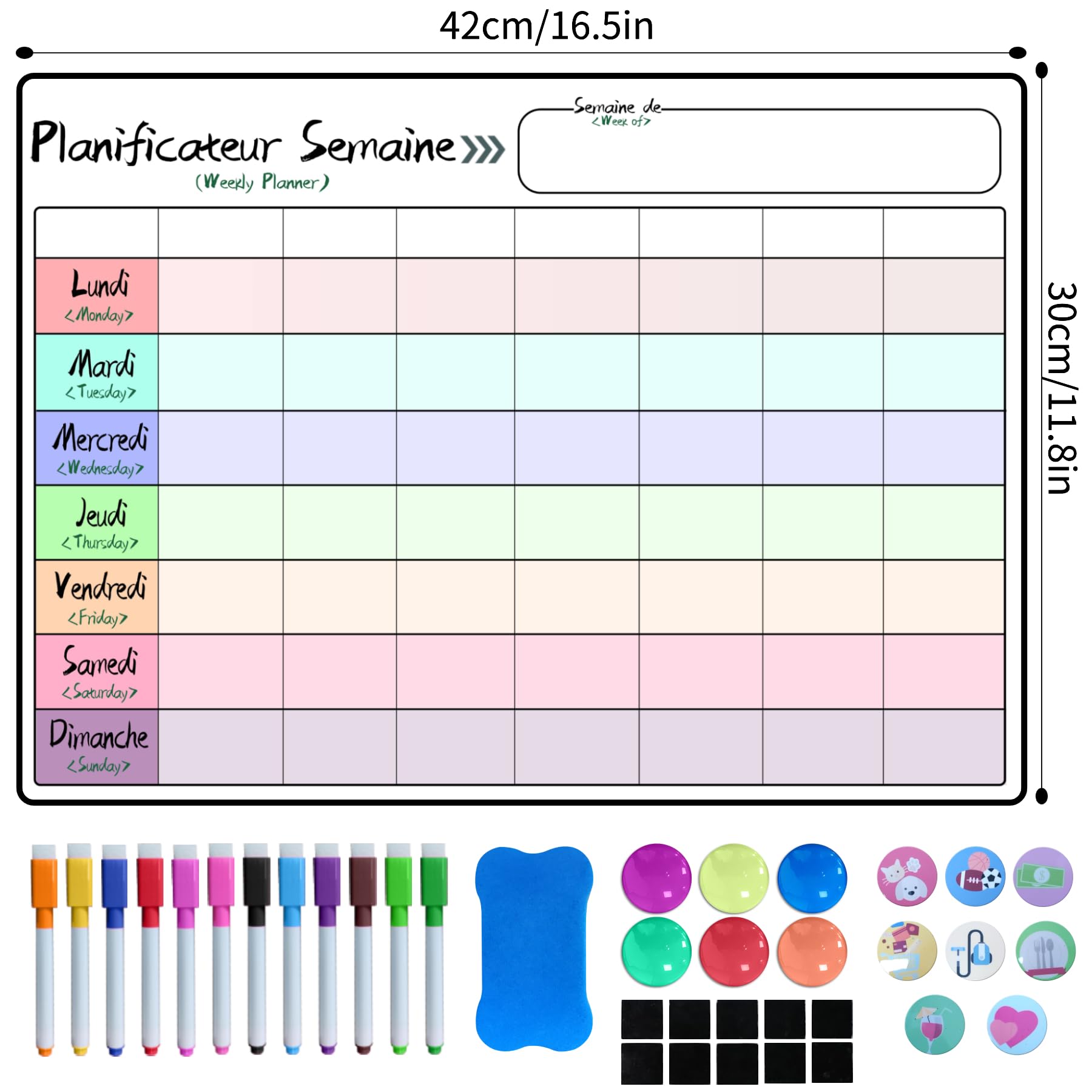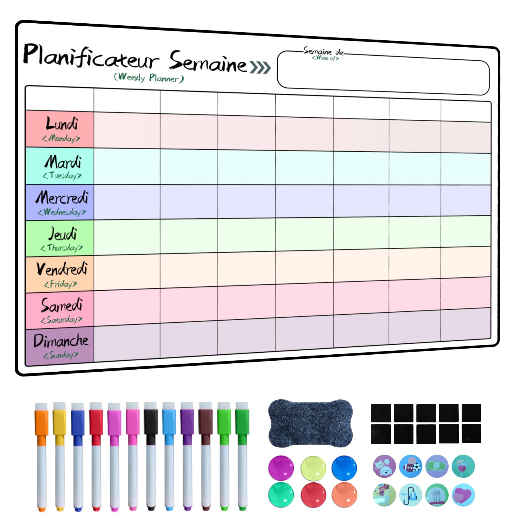 Termin, Termin, Woche und Funktionsbereich sind in Français und Englisch gestaltet, eignen sich für mehrsprachige Familien oder internationale Büroumgebungen und verbessern durch durchdachte Details das Nutzererlebnis