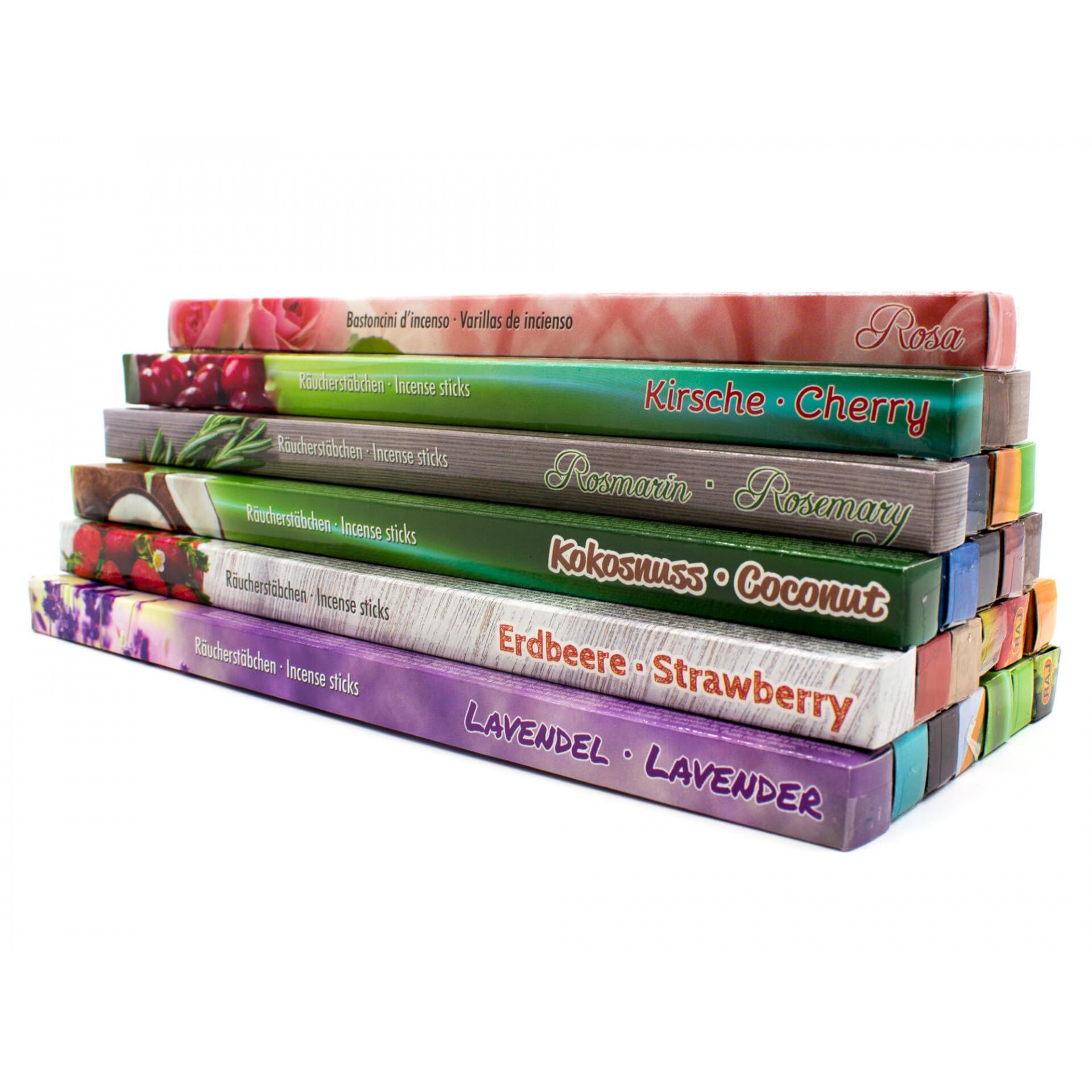 • Das sommerliche Probierset enthält folgende Duftrichtungen: Sandelholz, Vanille, Nag Champa, Adlerholz. Cannabis, Indian Darshan, Oud, Kaffee, Moschus, Opium, Orange, Kamasutra, Zitrone, Kokosnuss, Citronella, Erdbeere, Pfirsich, Rosmarin, Rose, Kirsche, Lavendel, Night Queen, Passion, Jasmin, Patschuli und Sonne