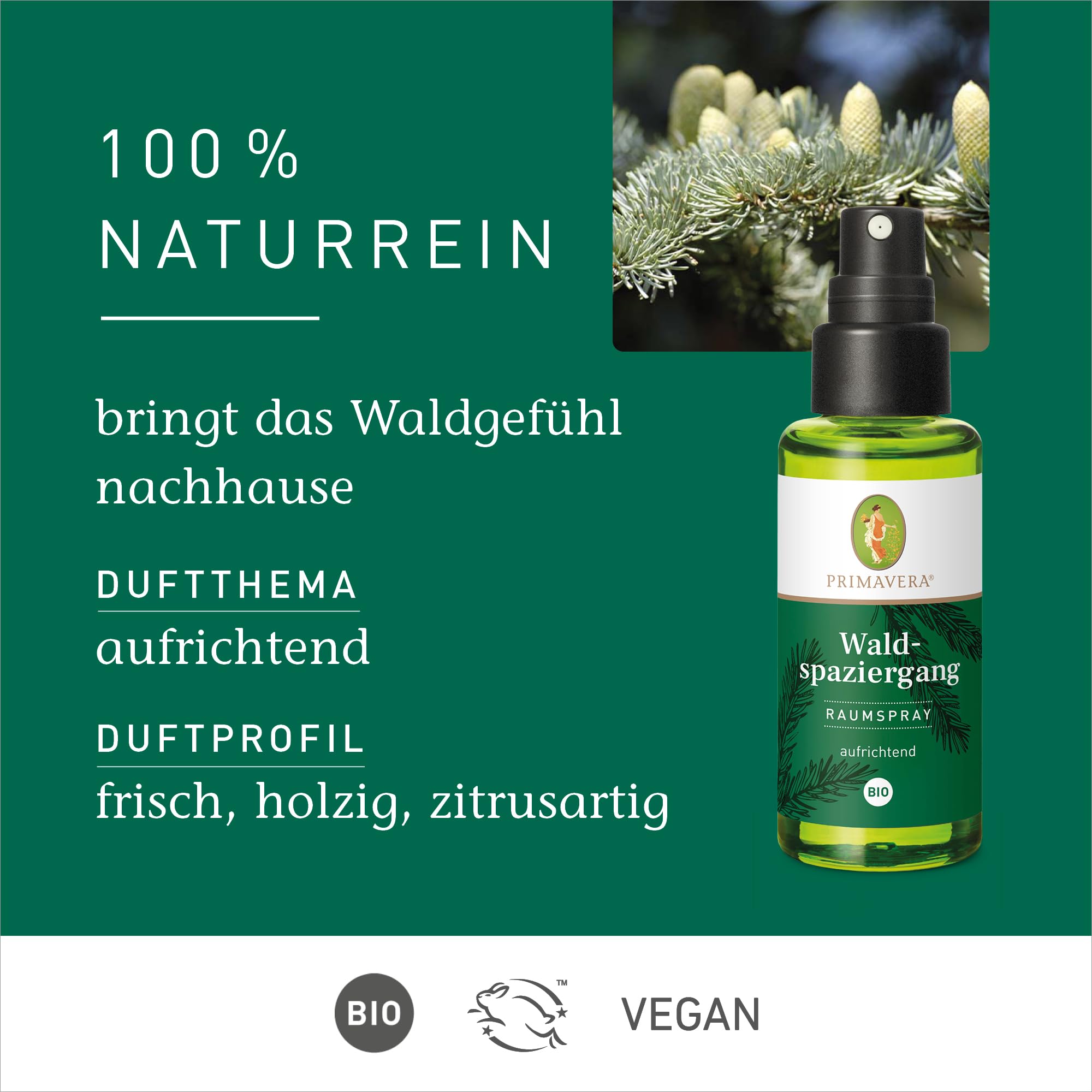 PRIMAVERA Raumspray Waldspaziergang bio 50 ml - Riesentanne, Fichtennadeln und Vetiver - Aromadiffuser, Aromatherapie - erfrischend - vegan