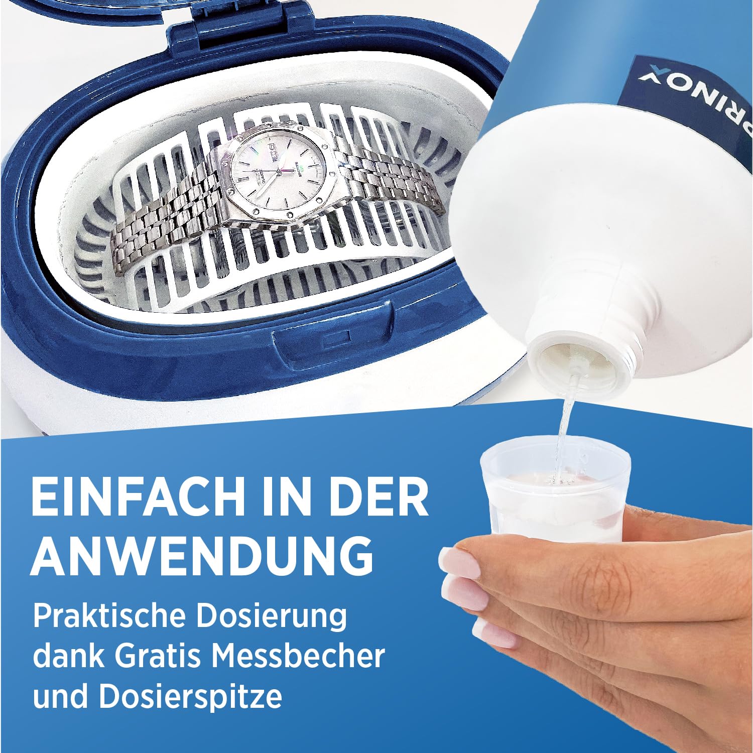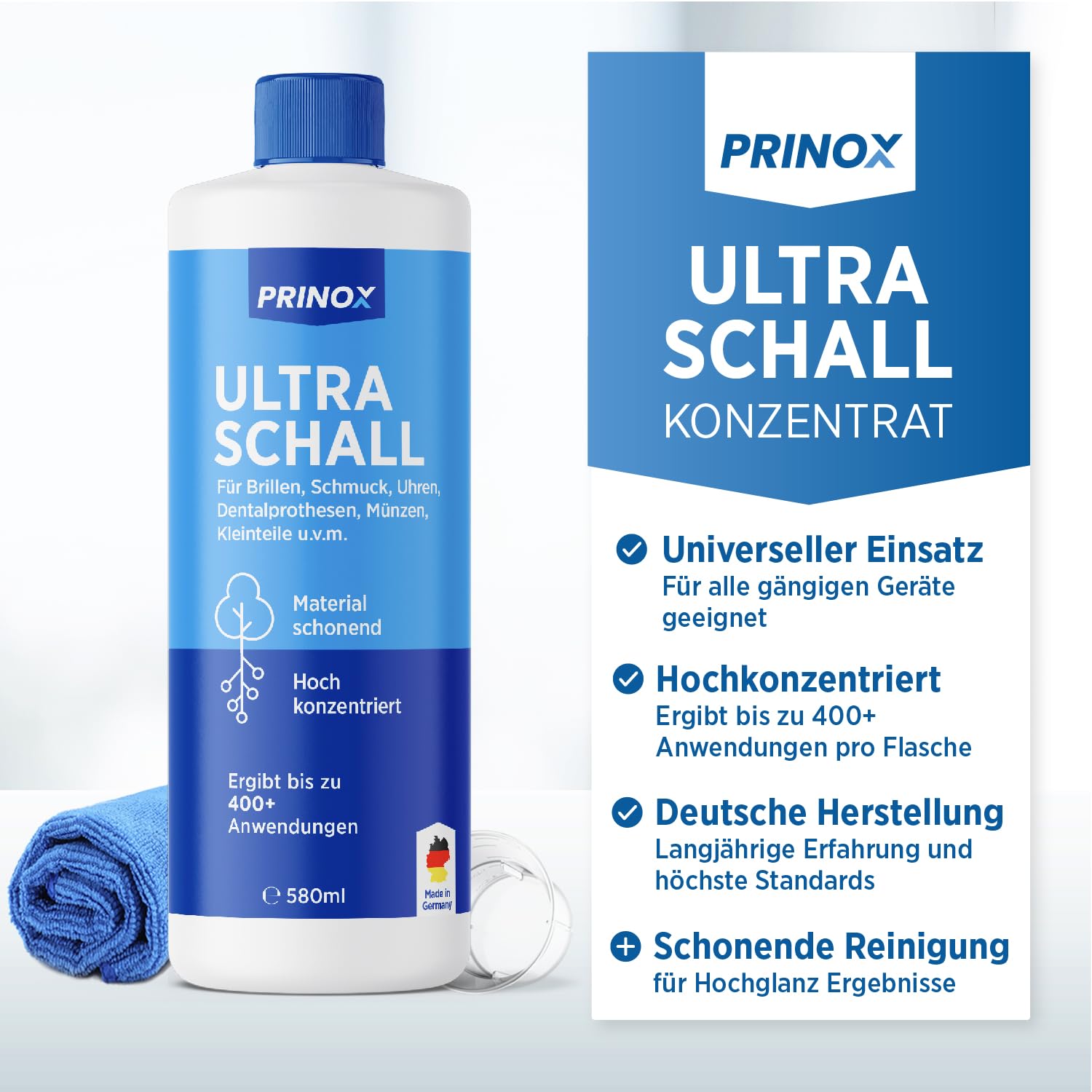 PRINOX® Ultraschallreiniger Konzentrat 580ml - Extrem ergiebig - Für Brille, Schmuck, Gebiss & Kleinteile - Für Ultraschallgeräte, Ultraschallbad
