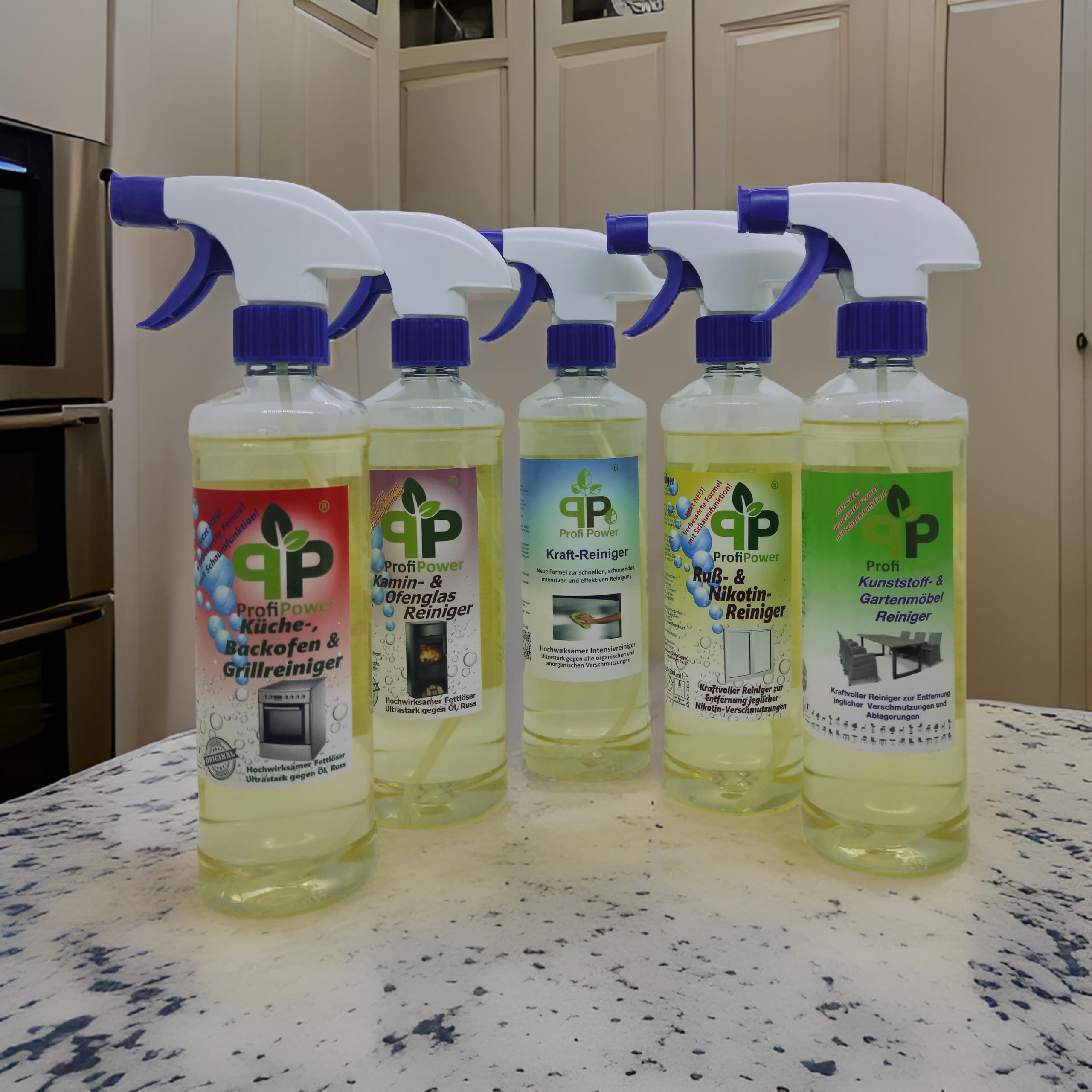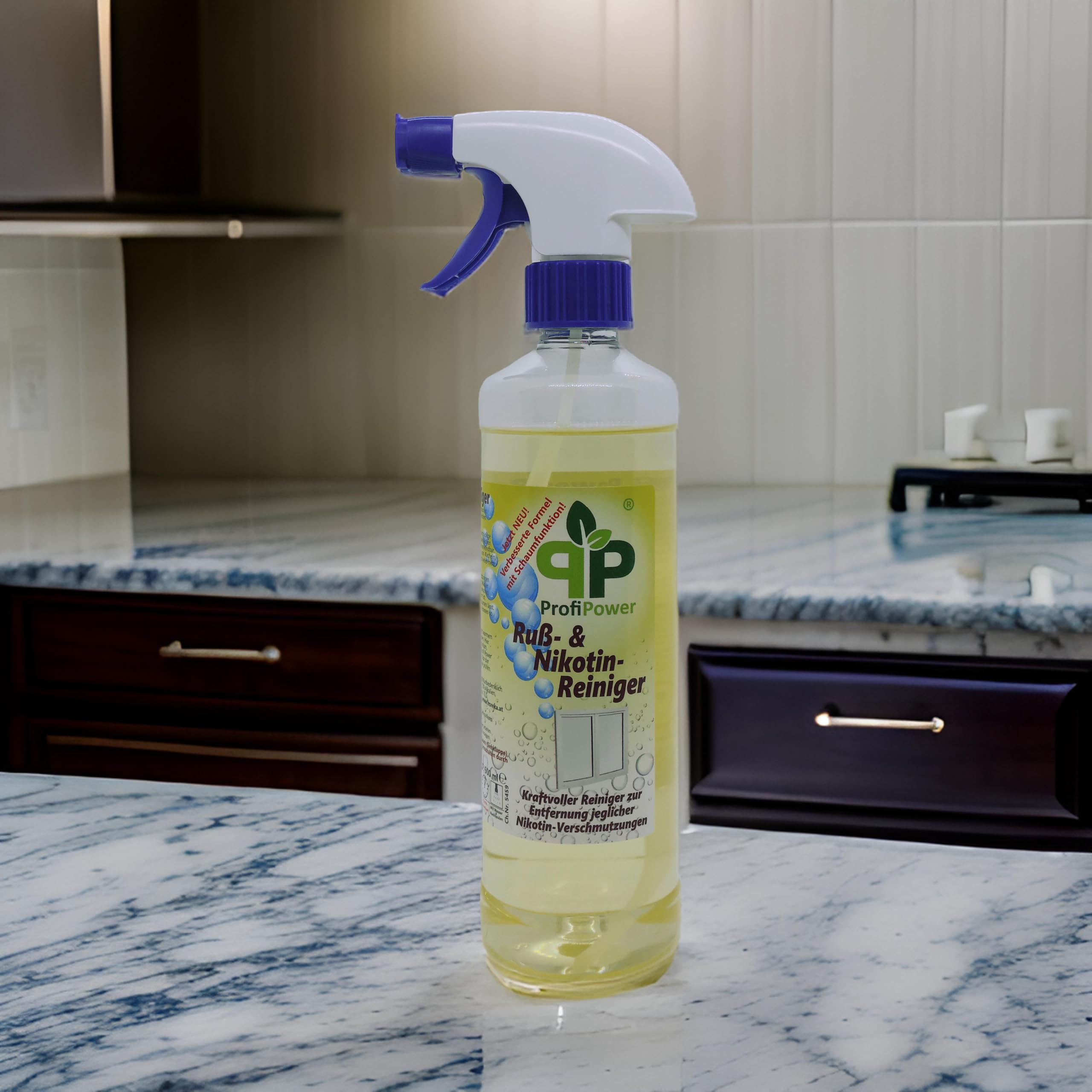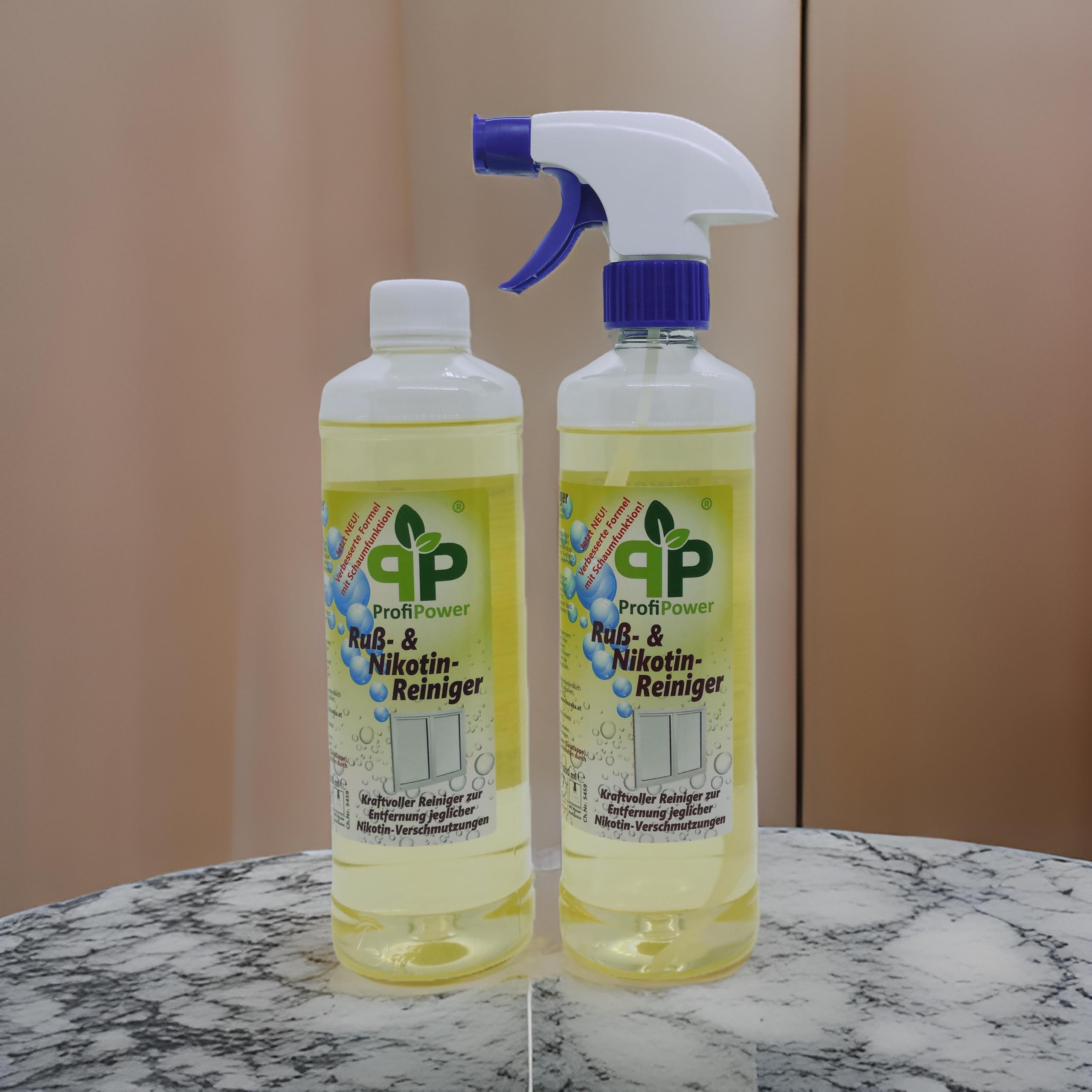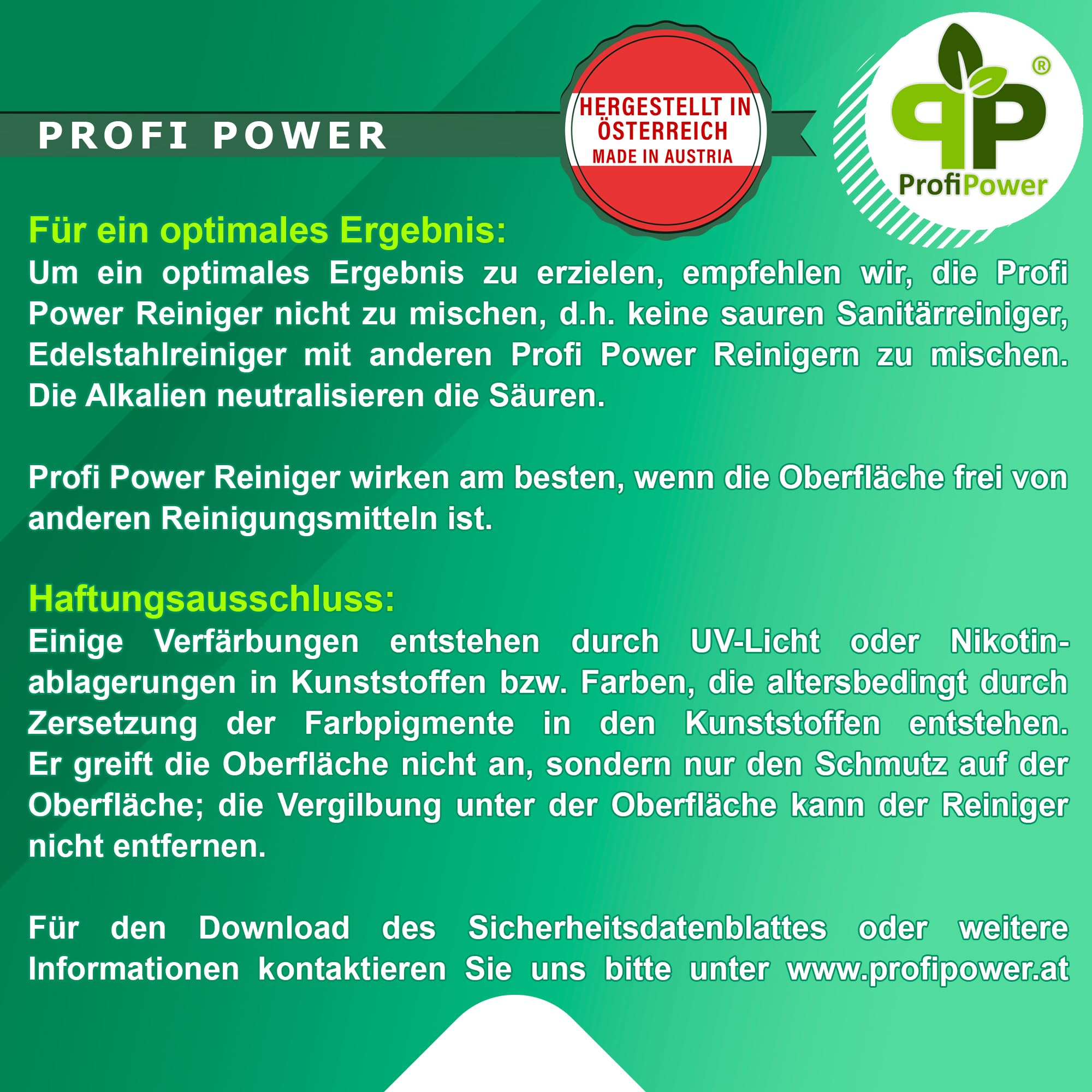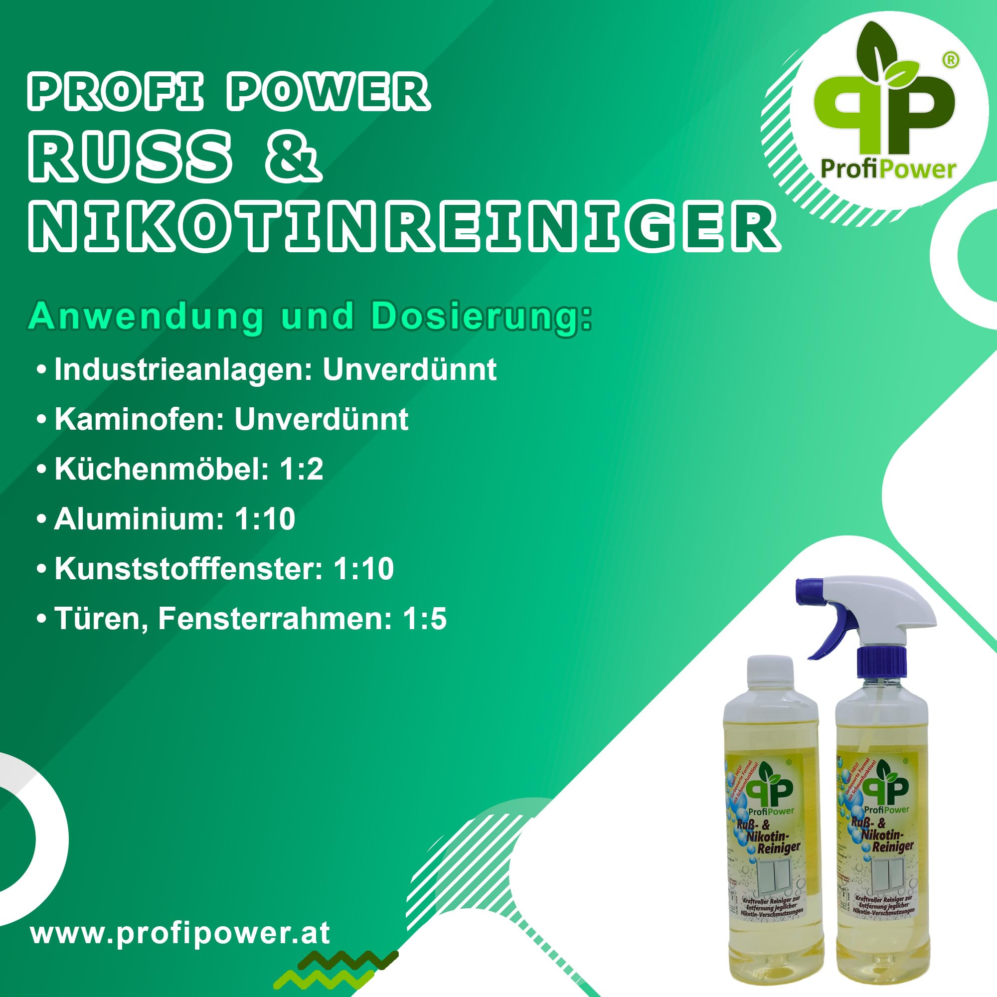 Profi Power Russ- & Nikotinreiniger 2 x 500ml Artikelbeschreibung Profi Power Russ- & Nikotinreiniger ist schnell und gründlich, schonend zum Material, umweltfreundlich und biologisch abbaubar. Anwendungsbereich Dieser hochwirksame, lösungsmittelfreie Reiniger entfernt Nikotin-Ablagerungen und andere hartnäckige Verschmutzungen wie Kuli und Tinte von fast allen Belägen wie auf Oberflächen aus Kunststoff, Metall und Glas, im Haushalt, im Büro und im Aussenbereich. Auch im lebensmittelnahen Bereich, z. B. in der Küche anwendbar. Entfernt selbst starke Schmutz-, Fett-, Nikotin-, und Ölverunreinigungen und Flecken von Gegenständen, Kacheln, Leder, Kunstleder, Armaturen, Böden, Tür- Fensterrahmen und (Hochglanz)-Flächen. AnwendungsempfehlungVerschmutzte Stellen einsprühen, 2-5 Minuten einwirken lassen und danach mit viel Wasser oder Druck absprühen oder mit einem feuchten Tuch nachwischen.Am Sprühkopf haben Sie ein Sieb, welches das Reinigungsmittel beim Auftragen schäumen lässt.Sie können so selbst entscheiden, ob Sie mit oder ohne Reinigungsschaum auftragen möchten.Vor der Anwendung auf der Oberfläche, auf Materialbeständigkeit an einer unauffälligen Stelle prüfen. Autoreinigung / Autohimmel / Leder / Polster Hier Profi Power Nikotinreiniger mit einem sauberen und trockenen Tuch auftragen / sprühen und damit reinigen; nach ca. 30 - 60 Sek. mit einem feuchten Tuch nachwischen.