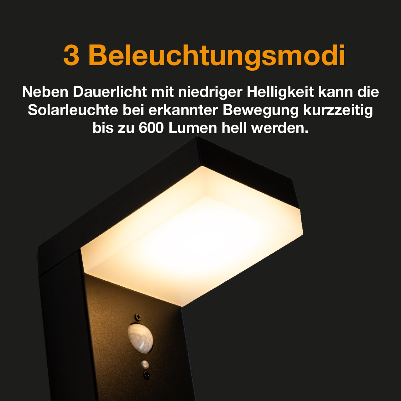 Modus B: Die Leuchte schaltet sich in der Dämmerung (<30 Lux) mit verminderter Helligkeit automatisch ein und leuchtet die ganze Nacht mit 20 Lumen als Orientierungslicht. Bei erkannter Bewegung schaltet sich die Leuchte für ca. 25 Sekunden mit 300 Lumen Leistung ein.