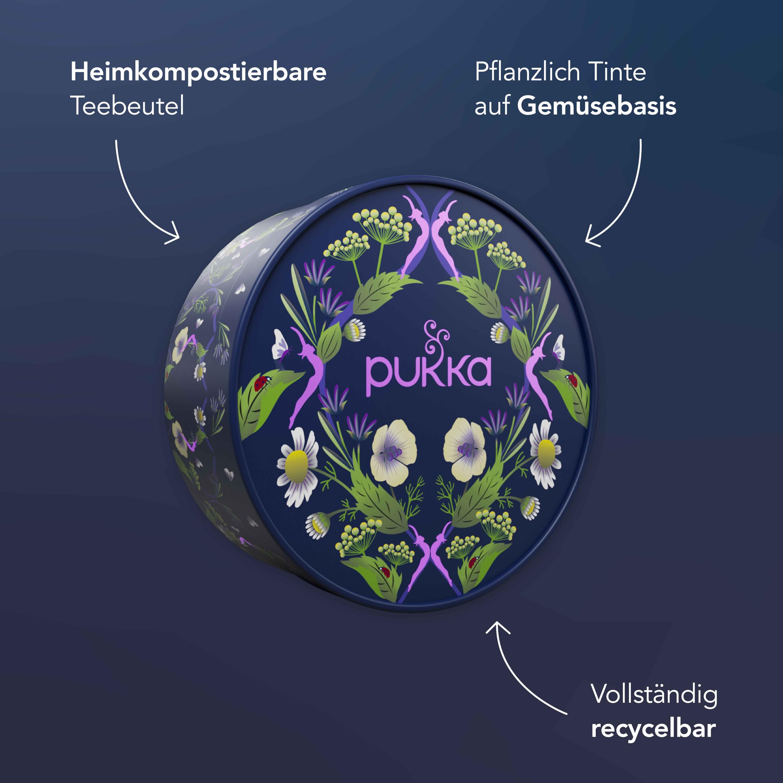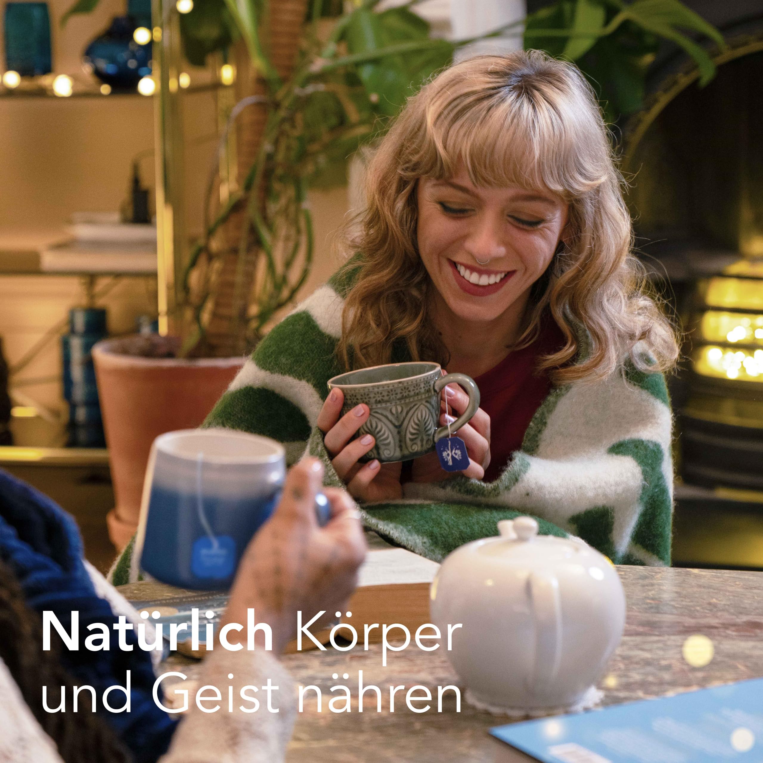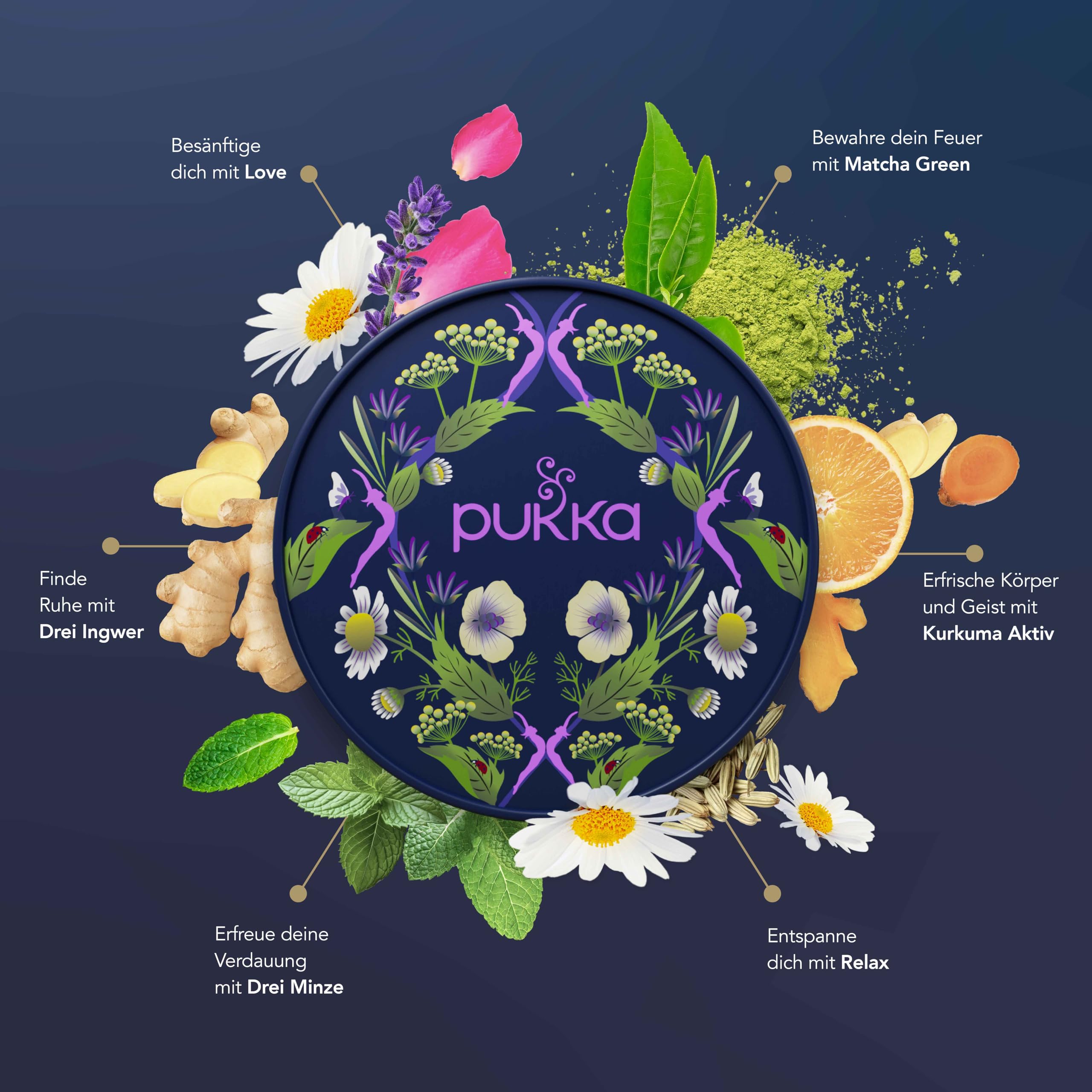 Entdecke eine tägliche Reise durch Freude und Lebendigkeit mit köstlichen Bio-Kräutertees, die dich von früh bis spät unterstützen. Die Pukka Bio-Kräutertee Selection Box 'Wellness von früh bis spät' ist ein wunderschönes, kompromissloses Wohlfühl-Geschenk, das deine Lieben darin bestärkt, sich über den ganzen Tag kleine Auszeiten für sich selbst zu nehmen. Die Selection Box inspiriert dazu, sich auf alles einzulassen, was die Natur zu bieten hat. 'Wellness von früh bis spät' mit 90 Teebeuteln in 6 köstlichen Geschmacksrichtungen wird von unseren hauseigenen Kräuterexpert:innen mit ausgewogenen Bio-Zutaten gemischt, um den ganzen Tag über entspannte Momente zu schaffen. Unser Wohlfühl-Geschenk für den Arbeitstag eignet sich perfekt für all diejenigen, die unterwegs, im Büro oder zwischendurch einen Entspannungsmoment geniessen möchten. 'Matcha Green' vereint die erfrischenden Noten von grünem Tee und Matcha. Für Tage, die schon morgens rein, grün und unübertroffen durchstarten. 'Goldene Kurkuma' kombiniert die würzigen Eigenschaften von Kurkuma mit einem Hauch Zitrone. Geniesse ihn und spüre das Leuchten dieser köstlichen Mischung und ihr strahlend-goldenes Licht. 'Drei Minze' ist voll von kühlenden Noten von Minze, Pfefferminze und Ackerminze. Geniesse ihn reichlich, vor, zum und nach dem Essen. 'Relax' kombiniert den süssen, aromatischen Geschmack von Fenchel mit den blumigen Noten von Kamille und dem cremigen Haferblütenaroma – immer dann, wenn du einen Moment zarter Stille suchst. 'Drei Ingwer' verbindet die Schärfe von Kurkuma und Ingwer mit den pikanten Noten von Galgant zu einem belebenten Tee – jederzeit und immer köstlich, besonders wenn die Müdigkeit naht. 'Love' vereint die blumigen Aromen von Lavendel, Rose und Kamille mit der seidig-süssen Note von Lindenblüten, um das Herz zu öffnen und ein Lächeln auf das Gesicht zu zaubern. Unsere wunderschön gestalteten Kräutertee-Geschenke sind vollständig recycelbar, bis hin zu den Bio-Baumwollfäden an unseren kompostierbaren Teebeuteln. Die verschlungenen Details auf unseren Verpackungen sowie die Pukka-Blüten werden mit pflanzlicher Tinte auf Gemüsebasis gedruckt. Dadurch sind unsere Geschenke sowohl gut für dich, als auch für unseren Planeten. Jede unserer Teemischungen enthält ethisch und nachhaltig beschaffte Zutaten aus biologischem Anbau. Jede Zutat wird von unserem Expertenteam auf den Gehalt an ätherischen Ölen geprüft, um sicherzustellen, dass unsere Mischungen von höchster Qualität sind. Die kostbaren Bio-Kräuter werden in unseren FSC-zertifizierten, recycelbaren Teebeuteln geschützt. Diese bewahren die Qualität und den Geschmack solange, bis du den wunderbaren Bio-Tee geniessen kannst.