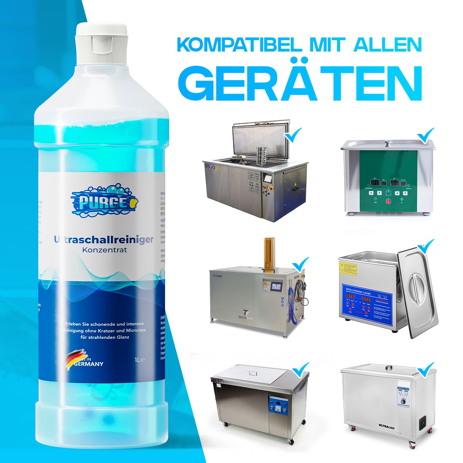 Das PURGE Ultraschallreiniger Konzentrat kann mit allen gaengigen Ultraschallreinigungsgeraeten verwendet werden und ist sowohl fuer den privaten Haushalt als auch fuer den professionellen Einsatz geeignet. Es sorgt fuer sichtbar saubere Ergebnisse ohne mechanisches Reiben und verlaengert die Lebensdauer Ihrer Wertgegenstaende.