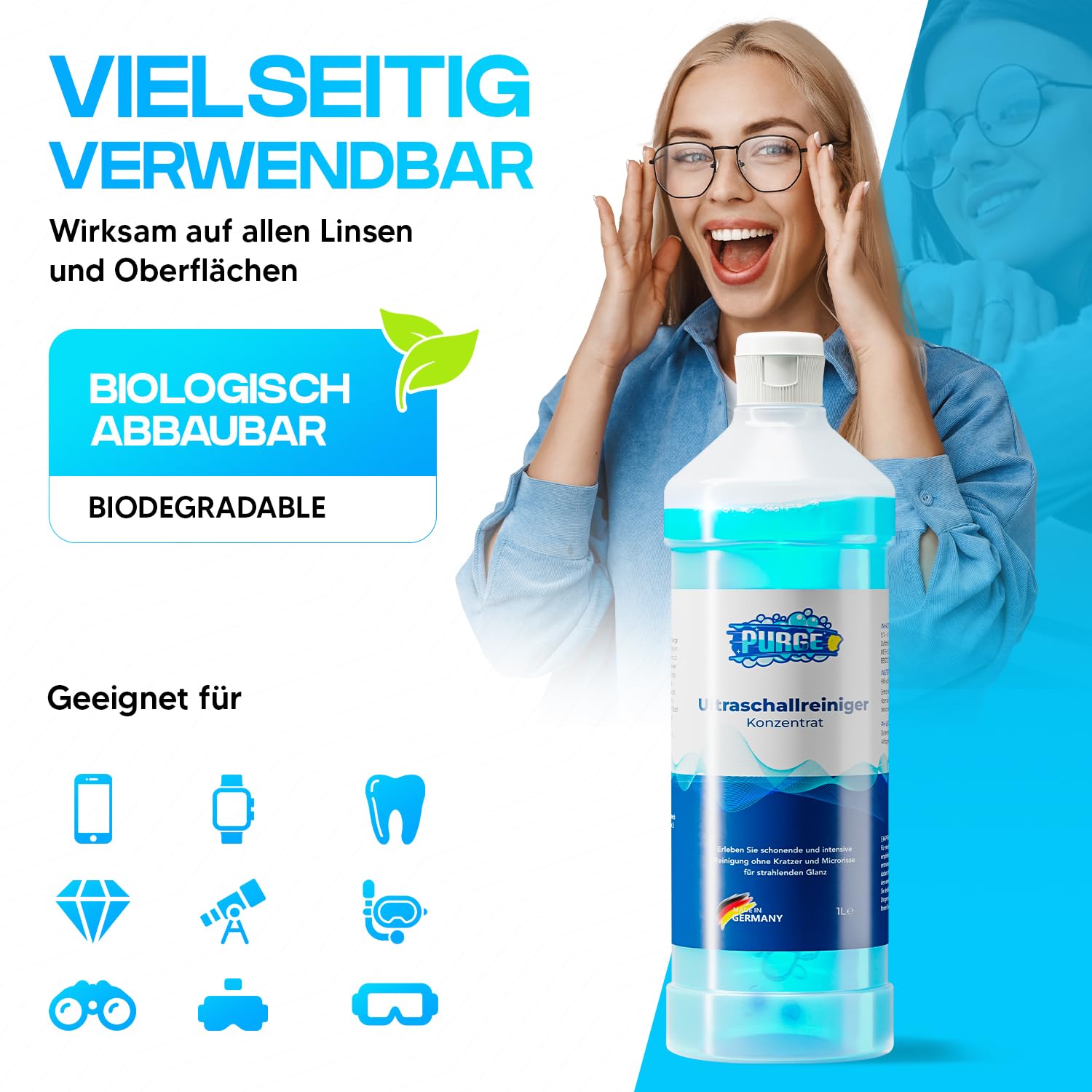 PURGE Ultraschallreiniger Konzentrat – 1:100 Reinigungsfluessigkeit fuer Brillen & Schmuck, geeignet fuer Ultraschallgeraete