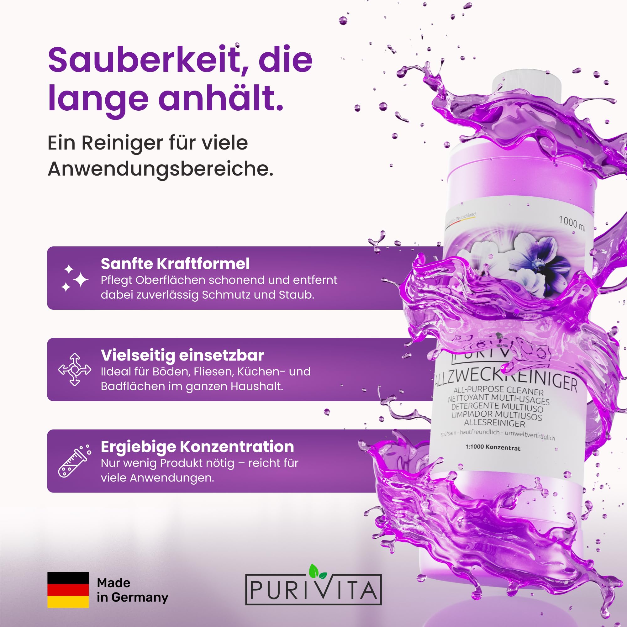 ???????????????????????????????????????????????? ????????????????????????????: Dieser hochkonzentrierte Universalreiniger eignet sich perfekt für hartnäckige Verschmutzungen und ist flexibel einsetzbar für alle wasserbeständigen Oberflächen als Glasreiniger, Küchenreiniger, Fliesenreiniger, Teppichreiniger, Polsterreiniger, Fettlöser, Bildschirmreiniger u.v.m. ????????????????????????????????????????????????????????????????????????: Das Allzweckreiniger Konzentrat ist nicht nur extra stark, sondern auch materialschonend und umweltverträglich. Seine hochkonzentrierte Formel ermöglicht eine gründliche Reinigung bei sparsamem Verbrauch. Mischverhältnis: 10 ml auf 10 Liter Frischwasser. ???????????????????????????????????????????????????????????????? ????ü???? ????????????????????ä???????????????????? ????????????????????????????: Dank seiner starken Konzentration eignet sich der Allzweckreiniger auch für die industrielle Reinigung und ist ideal für professionelle Reinigungsanwendungen aller wasserfesten Böden wie Naturstein, Kunststein, PVC und Linoleum. ???????????????????????????????????????????????????? ???????????????? ???????????? ????????????????????????????????????????????????????????????????????????: Das Putzmittel hinterlässt nicht nur Sauberkeit, sondern auch einen angenehmen, langanhaltenden blumigen Duft und eignet sich hervorragend zur Geruchstilgung auf wasserfesten Oberflächen. ???????????????? ???????????????????????????????????? ???????????? ???????????????????????????????????????? ????????????????????????????????????????????????????????????????????????: Unser Allesreiniger wird in Deutschland hergestellt und bietet eine sehr gute Reinigungswirkung auf allen wasserfesten Oberflächen im Haushalt oder bei professionelle Reinigungen.