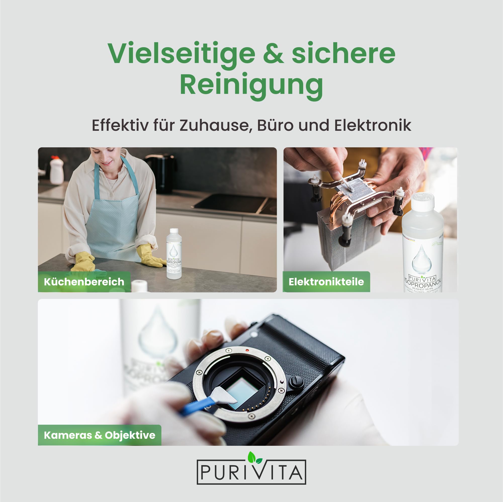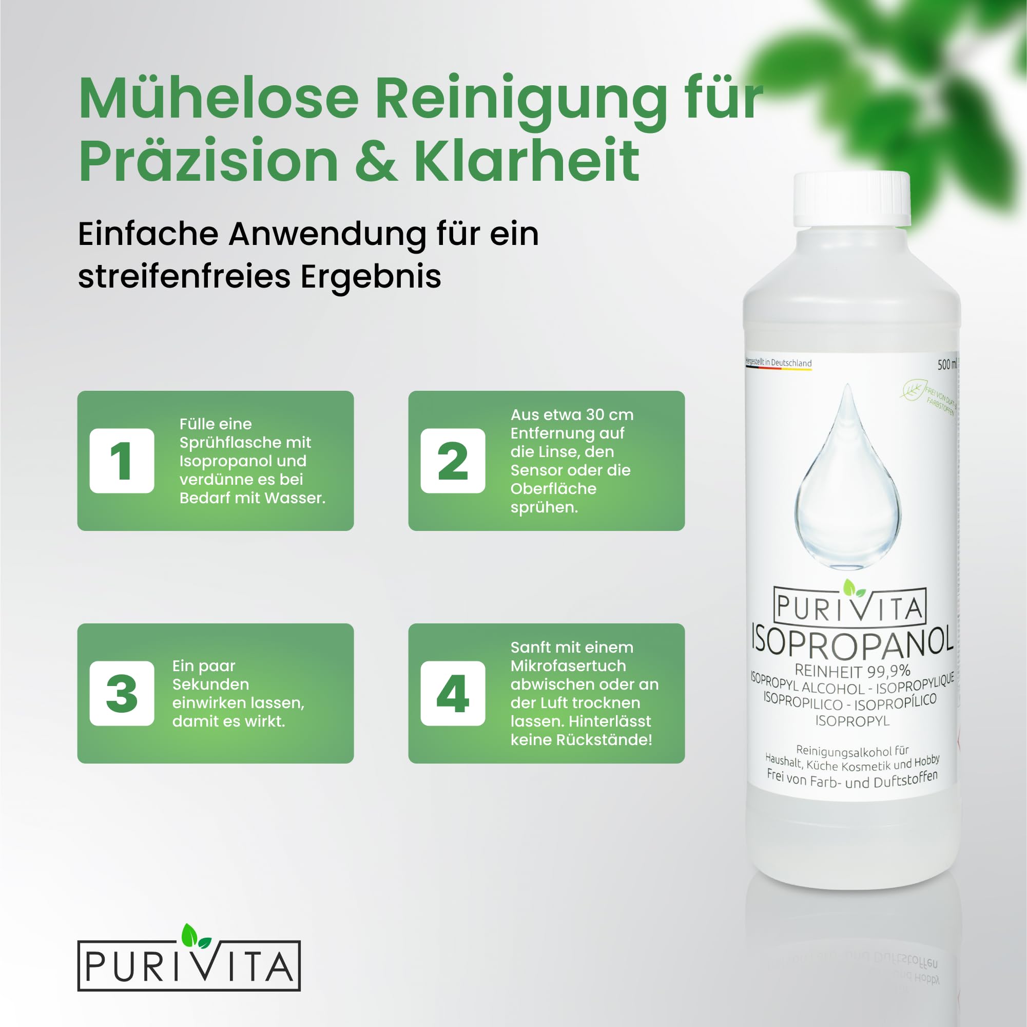 • ???????????????????????????????????????????????? ????????????????????????????????: Entdecken Sie die 99,9% Reinigungskraft von Purivita Isopropanol dem Allzweckreiniger für Haushalt, Industrie, Hobby und Kosmetik. Ideal als Entfetter und Lösungsmittel für Fette, Harze und mehr. Verfügbar in 500 ml bis 3 x 1l.