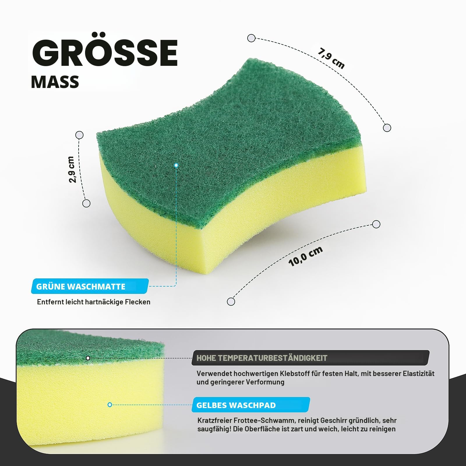 • 【Leistungsstarke Reinigung】: Die kratzfreie weiche gelbe Schwammoberfläche hat eine gute Wasseraufnahme, und das hochwertige grüne Scheuerkissen auf einer Seite ist entworfen, um mühelos Öl und verbrannte Lebensmittel zu entfernen.
