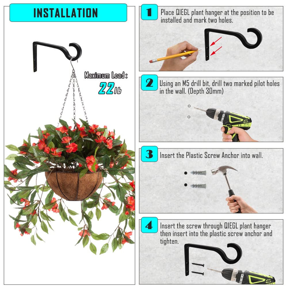 Qieegl Pflanzenaufhänger aus solider und leichter Aluminiumlegierung. Die Oberfläche des Qiegl-Hakens ist aus matter Spezialbeschichtung, die die Lackoberfläche glatt und strukturierter macht und mehr Rost- und Korrosionsbeständigkeit macht und langlebiger als gewöhnliche Haken ist. Kanten- und Filet-Design, keine Notwendigkeit, sich Sorgen zu machen, dass die Hände kratzen. 2 - Retro-Kleiderbügel-Design, einfach und elegant, fügen Sie Retro-Schönheit zu Ihrem Haus und Garten hinzu. Sie können es verwenden, um Ihr Wohnzimmer, Badezimmer, Schlafzimmer, Eingang, Terrasse, Veranda, Garten, Hinterhof, Holzdeckzaun und andere Innen- und Aussenplätze zu dekorieren. 3. Der starke und langlebige Qielgl-Haken kann leicht an der Wand hängende Blumentöpfe, Laternen, Windspiele, Blumenkörbe, Vogelfutterspender, Lampenschnüre, Mäntel, Hüte, Schlüssel, Festivaldekorationen, Dekorationen usw. aufgehängt werden, um Ihr Haus oder Garten zu verschönern. 4--Dieses Paket enthält 2 Pflanzhaken, 4 Schrauben und 4 Wandanker. Jede Schraube ist eine Standard-M5-Schraube, 3,0 cm lang. Sie müssen nur die Schrauben in die Holzzaunpfosten, Terrassenpfosten und sogar die Innenwände schrauben. Es sieht toll aus in einer Vielzahl von verschiedenen Umgebungen.