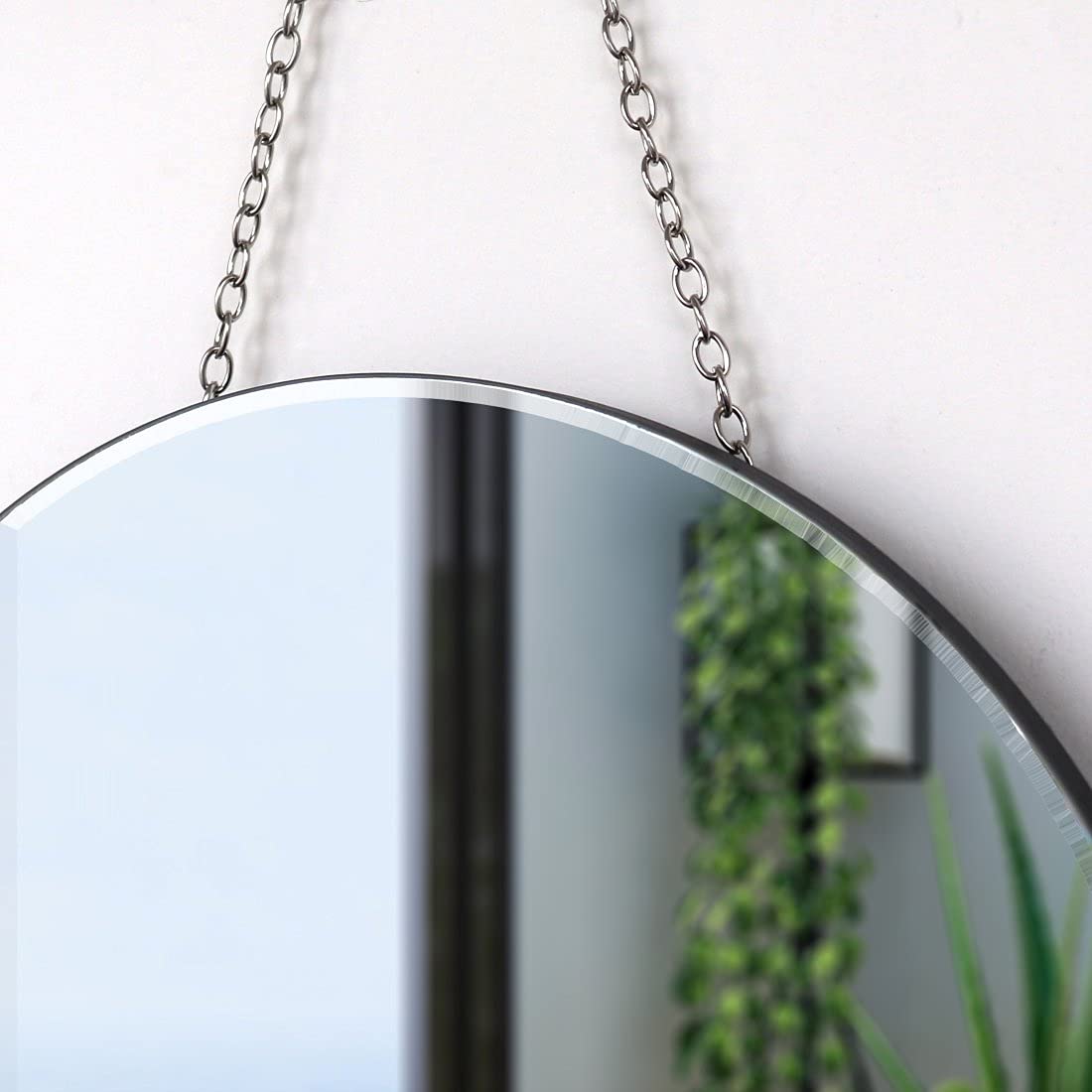 - Material: 4 mm silberfarbener Spiegel mit schwarzer MDF-Rückseite, Eisenkette zum Aufhängen. Der Spiegel besteht aus MDF-Holzrückwand für Verstärkung und Stabilität. Und er kommt mit einem weissen Aufhänger zum Aufhängen an der Wand.