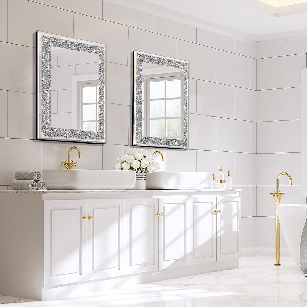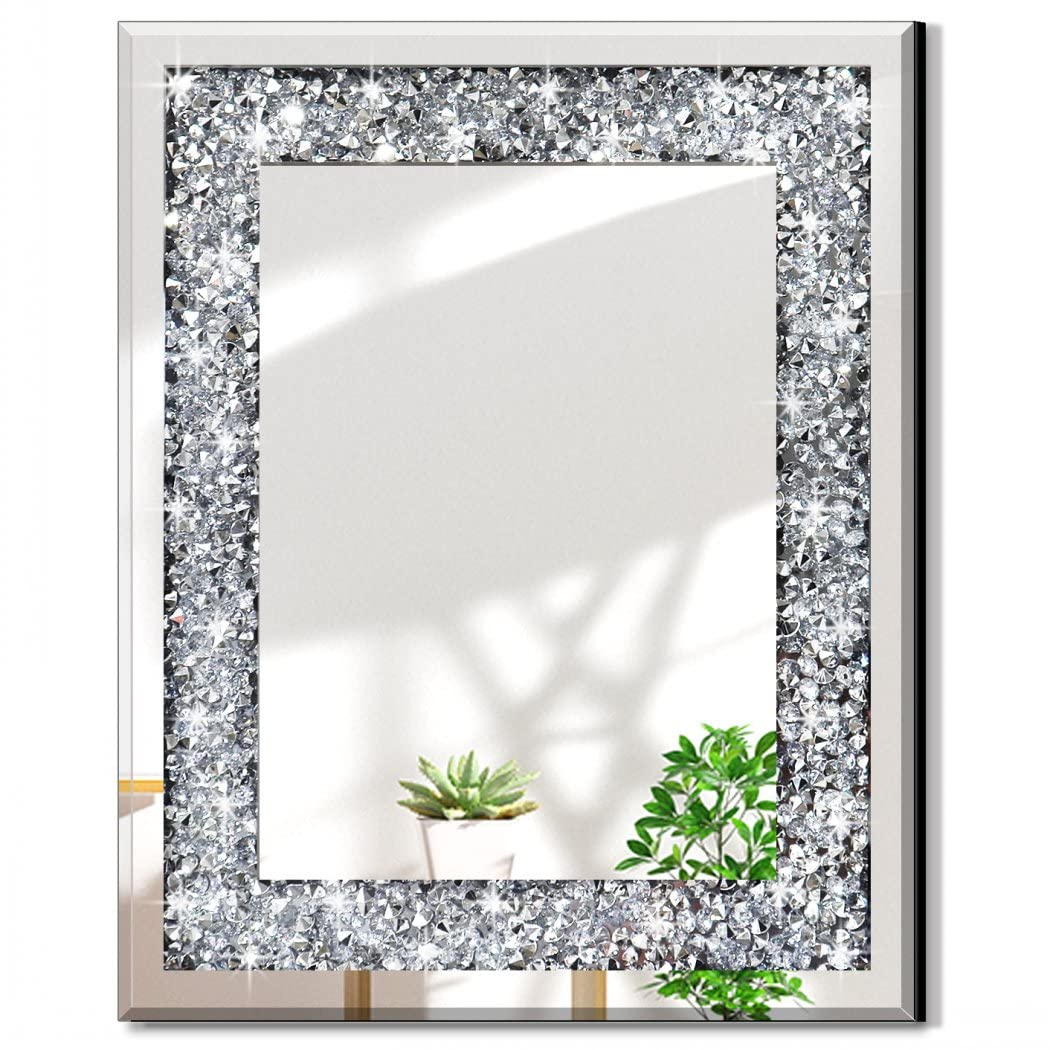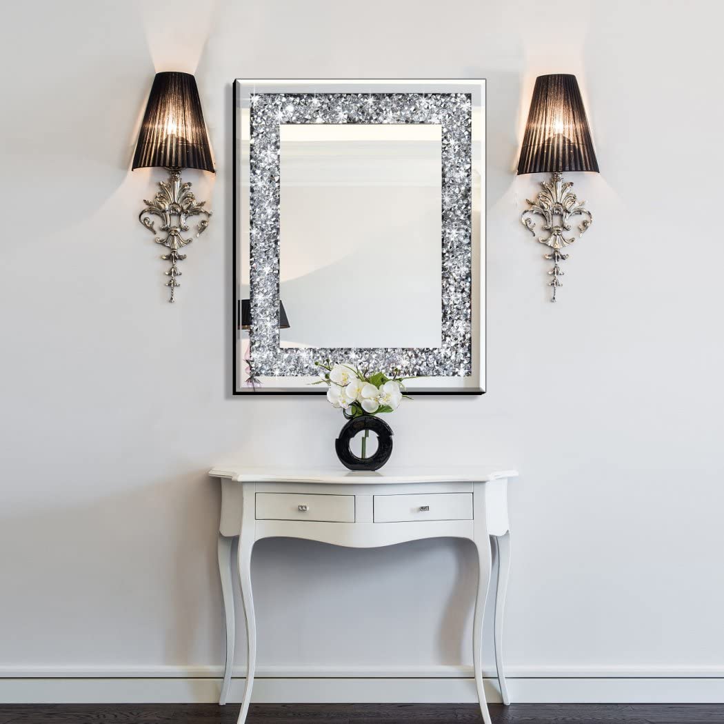 QMDECOR Rechteckiger, funkelnder, dekorativer Wandspiegel für Heimdekoration mit silberfarbenem Kristall-Crush-Diamant-Dekor, Masse: 40.6x50.8x2.5 cm, rahmenlose Spiegel, Glas-Diamant-Dekor.