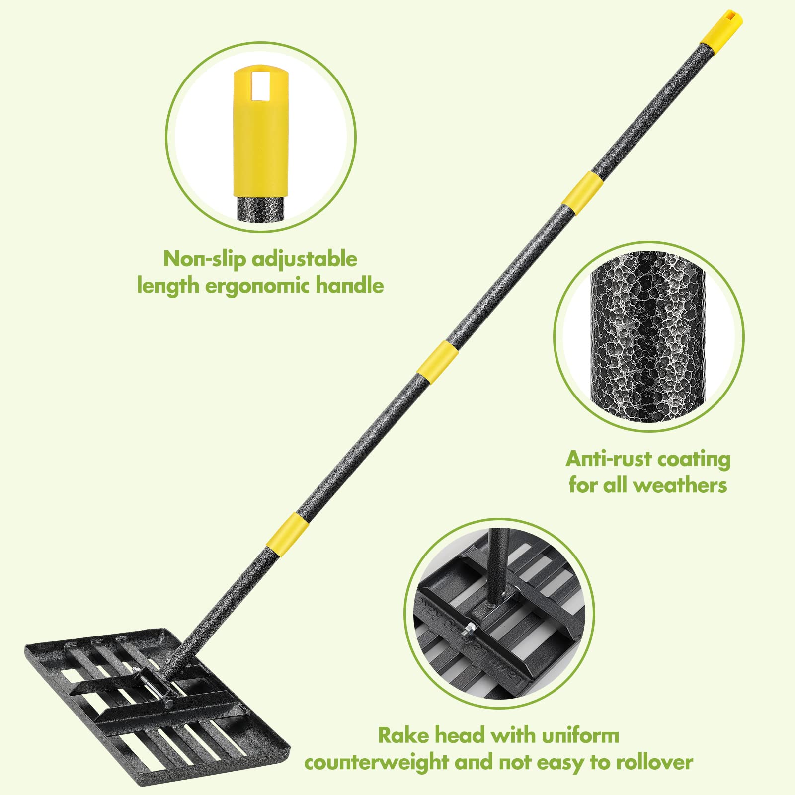 Rasen-Nivellierrechen, 43.2x25.4 cm, Rasen-Nivellierwerkzeug für Rasenflächen mit 1.5 m ergonomischem Griff, robuste Nivellierrechen für Rasen, Hof, Garten, Golfplatz, Sand, Schmutzoberflächen