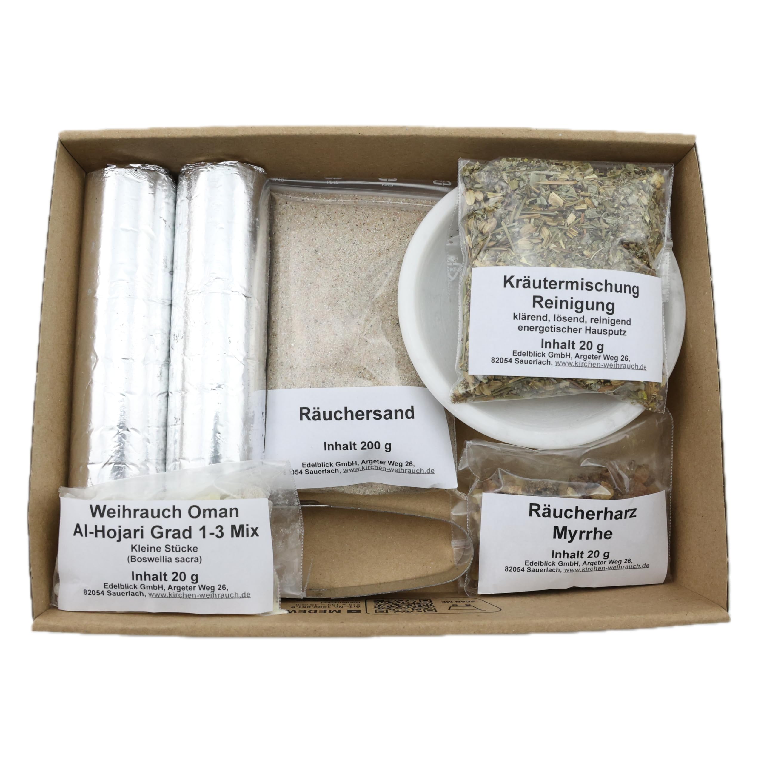 Räucherset „Hausreinigung“ – 9 TLG. – Kräuter-Mischung Reinigung m. Weihrauch Oman Al-Hojari u. Myrrhe - Räucherschale u. Zubehör – Geschenkkarton mit Klarsichtdeckel (Weisse Speckstein-Schale)