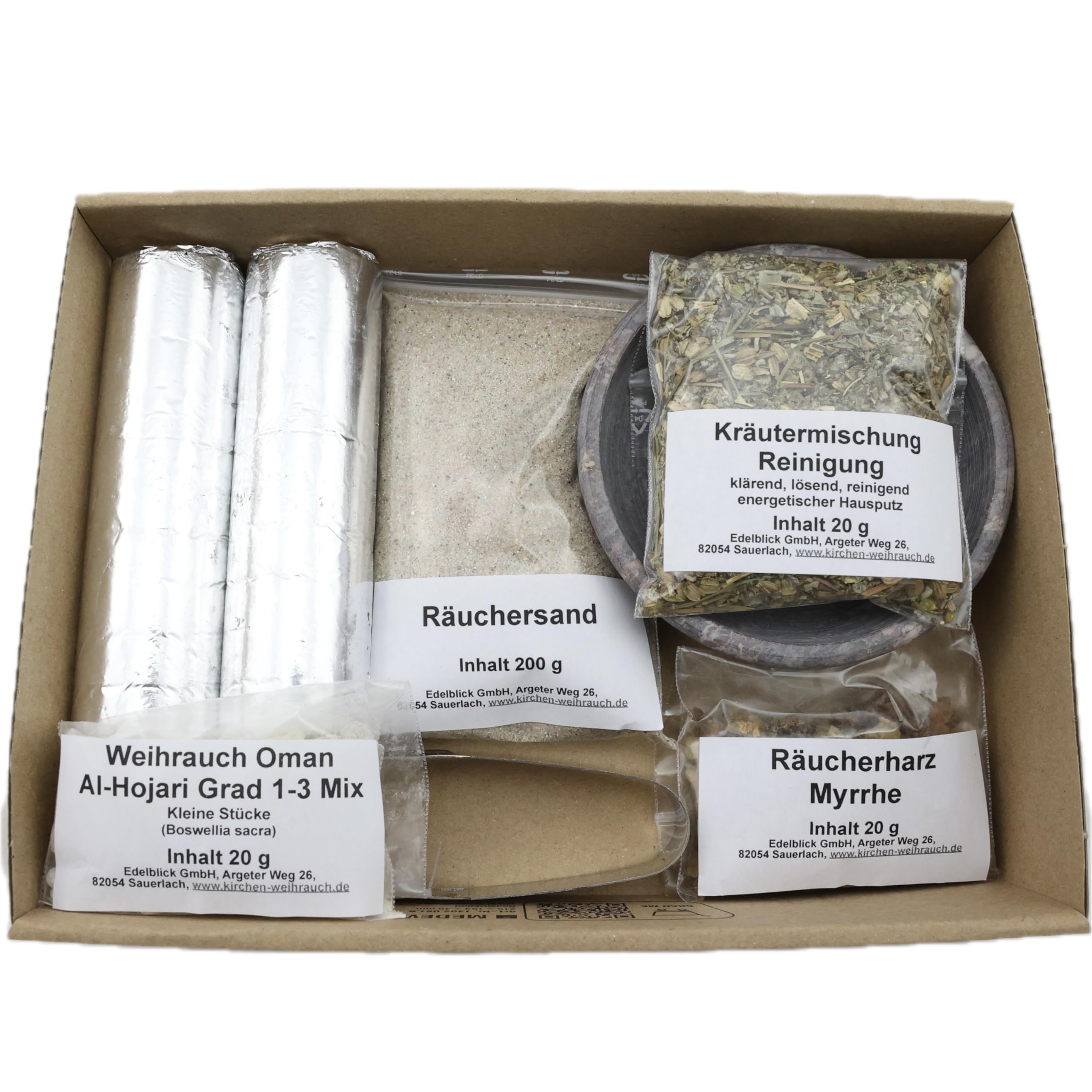 Räucherset „Hausreinigung“ – 9 TLG. – Kräuter-Mischung Reinigung m. Weihrauch Oman Al-Hojari u. Myrrhe - Räucherschale u. Zubehör – Geschenkkarton mit Klarsichtdeckel (Natur Speckstein-Schale)