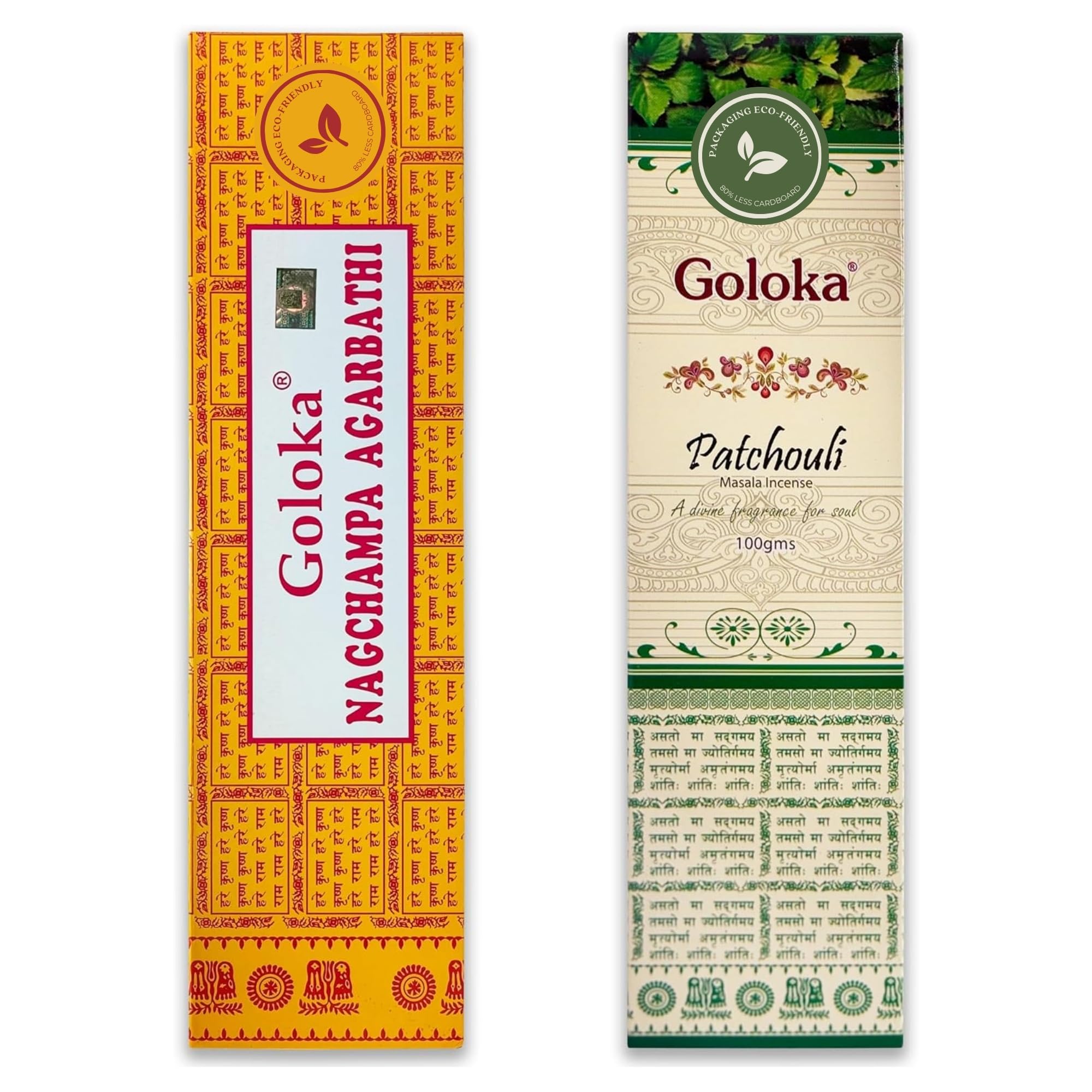 Nag Champa Räucherstäbchen 100 g + Patchouli 100 g – zwischen 70–90 Stäbchen von jedem Duft – Aromatherapie – Meditation – Yoga – Packaging Eco-Friendly