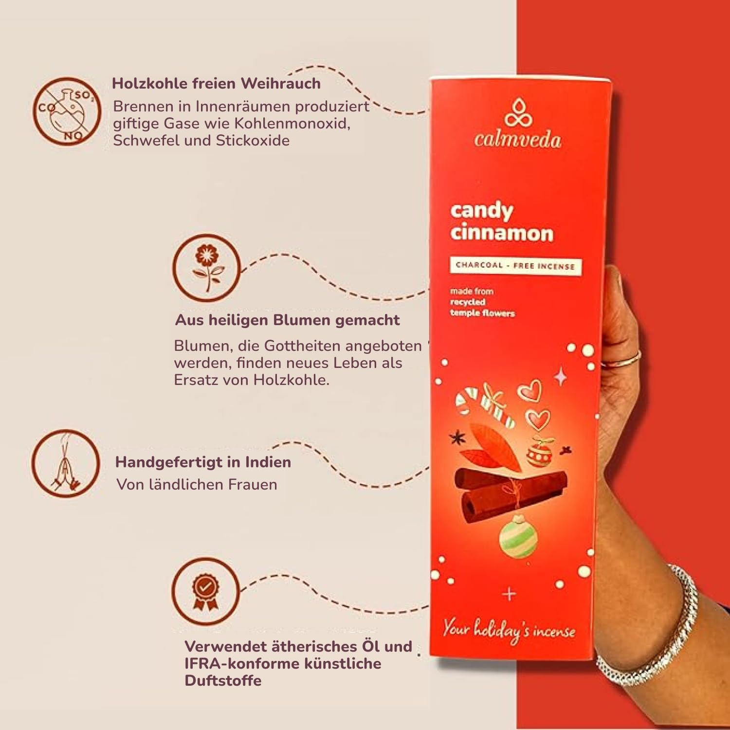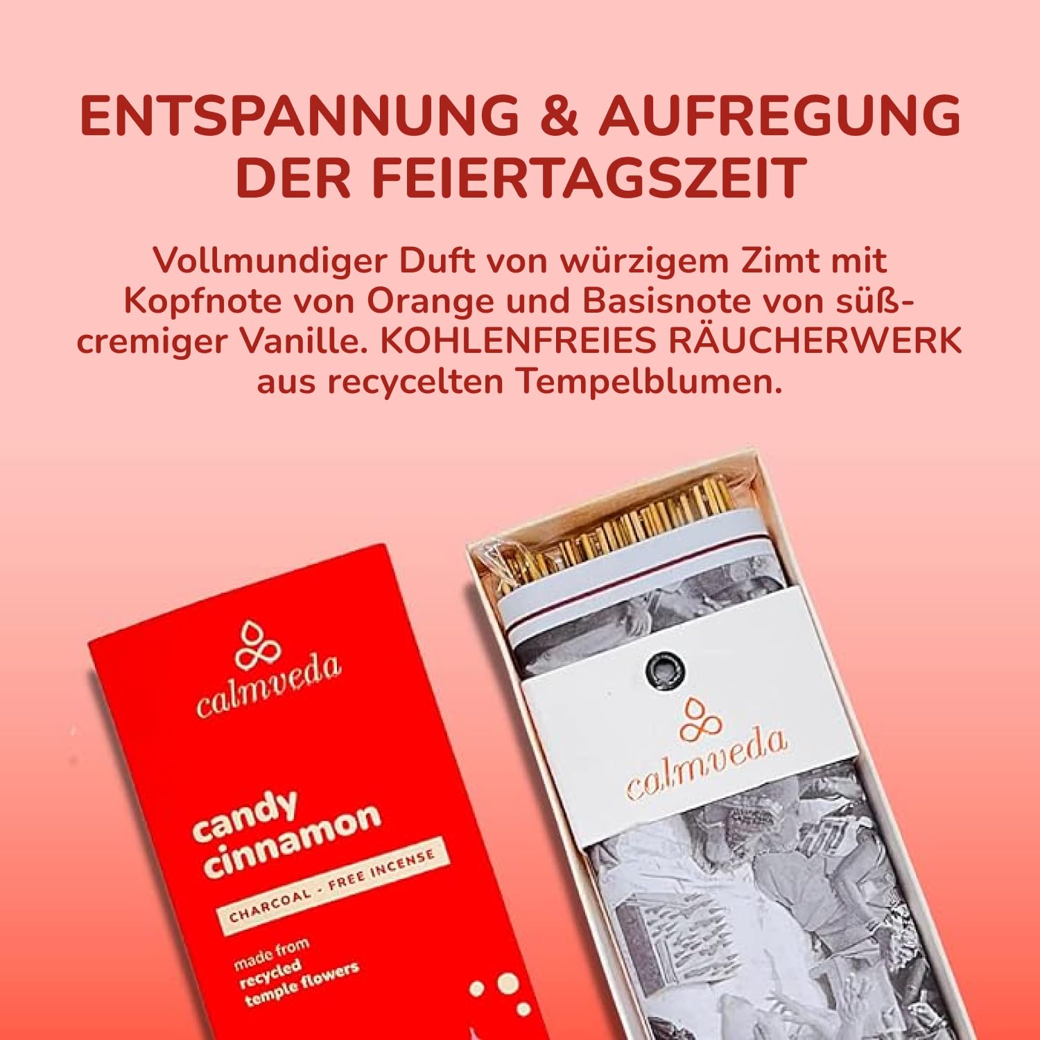 Calmveda Candy Zimt räucherstäbchen Weihnachten - (80 weihrauch Bio) Würziger, cremiger Vanille- und aromatischer Tangerine - Räucherstäbchen | Räucherstäbchen Set, hergestellt aus Upcycled-Blumen