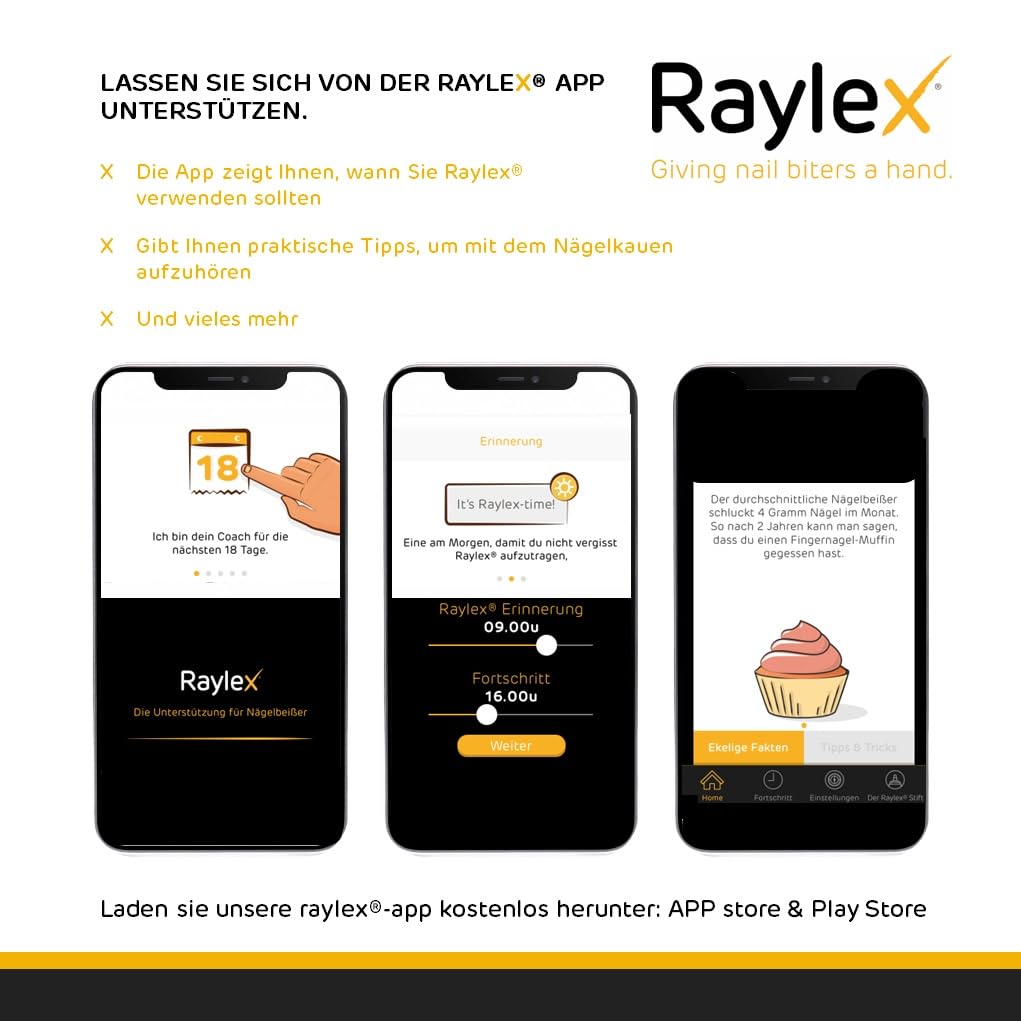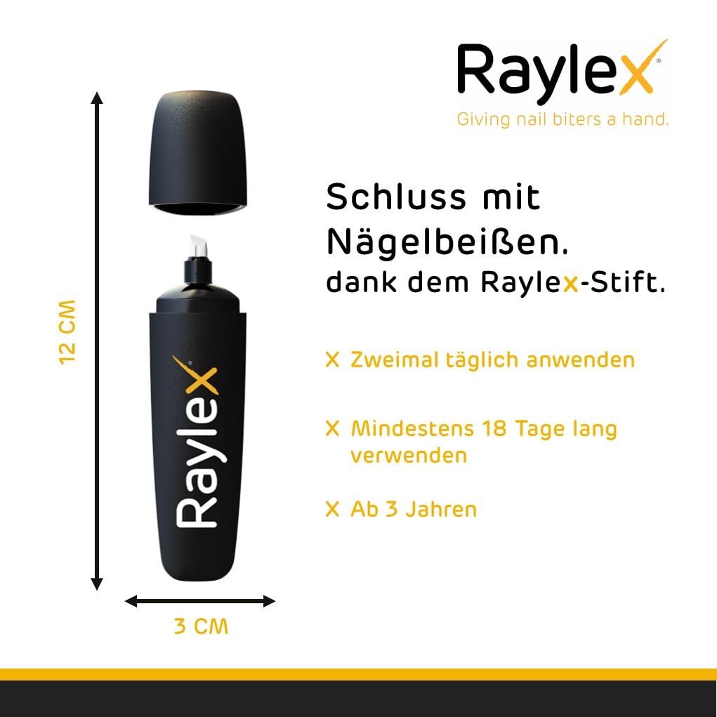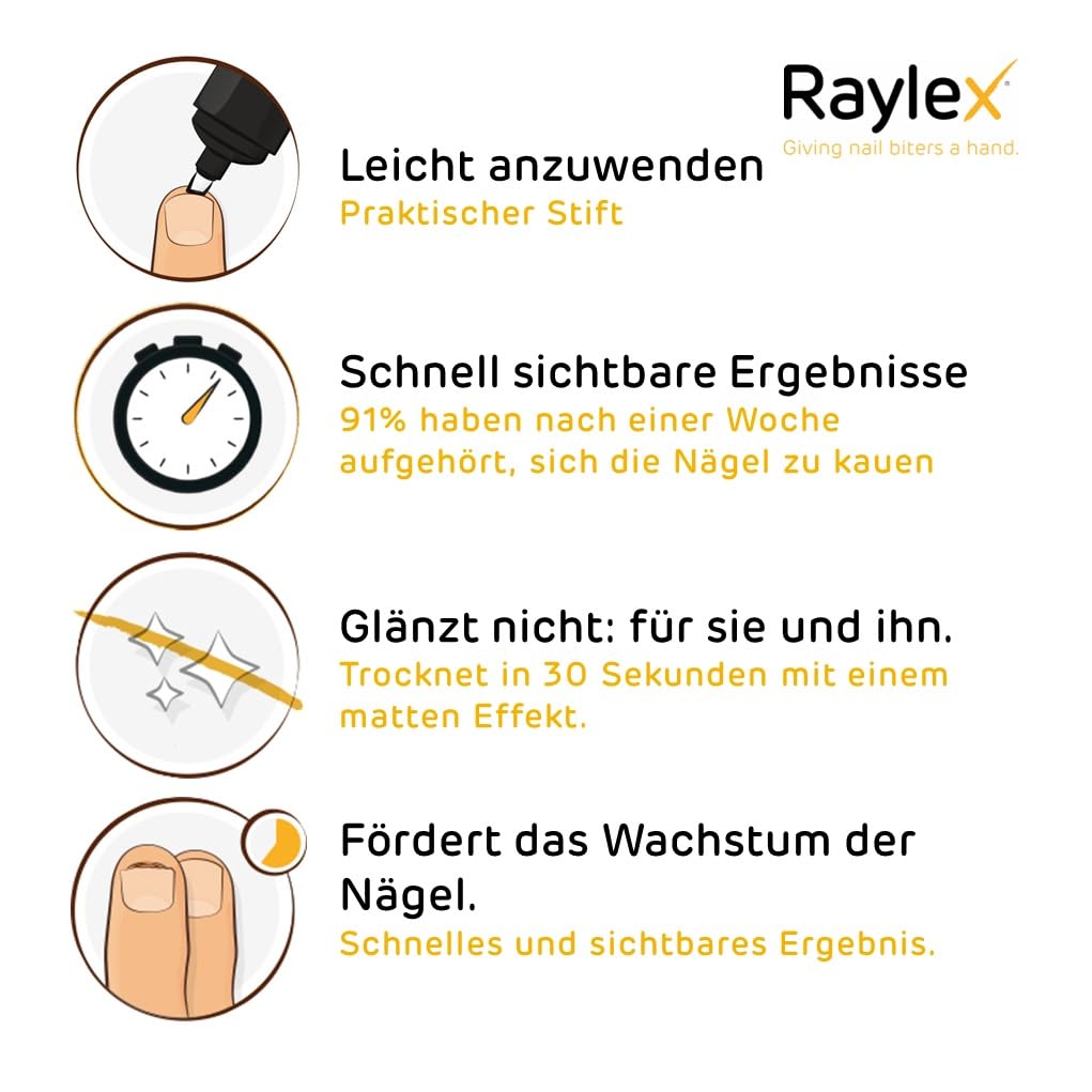 • Verwenden Sie Raylex täglich, um effektive Ergebnisse beim Abgewöhnen des Nagelbeissens zu erzielen.