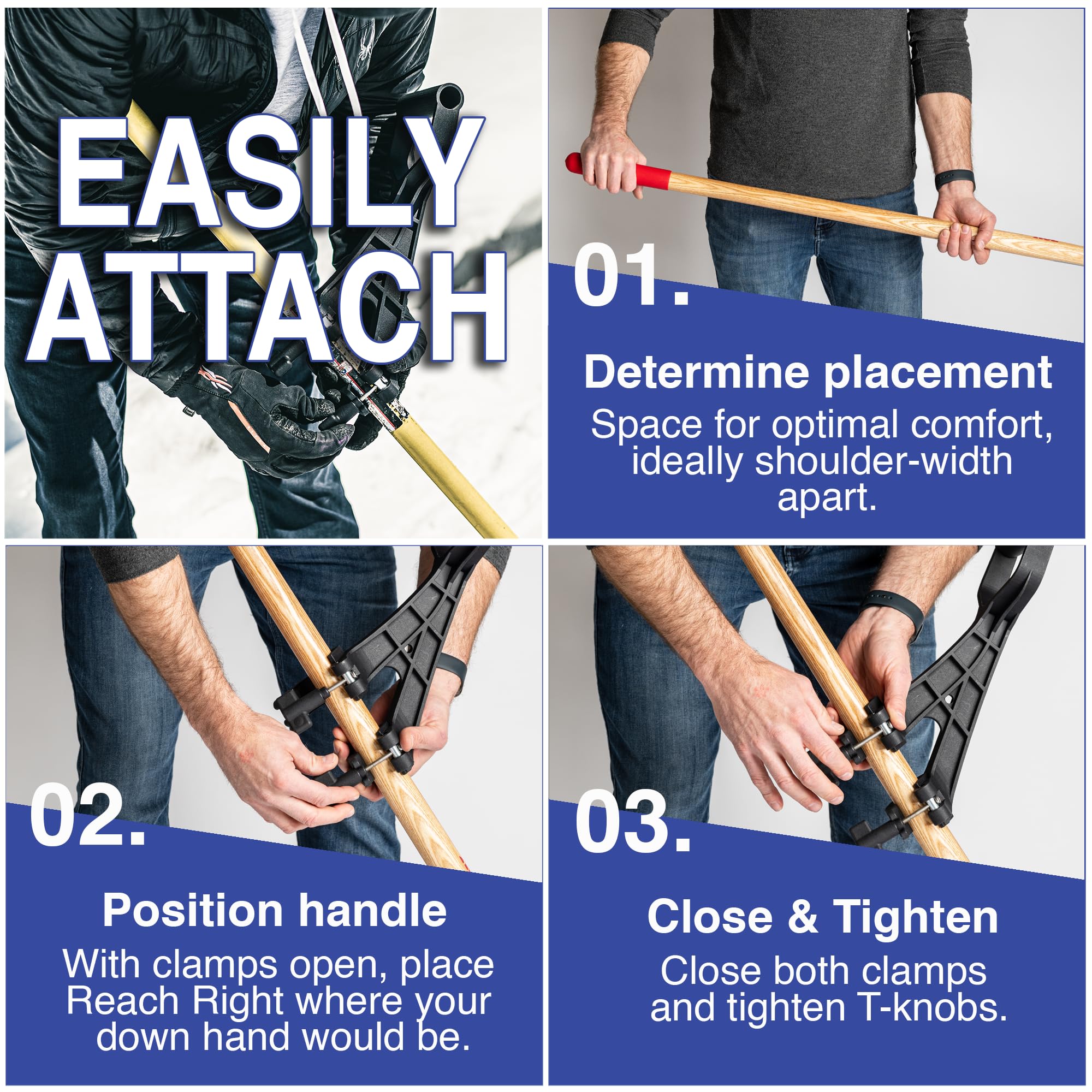 Reach Right ist ein ergonomischer Sekundärgriff, der schnell, einfach und sicher an jeder Schaufel, Rechen oder Langstiel-Werkzeug mit einem Griffdurchmesser zwischen 38,1 cm und 3,8 cm befestigt oder von ihnen entfernt werden kann. Reach Right reduziert die Belastung des Bückens, um eine Schaufel, Rechen oder ein Werkzeug mit langem Griff zu verwenden, indem es Ihre Reichweite erweitert und Sie aufrecht hält. Reach Right is lightweight; engineered for extreme pushing, pulling and lifting; and guaranteed to increase work performance and productivity or your money back. 2 Stück.