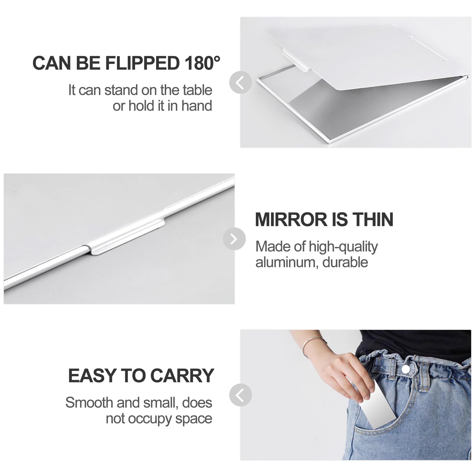 Dank des klappbaren Designs sind die Spiegel leicht zu verstauen und bieten gleichzeitig Schutz der Spiegeloberfläche, wenn sie nicht benutzt werden. Trotz der kompakten Grösse liefern sie eine klare Spiegelung für schnelle Kontrollen, präzises Make-up oder kleine Korrekturen unterwegs.