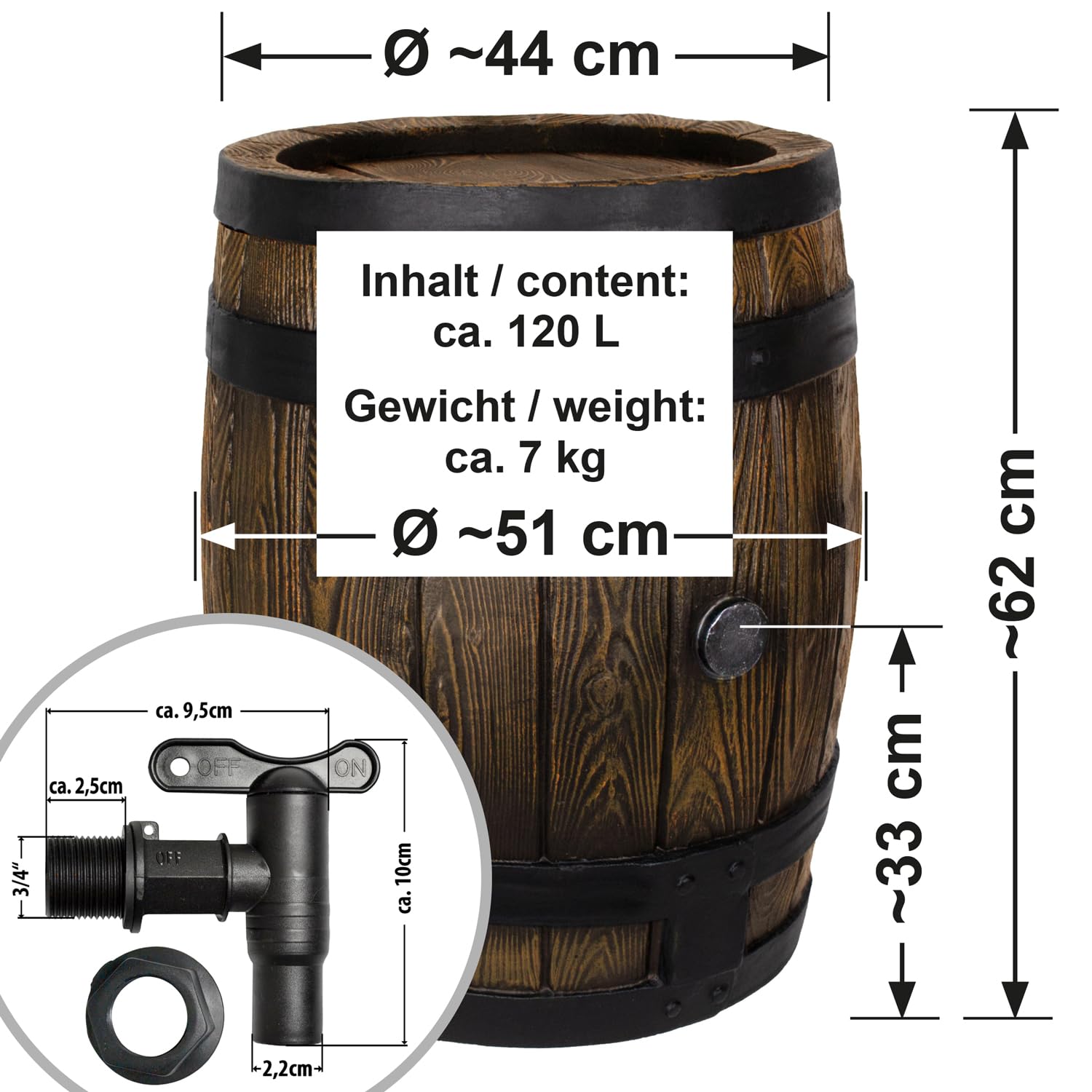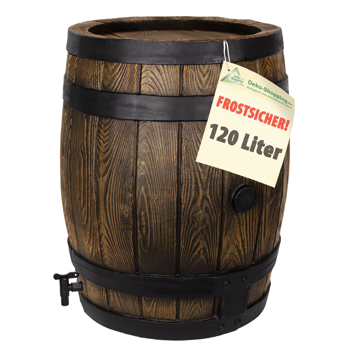 Das Regefass ist nach Meinung unserer Kunden das schönste Regenfass unter allen Regenfässern! Das rustikale "Eichenfass" in voller Schönheit! Als Regentonne, als Theke im Garten oder Weihnachtsmarkt, als Ordnungskiste für Spielzeug oder Gartenutensilien oder...oder...oder... Ein Schmuckstück für Heim und Garten - und nützlich!Diese Regentonnen überzeugen nicht nur in Funktion, sondern auch im Design und den langlebigen Produkteigenschaften. Durch das einzigartige Herstellungsverfahren wurde die Holzstruktur nicht nur optisch, sondern auch fühlbar nachgebildet. Die Regentonne Eichenfass ist eine einmalige Anschaffung, die selbst nach Jahren noch dauerhaft dicht und witterungsbeständig ist.Viele gute Gründe, warum Sie dieses einmalige Produkt kaufen sollten: