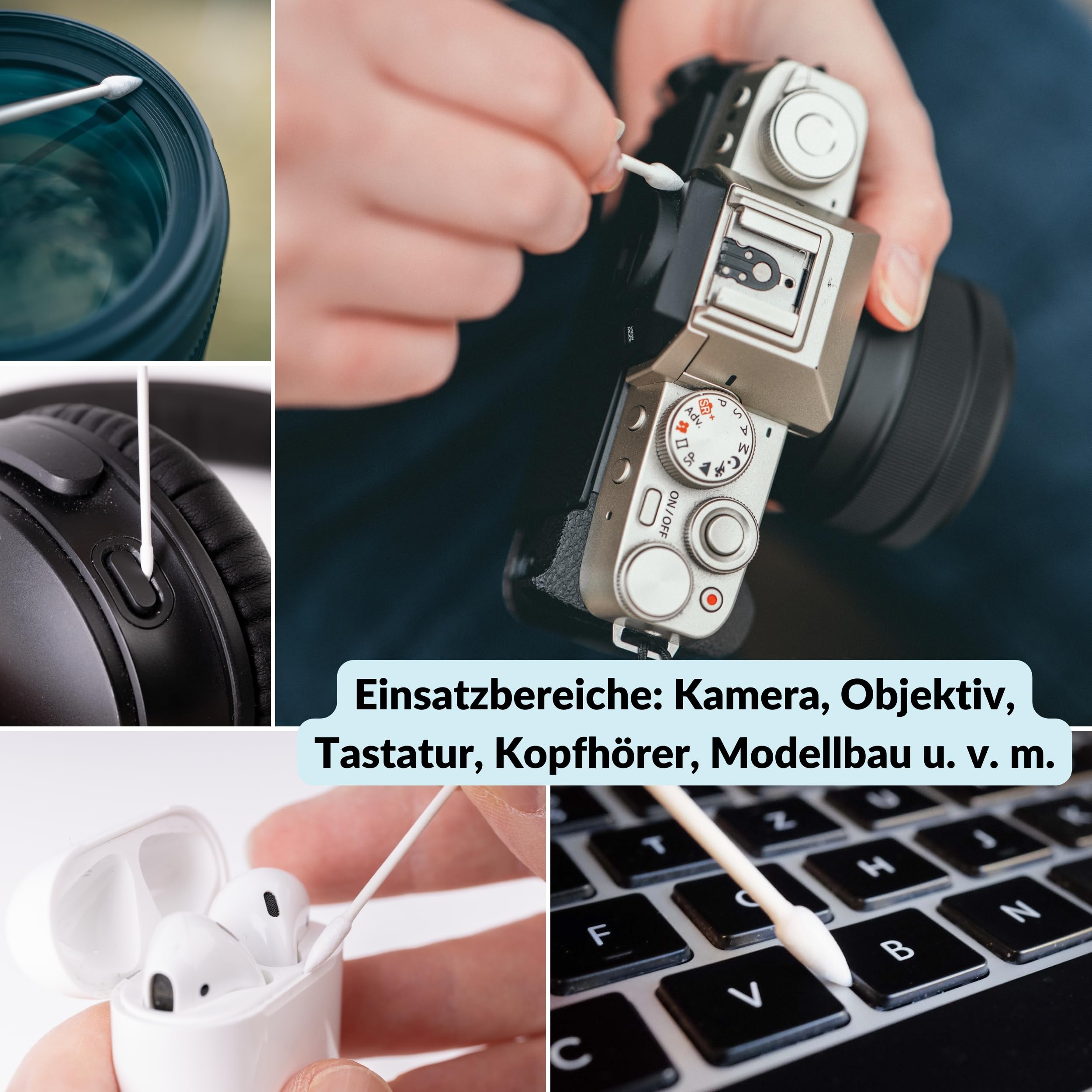 Im Vergleich zu herkömmlichen Wattestäbchen sind diese mit einer Spitze ausgestattet. Dadurch können Sie Kanten, Spalten und Rillen reinigen, die normalerweise schwer zugänglich sind. Nun, nicht mehr! Benutzen Sie diese Sticks für die Kamera, Displaykanten, Tastaturen, den Modellbau oder auch zum Basteln. Anwendung: Foto / Kamera / Objektiv / Drohnen PC / Laptop / Tastatur / Maus Handy / Smartphone / Tablet Modellbau / RC-Modellbau / Basteln / Klebereste / Farbreste / Lackieren Kosmetik / Maniküre / Pediküre / Nägel Lackieren Details: Reinigungsstäbchen zur präzisen Reinigung nass und trocken anwendbar (wir empfehlen, die Spitzen leicht anzufeuchten) weiches Material: 100 % Baumwolle (Spitzen) einfache Handhabung bei der Reinigung Inhalt: 150 Stück. k (luft- und staubdicht) Abmessungen: Gesamtlänge: 80 mm Länge der Spitze: 11 mm Dickster Durchmesser der Spitze: 4,7 mm Packungsinhalt: 50 Stück Grösse S 50 Stück Grösse M 50 Stück Grösse L Hinweis: Lieferung ohne abgebildetes Zubehör .