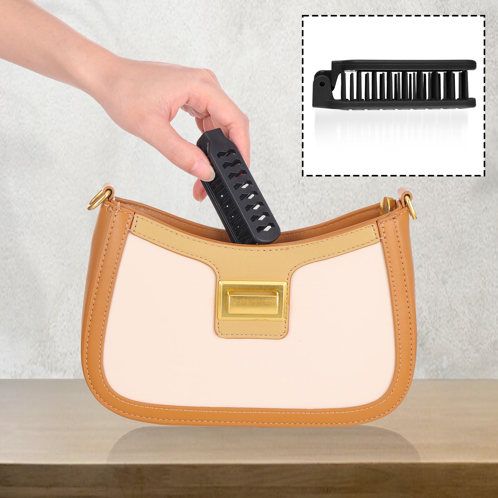 Die Bürste lässt sich zusammenklappen, wodurch sie besonders platzsparend in Handtasche, Rucksack oder Kosmetiktasche verstaut werden kann. Mit einem Gewicht von wenigen Gramm ist sie ideal für unterwegs, auf Reisen oder beim Sport.