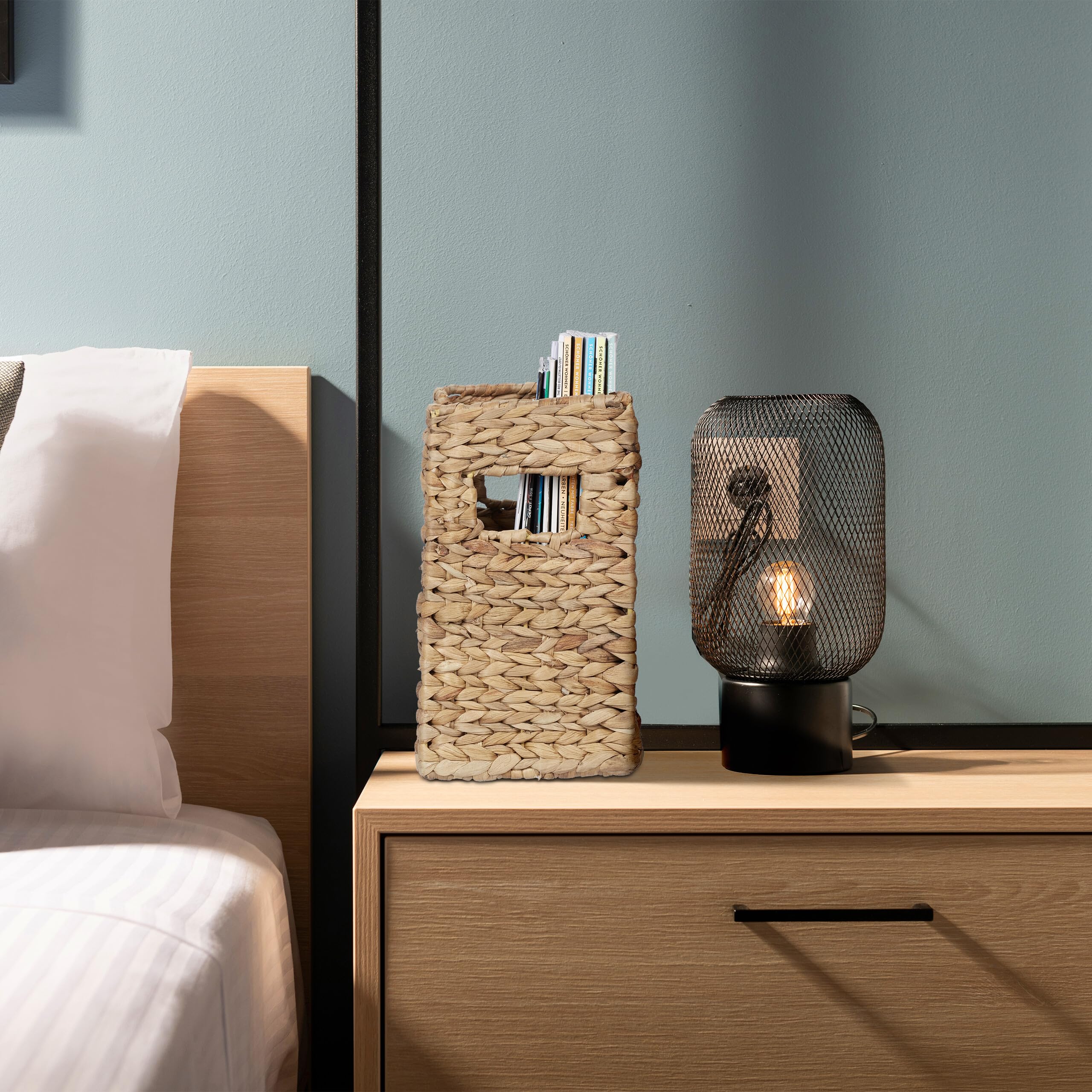 Herumliegende Zeitschriften gehören mit diesem Magazinhalter der Vergangenheit an. Dank seiner Grösse eignet sich der Zeitungsständer besonders für Ecken und Nischen. Dabei bietet er viel Platz für Magazine, Zeitungen und Zeitschriften. Auch zum Sammeln von Dokumenten auf dem Schreibtisch lässt sich der Aufbewahrungskorb wunderbar verwenden. Aber nicht nur funktional punktet der Zeitschriftenhalter – das geflochtene Design aus Wasserhyazinthe verleiht dem Dokumentensammler einen besonderen Look.Zeitschriftenständer im Detail- Masse H x B x T: ca. 25 x 34,5 x 15,5 cm - Griffaussparungen H x B: ca. 4 x 8 cm- Gewicht: ca. 0,9 kg- Material: Wasserhyazinthe- Farbe: NaturZeitungsablage für Wohn- und Arbeitszimmer- Zeitschriften, Magazine und Zeitungen ordentlich aufbewahren- Natürliches, geflochtenes Design aus Wasserhyazinthe- Mit praktischen Griffen zum Tragen des Magazinständers- Ideal für Wohnzimmer, Arbeitszimmer, Küche oder Flur- Dank kompakter Grösse perfekt für kleine Ecken und Nischen- Auch als Dokumentensammler und SchreibtischorganizerLieferumfang- 1x Zeitungsständer- Dekoartikel sind nicht im Lieferumfang enthalten