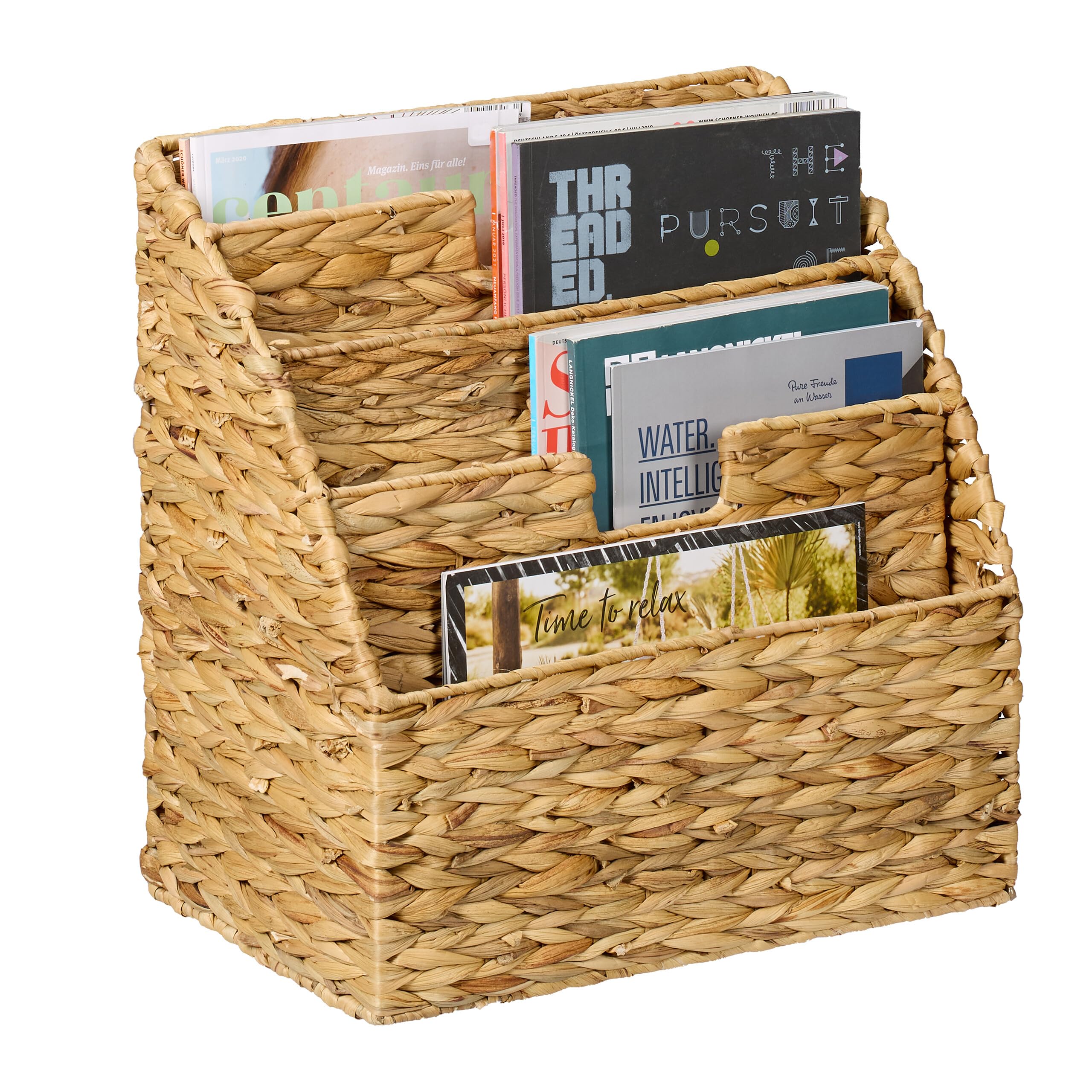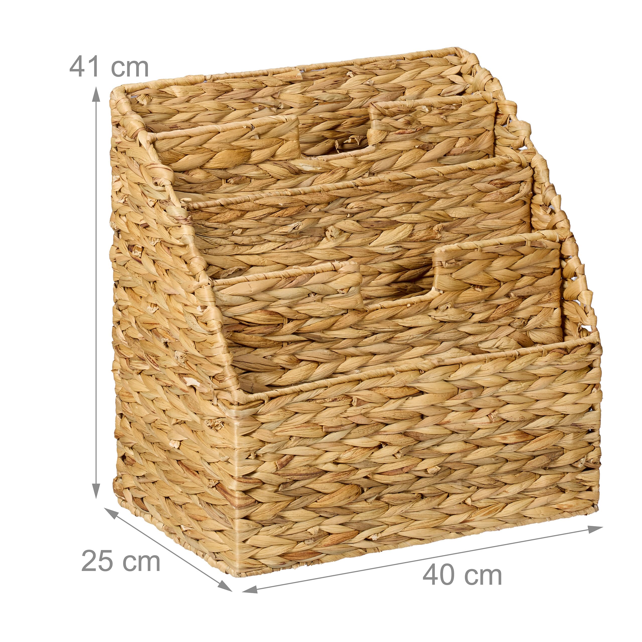 Relaxdays Zeitungsständer, Wasserhyazinthe, HxBxT: 41 x 40 x 25 cm, 4 Fächer, geflochtener Zeitschriftenständer, Natur
