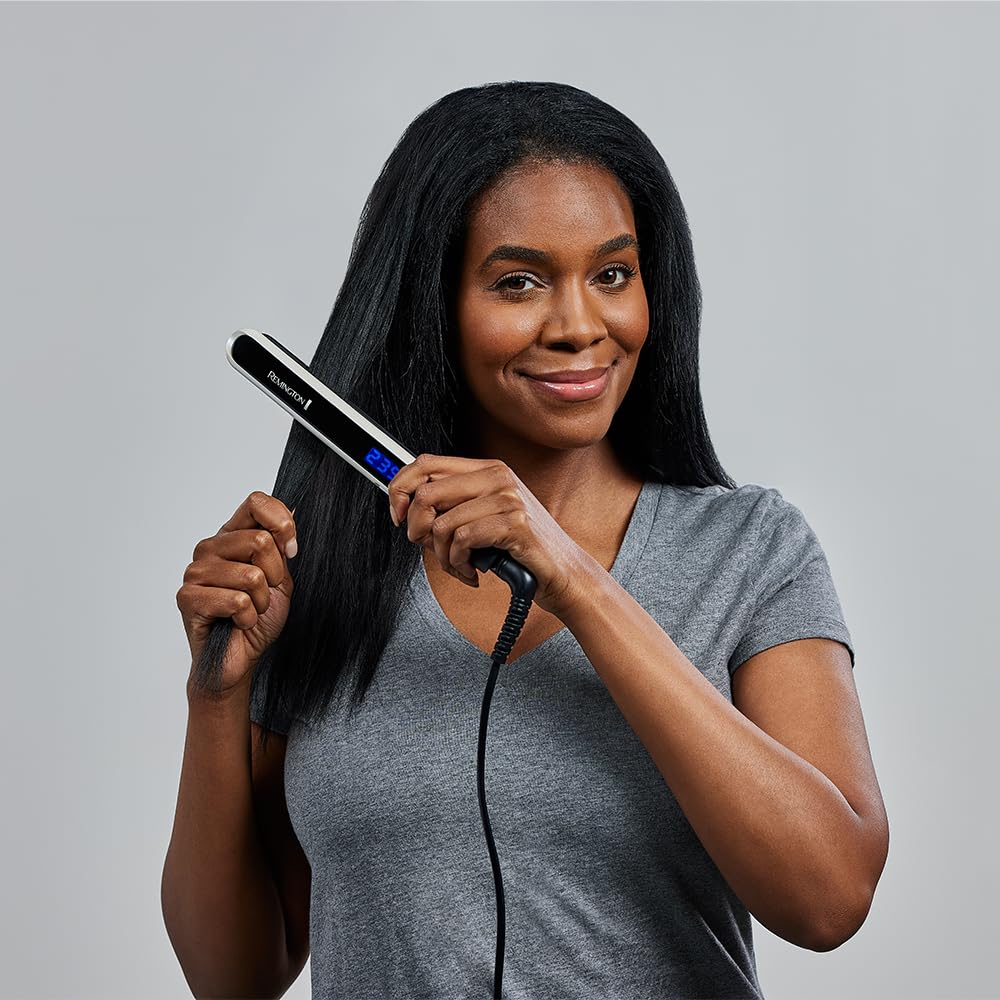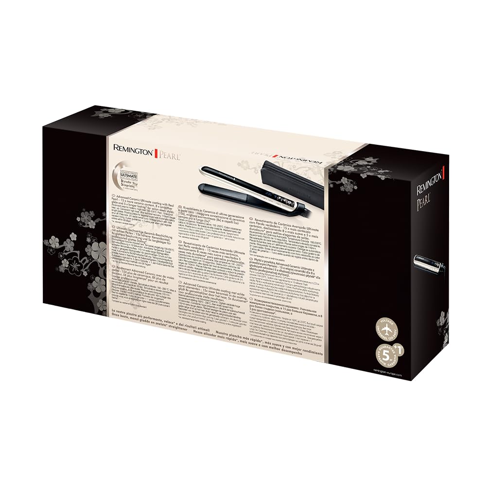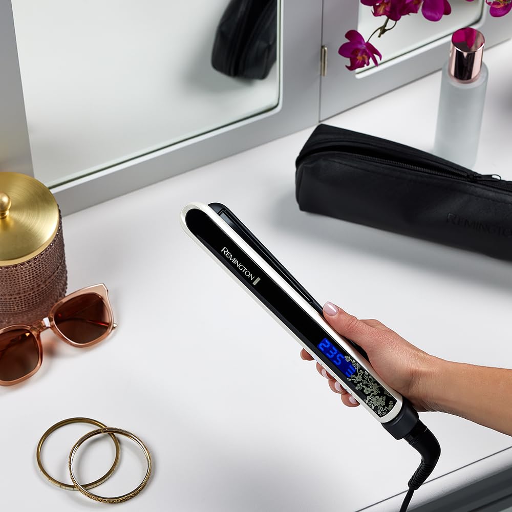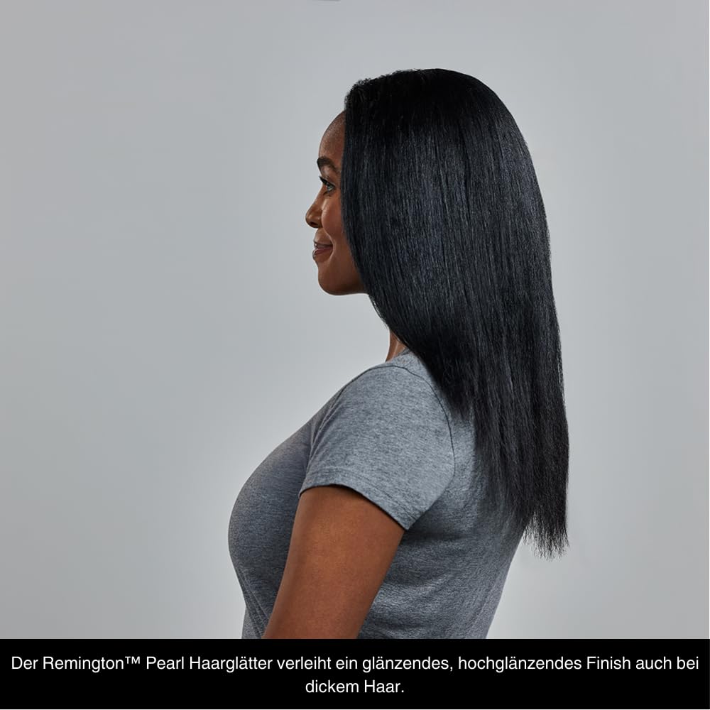 Remington Glätteisen [Testsieger] Pearl (hochwertige Keramikbeschichtung mit echten Perlen für eine gleichmässige Wärmeverteilung) LCD-Display, 150-235°C, inkl. Aufbewahrungstasche, Haarglätter S9501