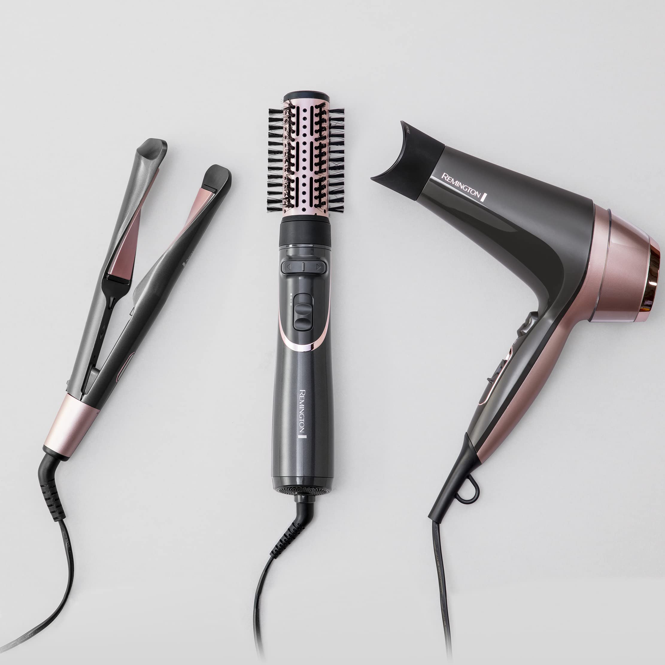 • 3 verschiedene Stylingaufsätze: schmale, ergonomisch geformte Düse zum Glätten, unsere einzigartige Locken-Stylingdüse für voluminöse Blow-Out Styles, Diffusor für natürliche Locken, sowie eine 45mm Rundbürste & zwei Haarklammern