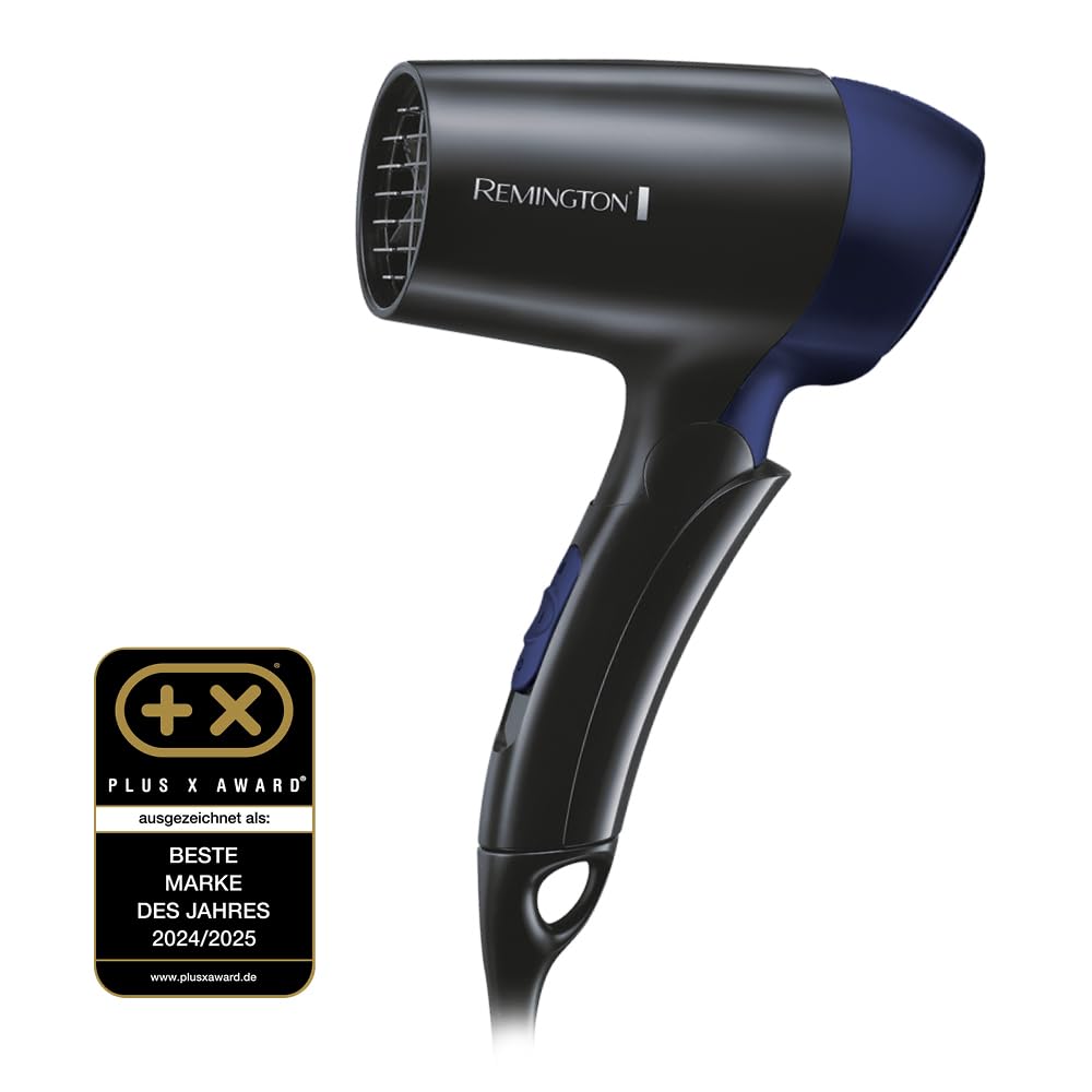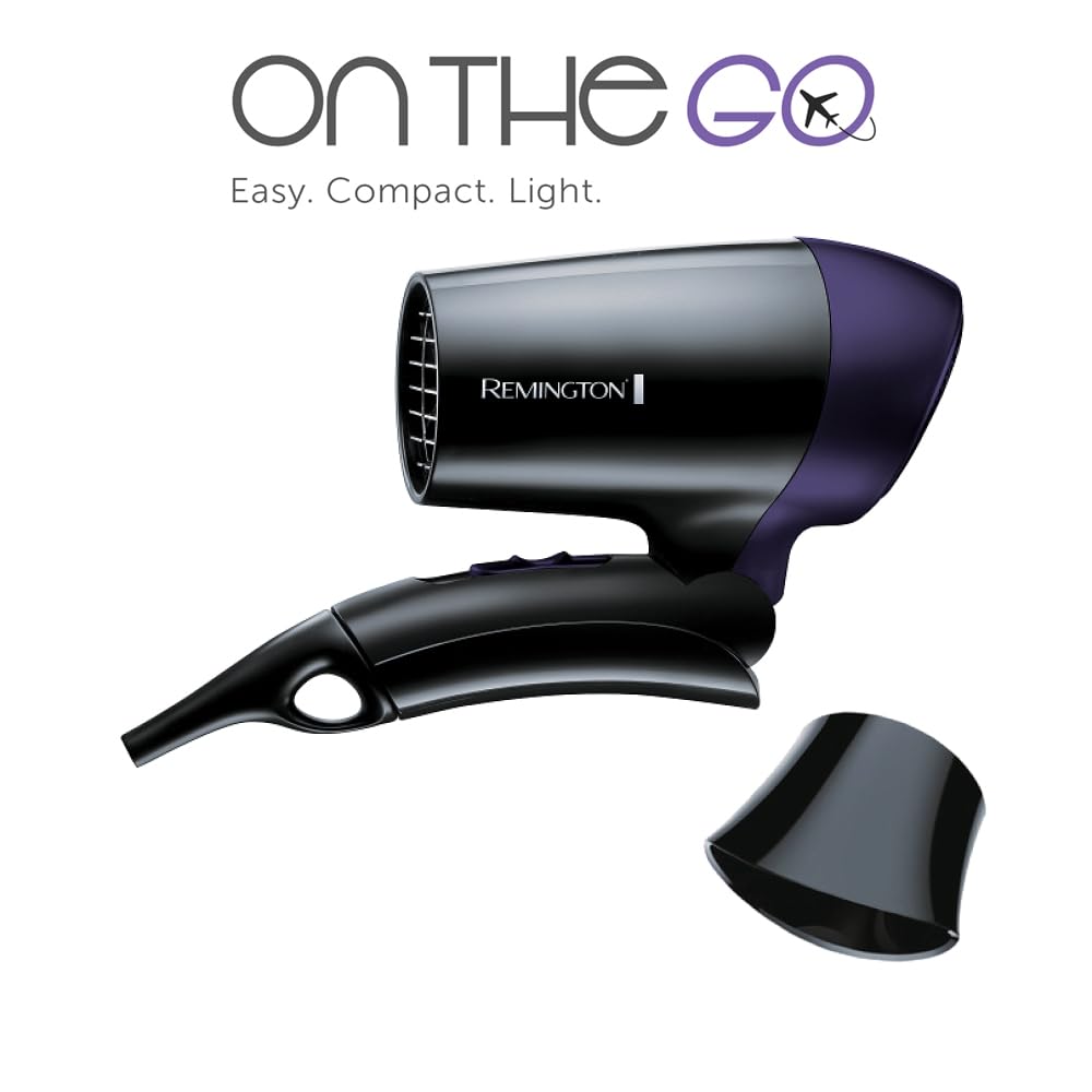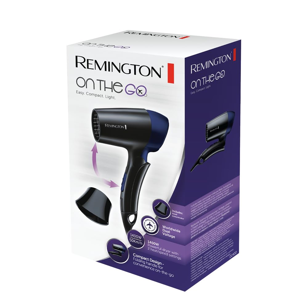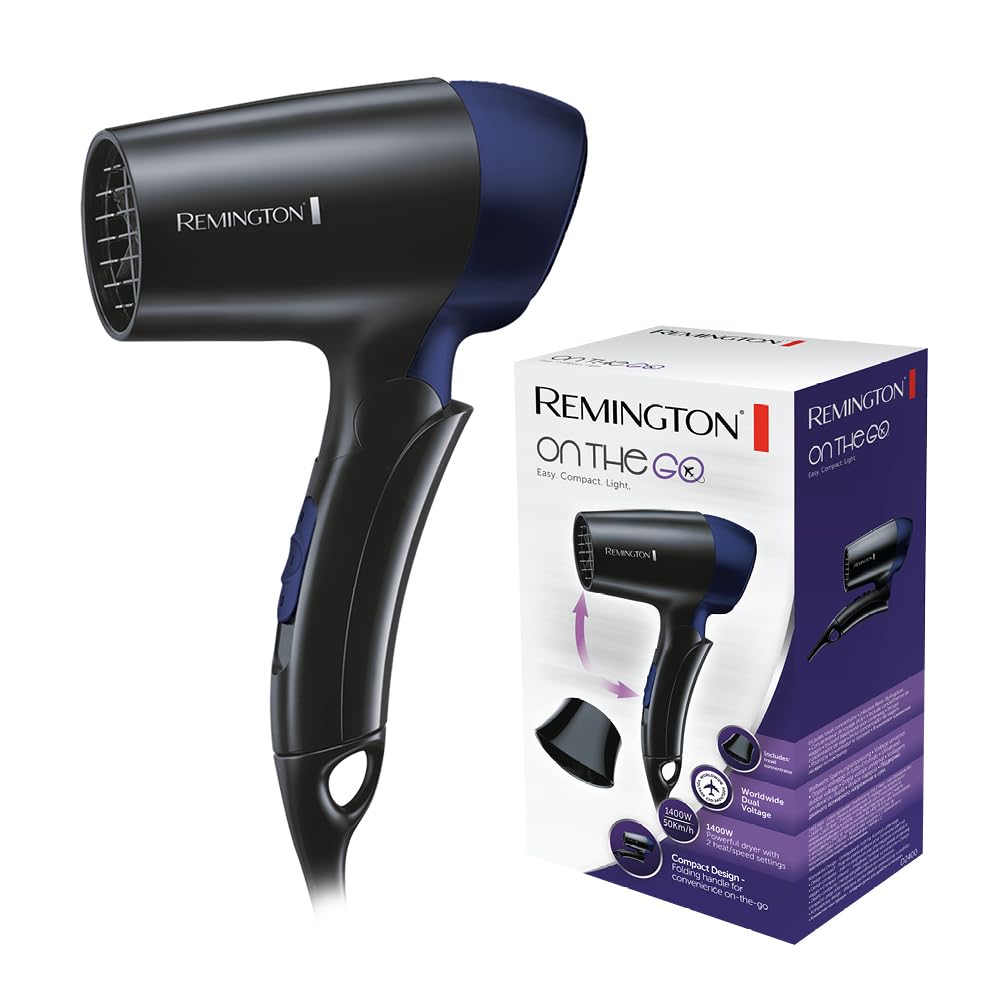 Remington Haartrockner [extrem klein & klappbar] On The Go (1400 W, weltweite Spannungsanpassung 120/220-240V, Stylingdüse, 2 kombinierte Heiz- & Gebläsestufen) Reisehaartrockner D2400