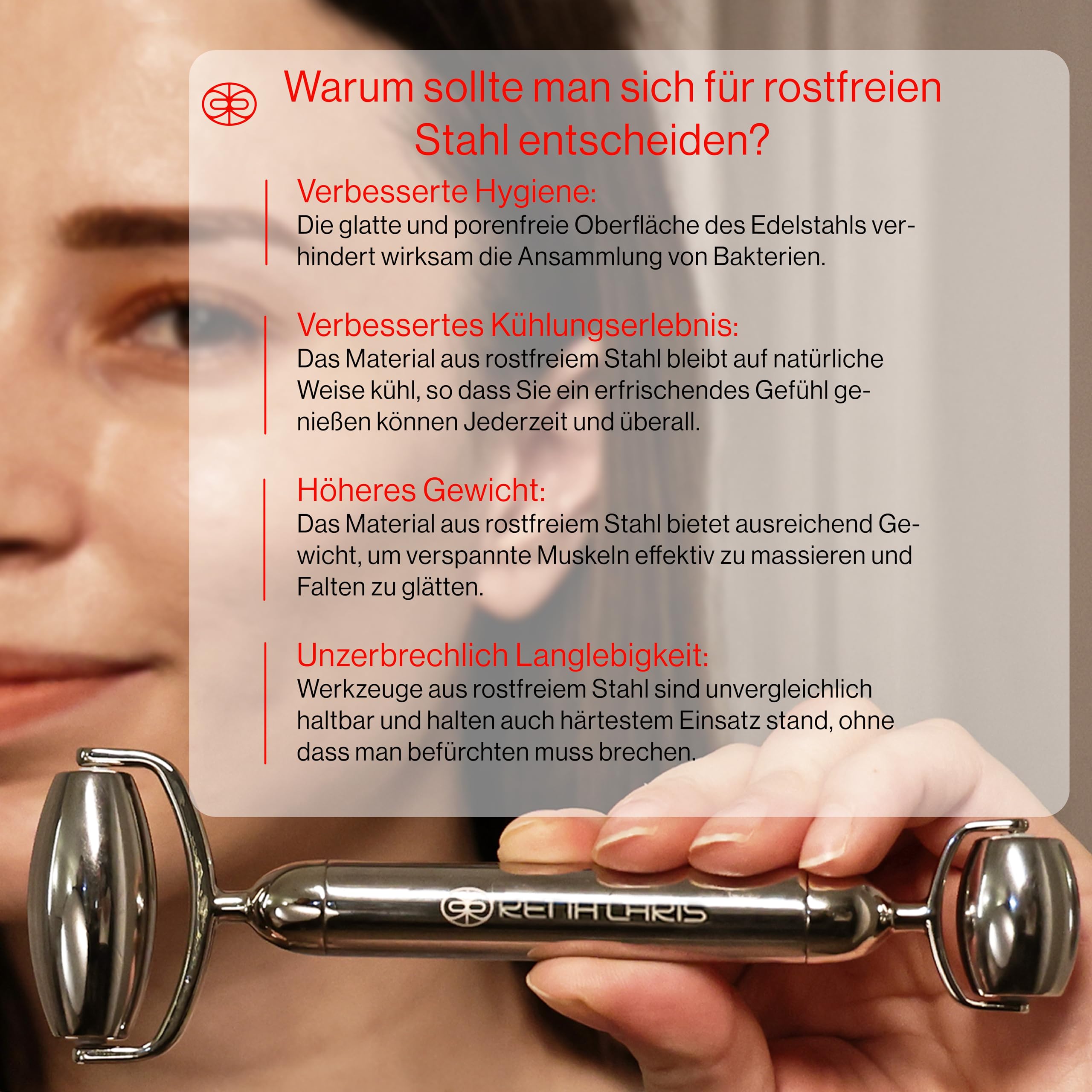 • Der kühlende Edelstahl beruhigt die Haut und reduziert Schwellungen, insbesondere nach dem Schlaf oder intensiven Tagen.