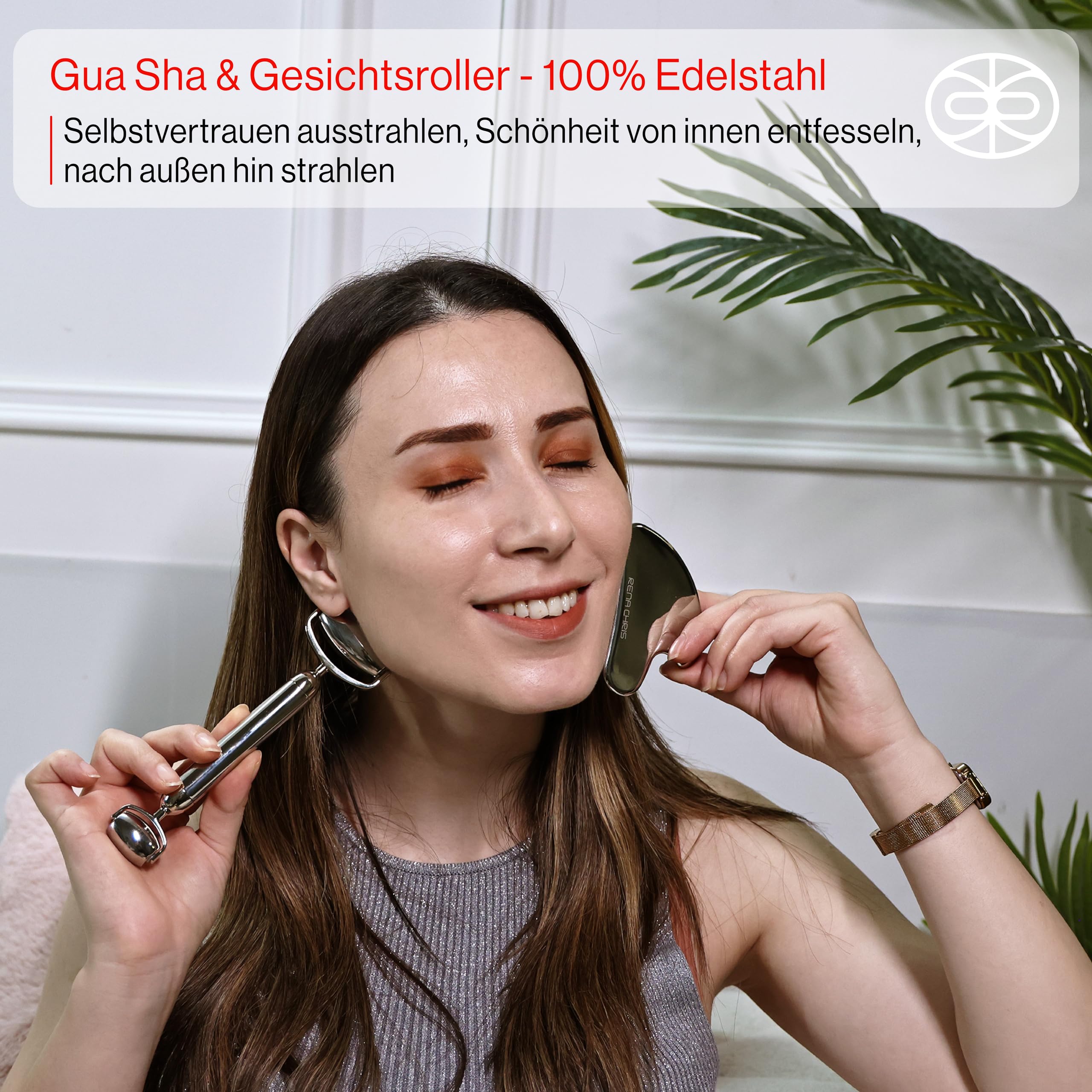 Rena Chris Gua Sha und Edelstahl Gesichtsroller – Manuelles Gesichtsmassagegerät und GuaSha Werkzeug, Jawline formen und Schwellungen reduzieren, Hautpflege Geschenk (Silber)