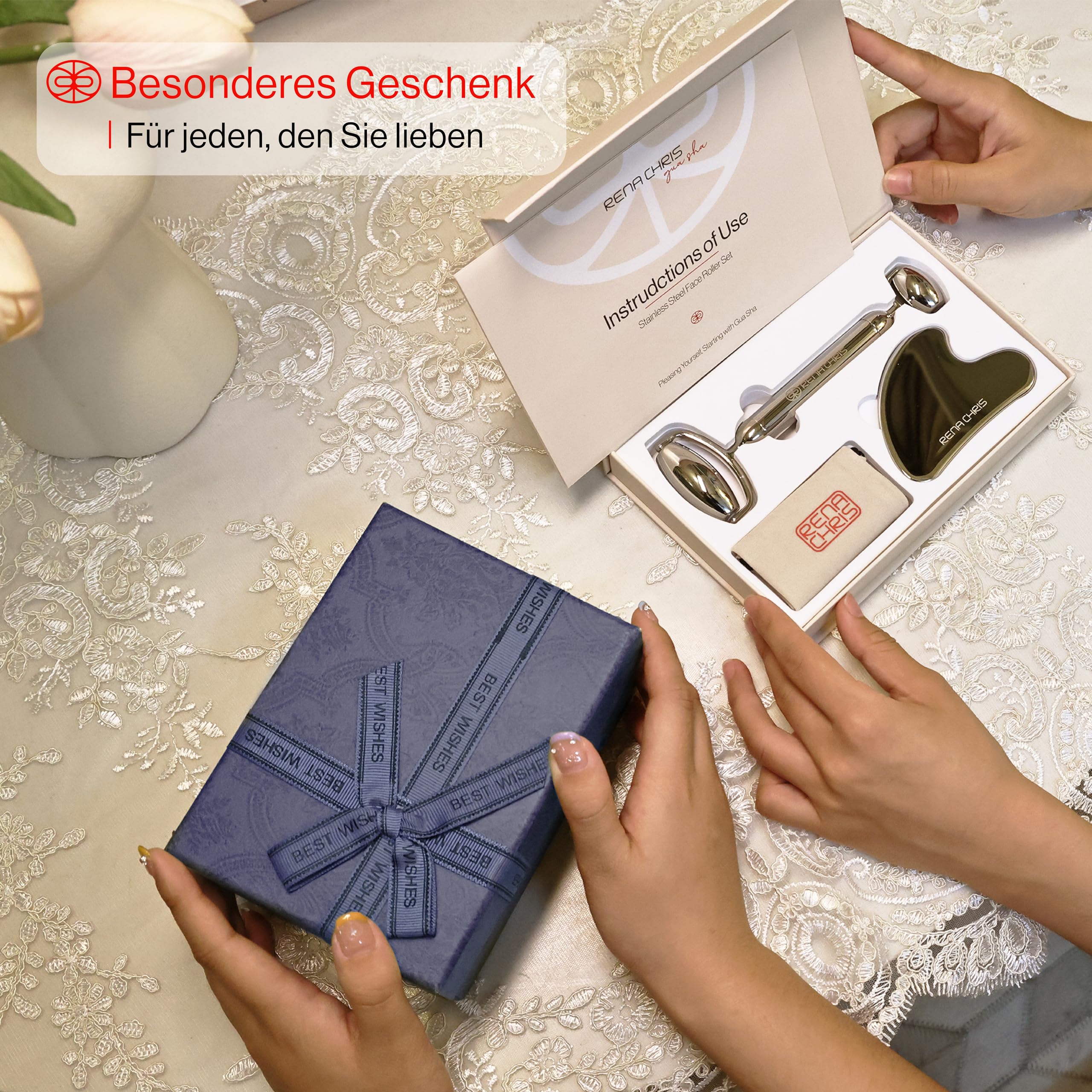 Das Rena Chris Gua Sha und Edelstahl Gesichtsroller Set ist ein hochwertiges Gesichtspflege‑Tool, das aus einem Edelstahl‑Gesichtsroller und einem Gua Sha Werkzeug besteht. Entwickelt, um die Kieferpartie (Jawline) zu formen, Schwellungen zu reduzieren und die Hautstruktur zu verbessern, bietet dieses Set eine professionelle Massageerfahrung für zu Hause. Es ist ein ideales Hautpflege Geschenk in elegantem Silber, das sichtbare Verbesserungen für ein strafferes, definierteres und entspannteres Hautbild erzielen kann.