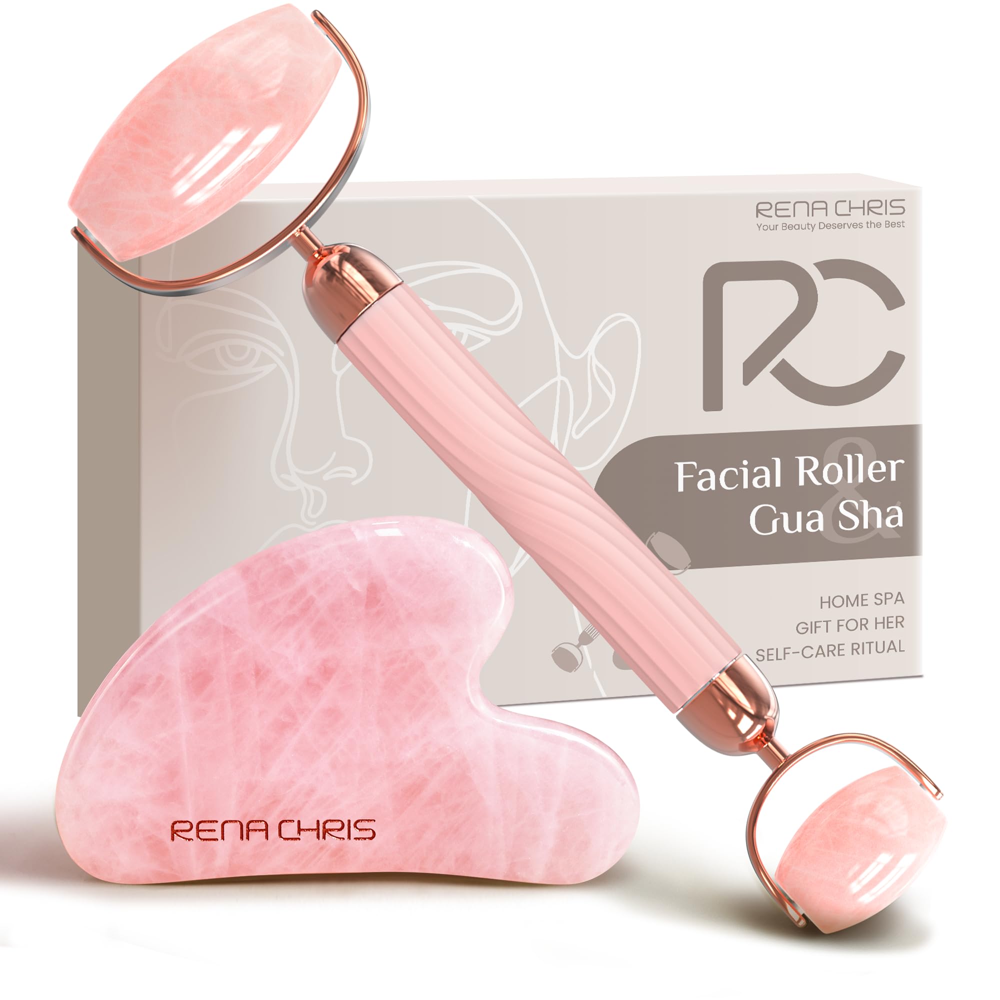 Rena Chris Gua Sha & Gesichtsroller Set – Anti-Bruch Jade-Roller für Kieferformung und Schwellungsreduzierung, Selbstpflege-Geschenk (Rose)