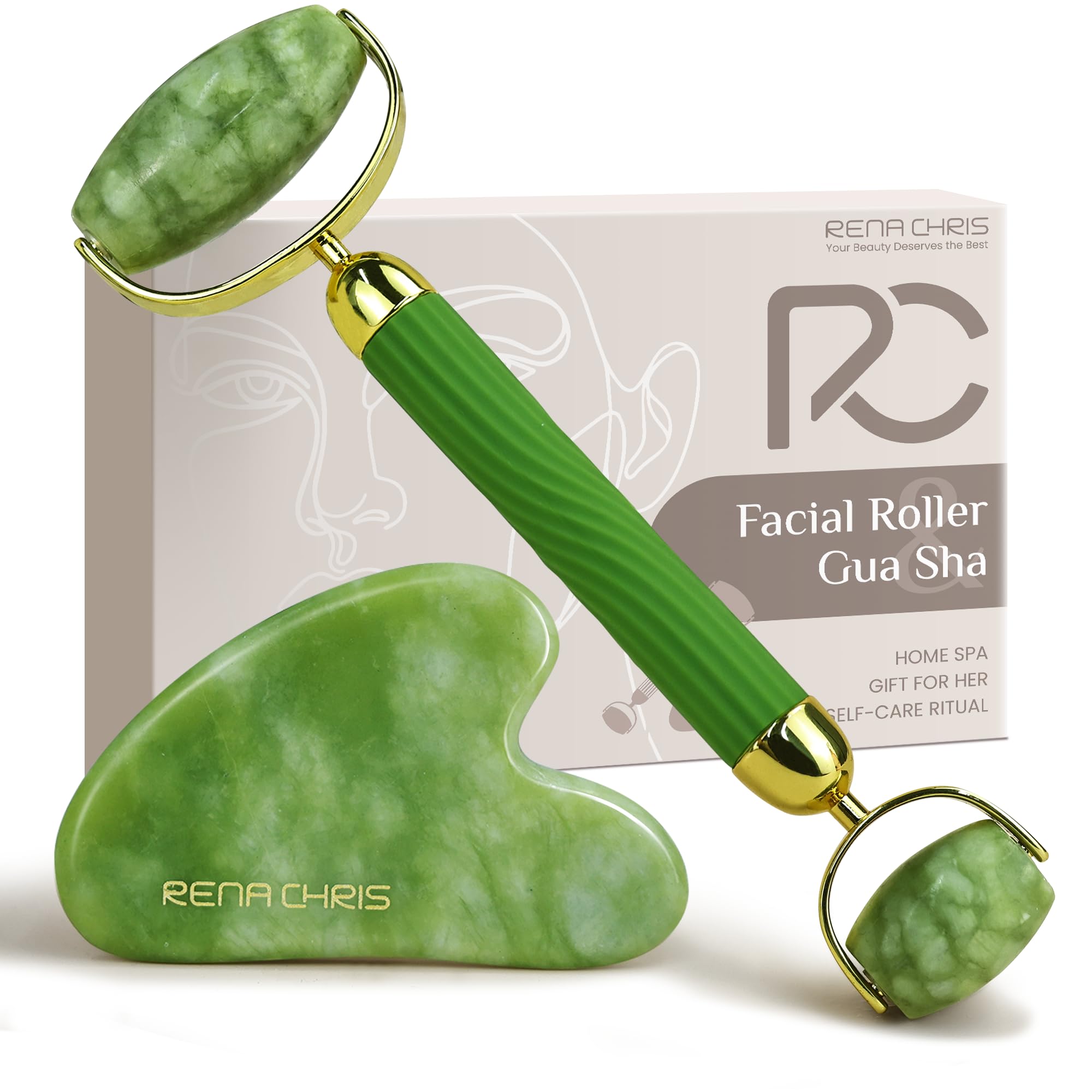 Rena Chris Jade Gua Sha Stein & Gesichtsroller Set – Natürliche Jade-Roller zur Kieferkonturierung und Schwellungsreduzierung, Hautpflegegeschenk