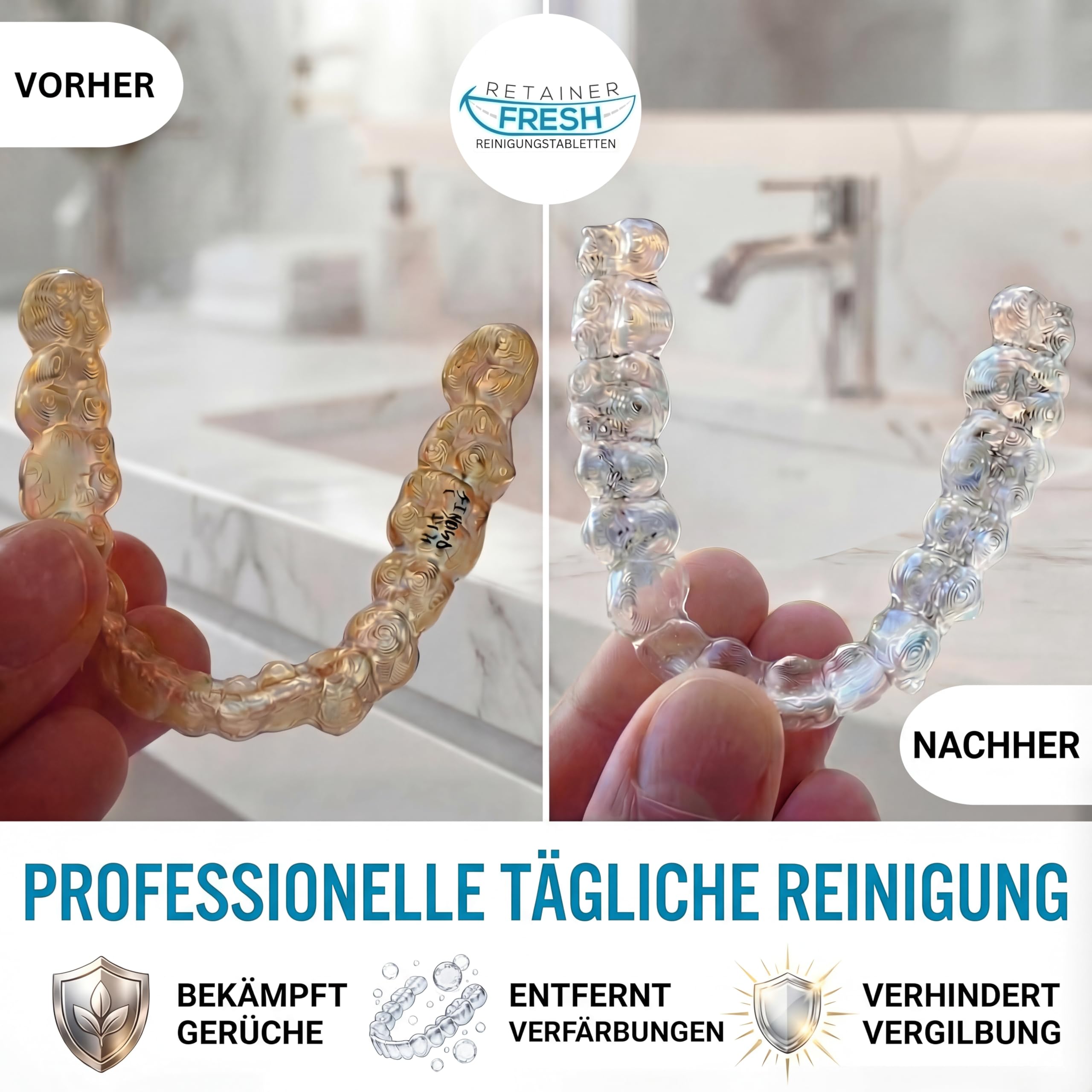 Retainer Reinigungstabletten – 120 Tabletten Retainer frisch, halten Sie Ihre Retainer und fleckenfrei – Retainer Reiniger Tablette, Mundschutz, gebissreiniger tabs, zahnschiene