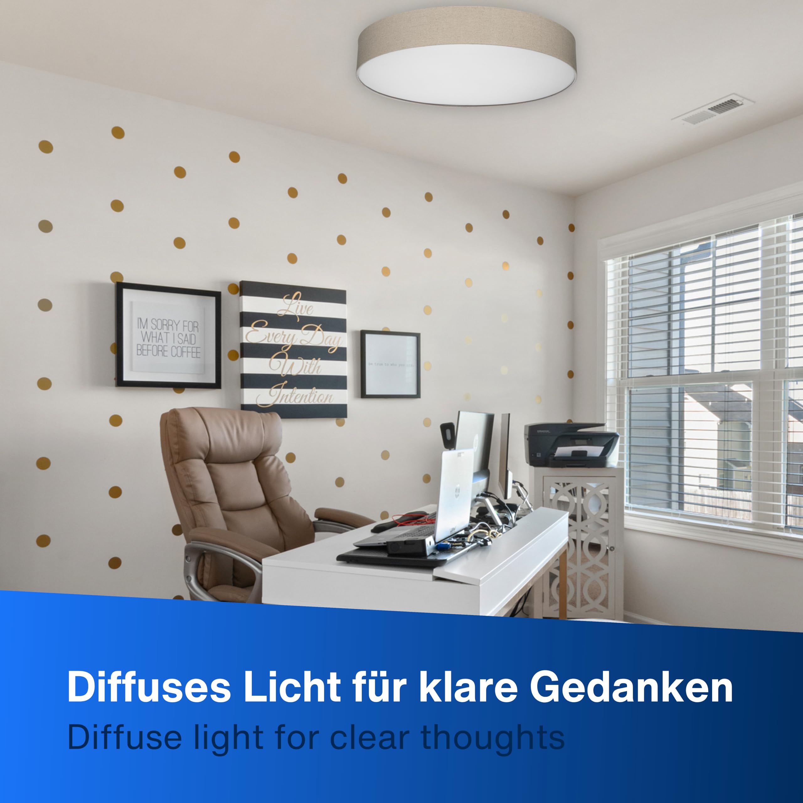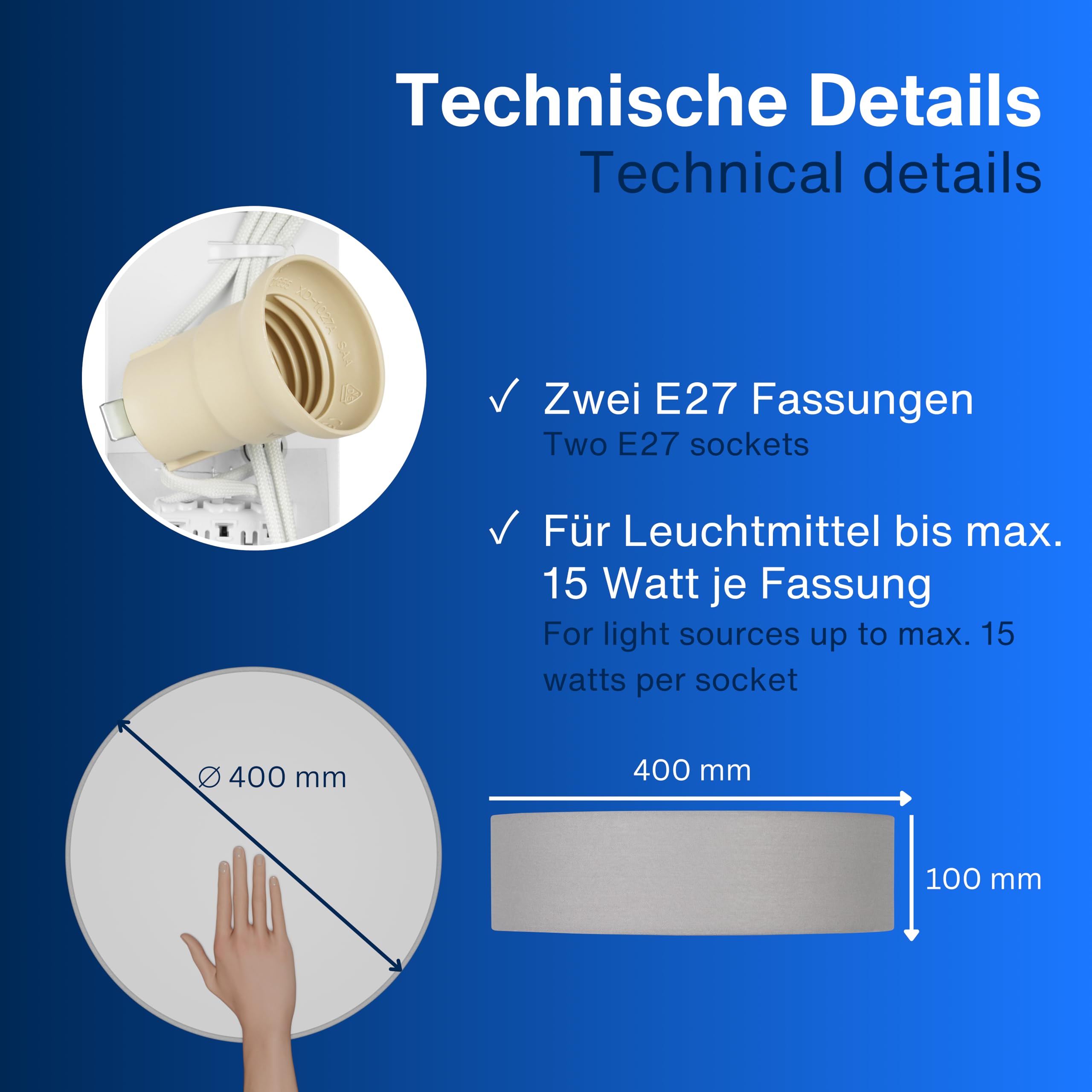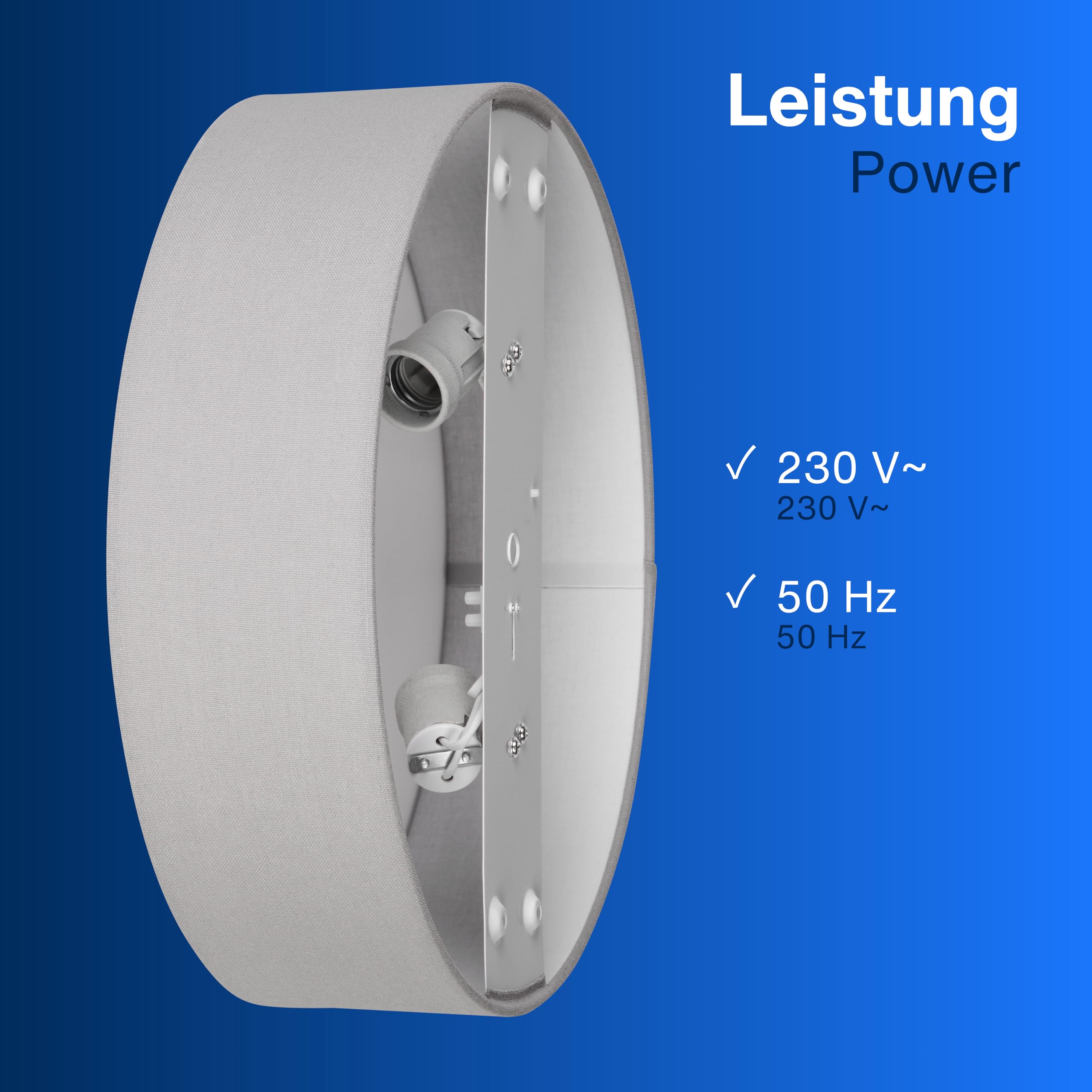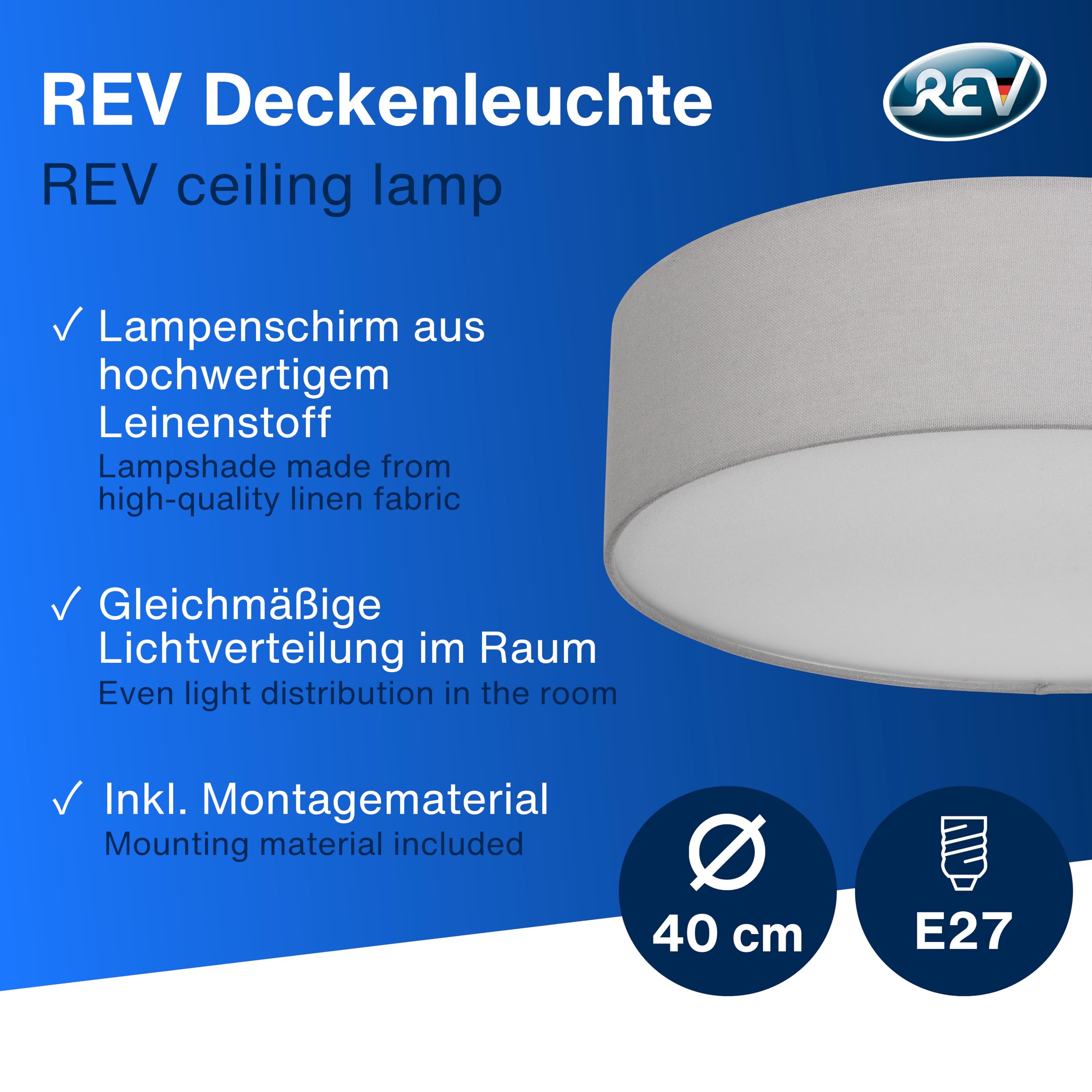 Klassisch & zeitlos: Unsere Deckenlampe verkörpert zeitlose Eleganz. Der Stoffbezug verleiht dem Licht eine sanfte Note, was für eine gemütliche Atmosphäre sorgt und zum Verweilen einlädt. Minimalistisches Design: Das charakteristische flache Profil der Lampe fügt sich nahtlos in verschiedene Einrichtungsstile ein. Dadurch passt sie hervorragend in Wohn-, Schlaf- oder Arbeitszimmer. Flexible Leuchtmittelwahl: Deckenlampe mit zwei E27 Fassungen (Lieferung erfolgt ohne Leuchtmittel). Wir empfehlen die Verwendung von stromsparenden LED Leuchtmitteln bis max. 15 Watt je Fassung. Gleichmässige Lichtverteilung: Der grau Lampenschirm aus strapazierfähigem, hochwertigem Leinenstoff sorgt für eine hohe Langlebigkeit sowie für eine gleichmässige Lichtverteilung im Raum. Kinderleichte Installation: Die LED Deckenleuchte ist dank des mitgelieferten Montagematerials schnell und einfach zu montieren. .