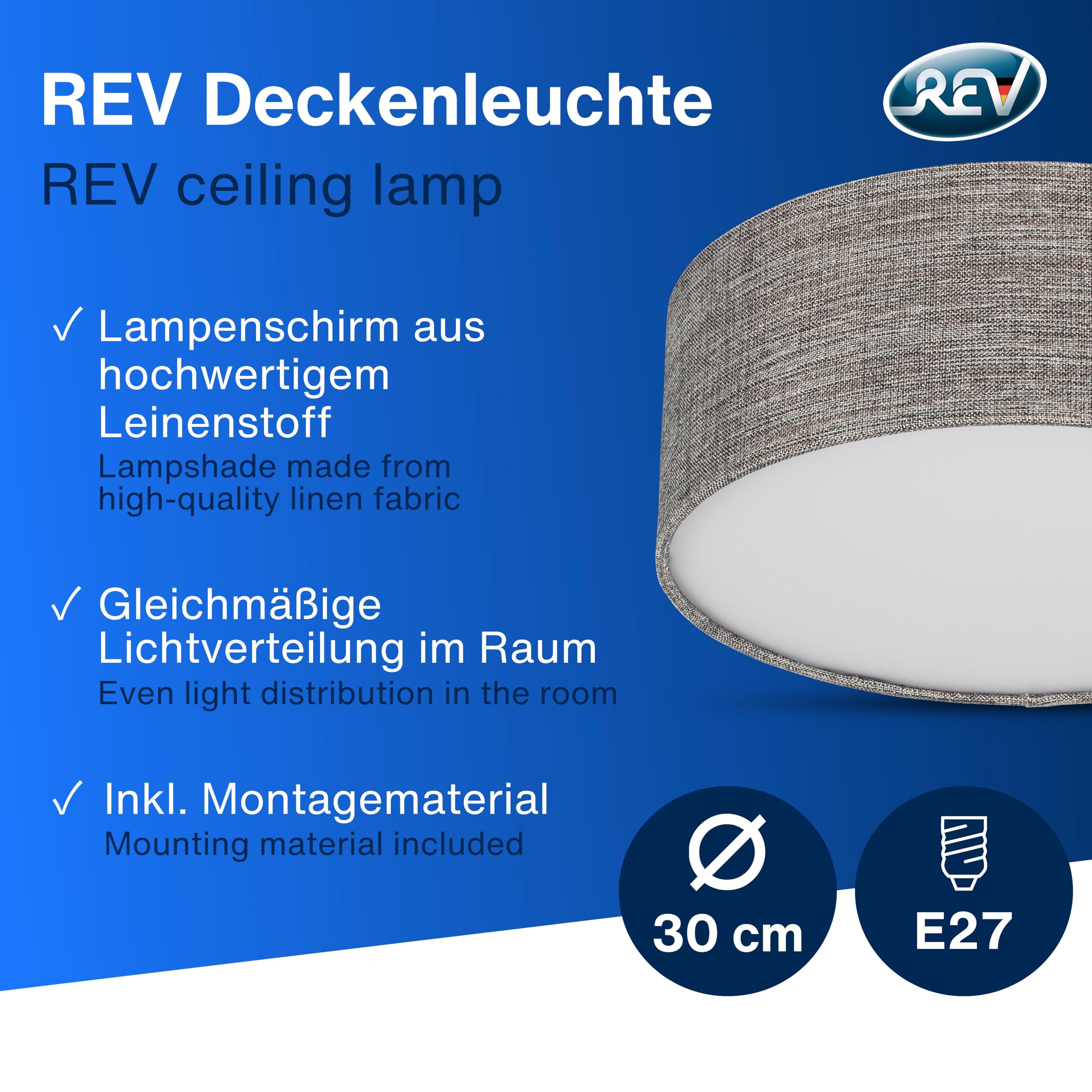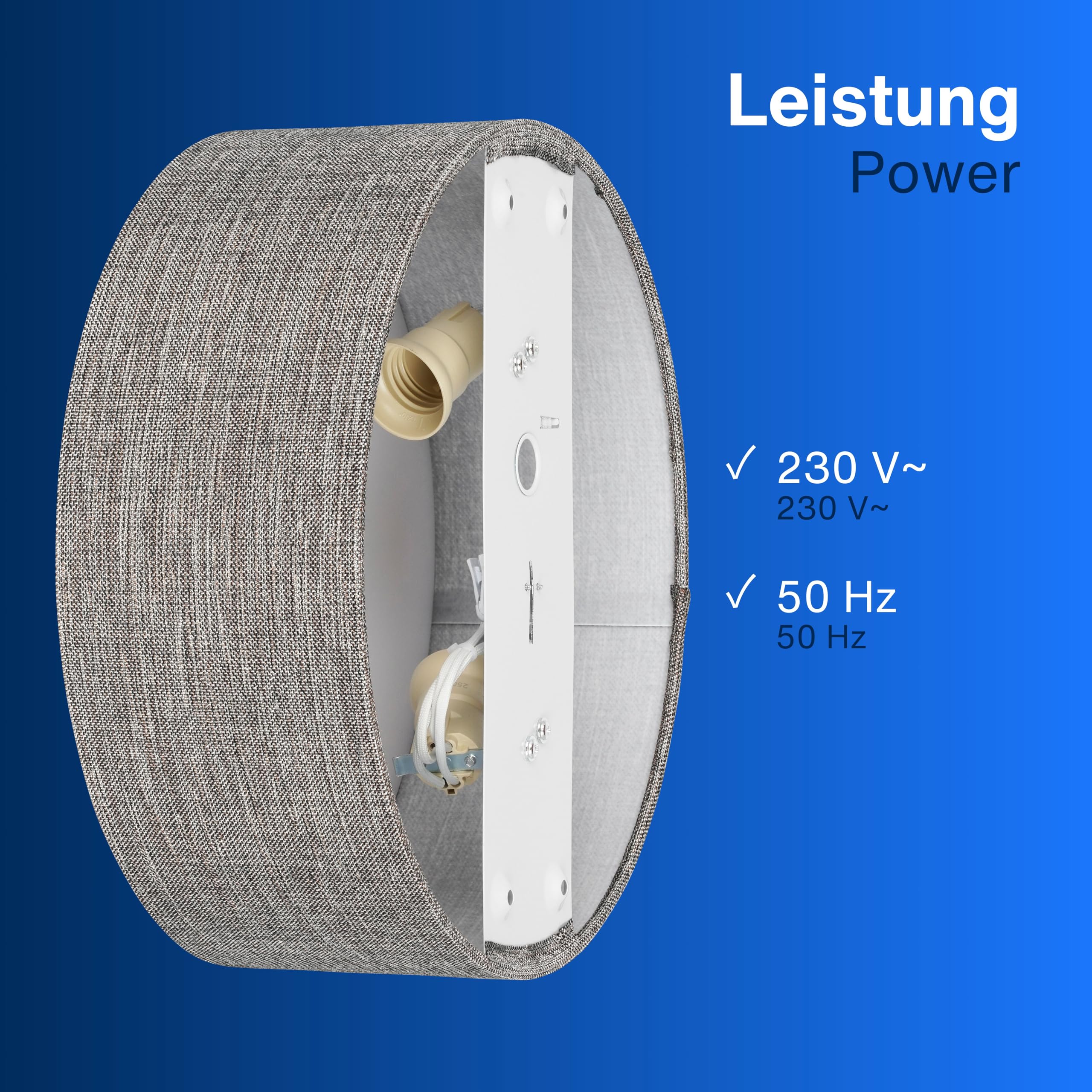 Klassisch & zeitlos: Unsere Deckenlampe verkörpert zeitlose Eleganz. Der Stoffbezug verleiht dem Licht eine sanfte Note, was für eine gemütliche Atmosphäre sorgt und zum Verweilen einlädt. Minimalistisches Design: Das charakteristische flache Profil der Lampe fügt sich nahtlos in verschiedene Einrichtungsstile ein. Dadurch passt sie hervorragend in Wohn-, Schlaf- oder Arbeitszimmer. Flexible Leuchtmittelwahl: Deckenlampe mit zwei E27 Fassungen (Lieferung erfolgt ohne Leuchtmittel). Wir empfehlen die Verwendung von stromsparenden LED Leuchtmitteln bis max. 15 Watt je Fassung. Gleichmässige Lichtverteilung: Der türkis-silberne Lampenschirm aus strapazierfähigem, hochwertigem Leinenstoff sorgt für eine hohe Langlebigkeit sowie für eine gleichmässige Lichtverteilung im Raum. Kinderleichte Installation: Die LED Deckenleuchte ist dank des mitgelieferten Montagematerials schnell und einfach zu montieren.