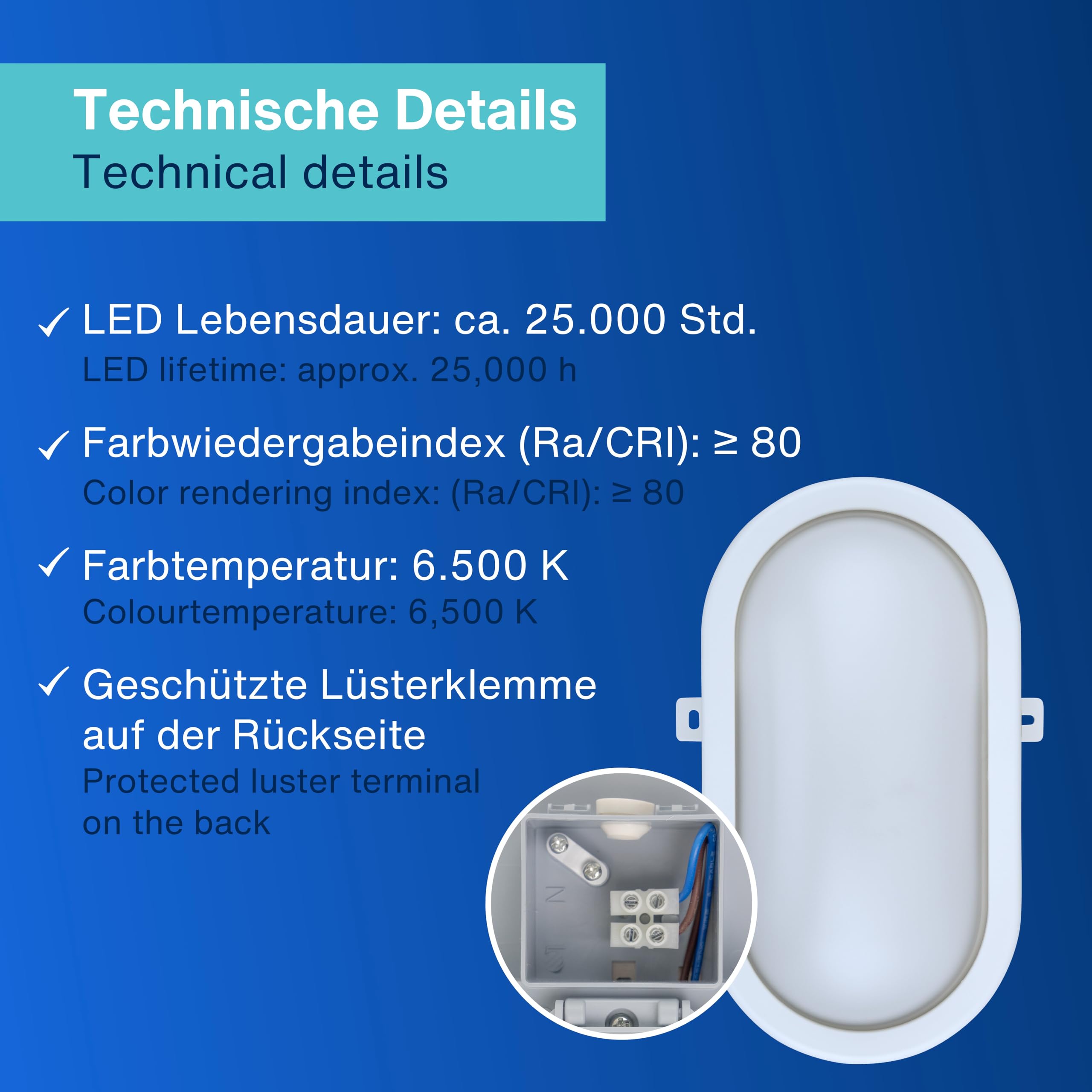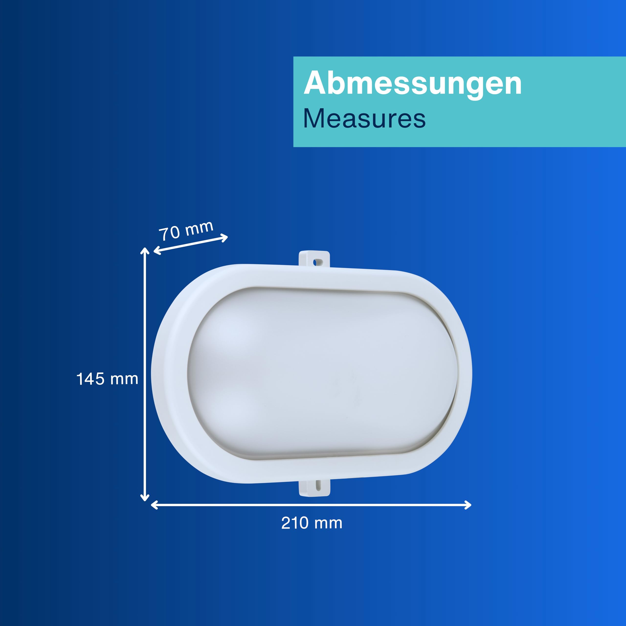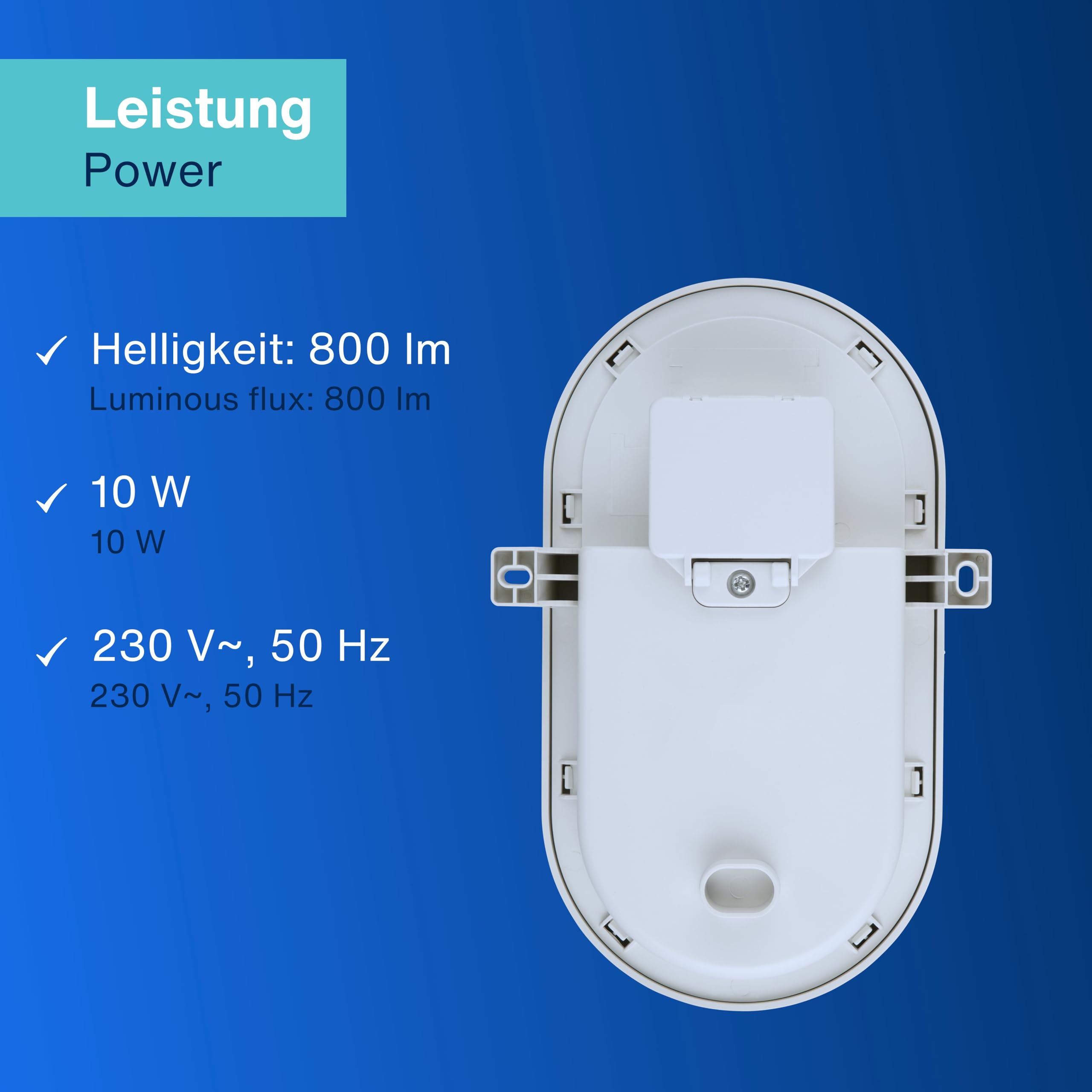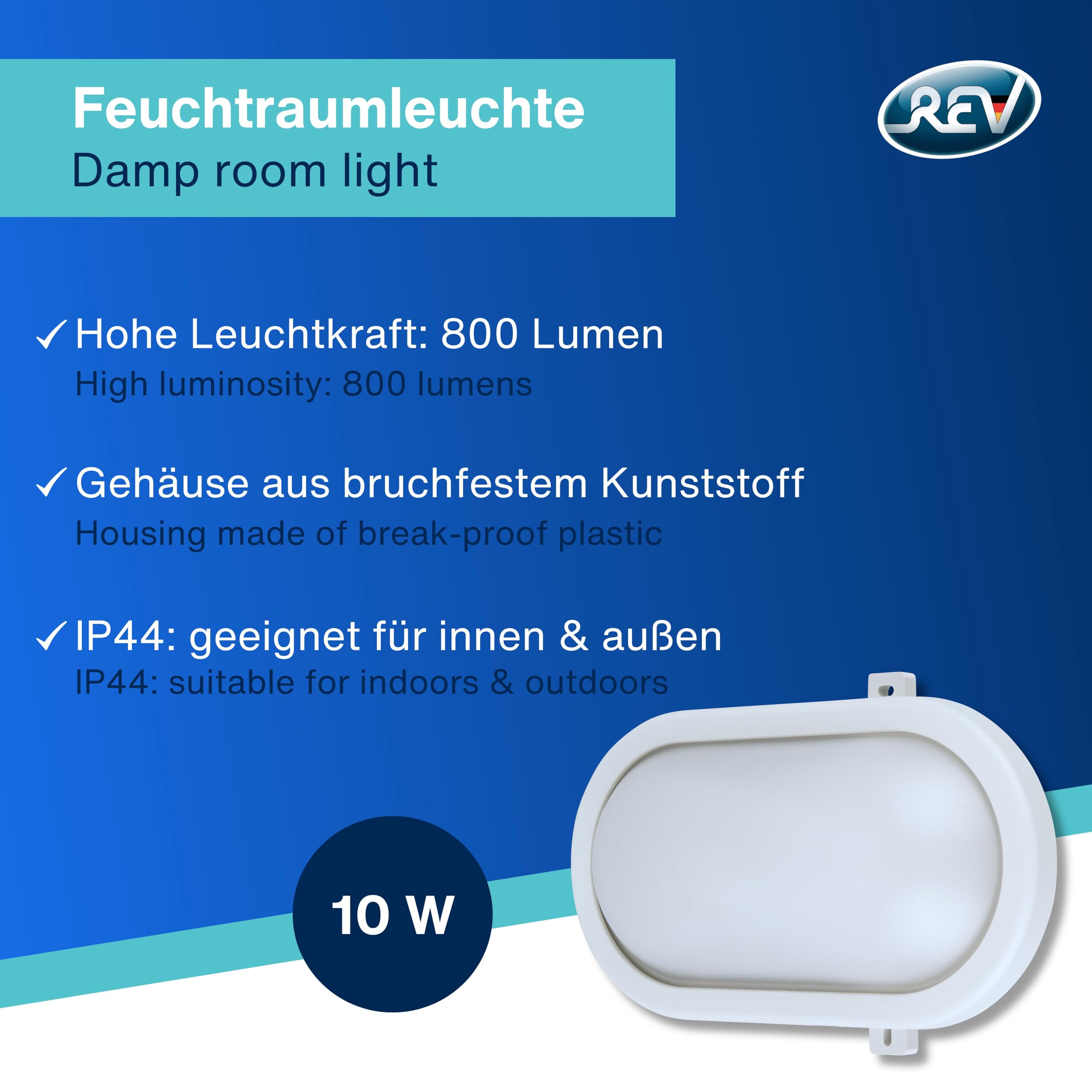 LED Feuchtraumleuchte von REV: Ovale Feuchtraumlampe aus bruchfestem Kunststoff - ideal für Keller, Garagen und geschützte Aussenbereiche. Hervorragende Lichtleistung: Ovalleuchte 10W mit 800 Lumen bei 6500 Kelvin. Der Ausstrahlungswinkel der Kellerleuchte beträgt 120° - für eine optimal ausgeleuchtete Umgebung. Flexible Installation: Einsetzbar als Wand- oder Deckenleuchte. Der Lochabstand der Wandleuchte beträgt 104 mm. Nie mehr das Leuchtmittel wechseln: Die LED der Aussenleuchte ist für eine Lebensdauer von bis zu 25.000h ausgelegt, welche bei einer durchschnittlichen Nutzung von 1h pro Tag fast ein Leben lang hält. Weitere Details: 230V~, 50Hz. Geeignet für Umgebungstemperaturen von -10°C - 35°C. Anschliessbarer Leiterquerschnitt 0,75 - 1,5 mm. Abmessungen Werkstattlampe (LxBxH): 210 x 145 x 70 mm, Gewicht: 210g.
